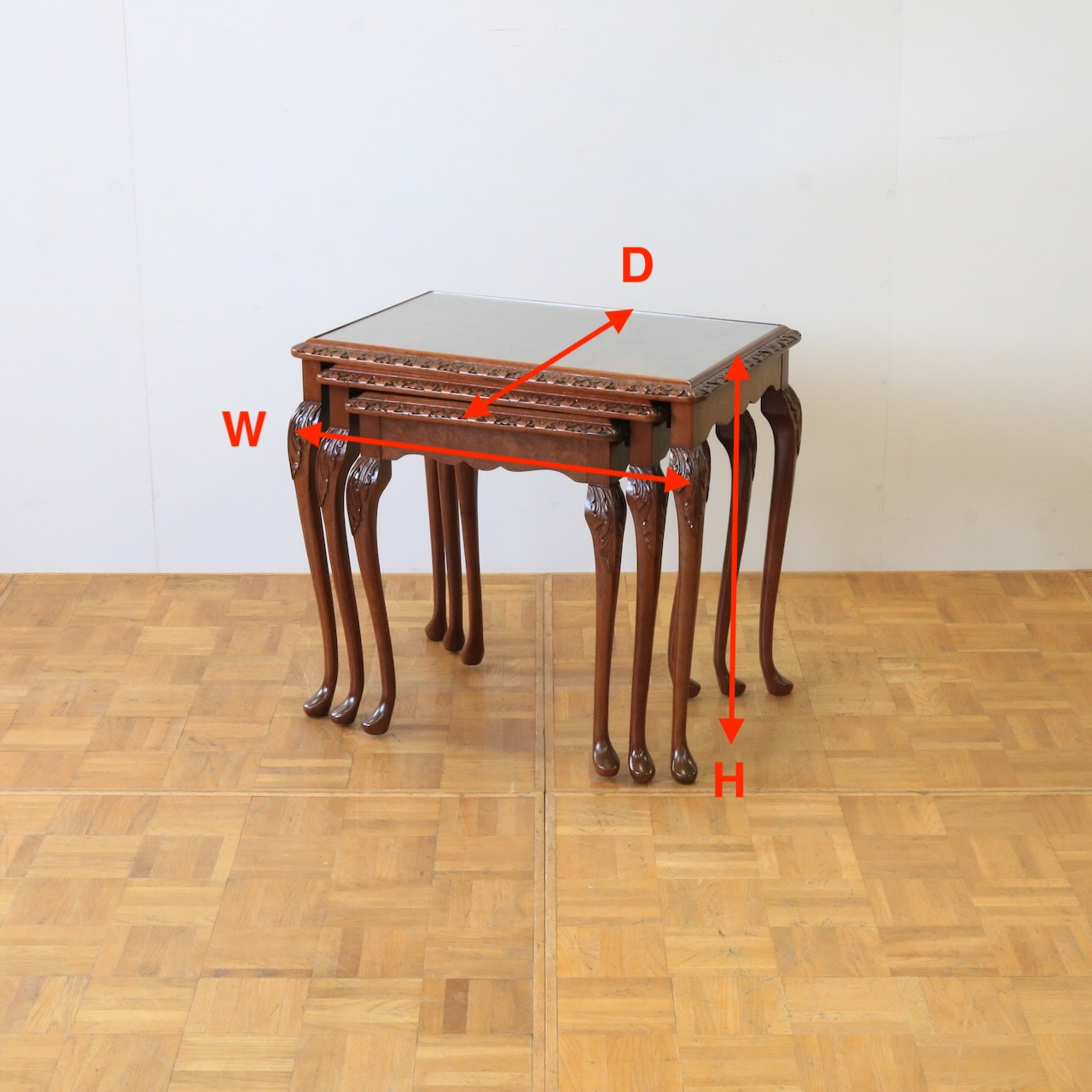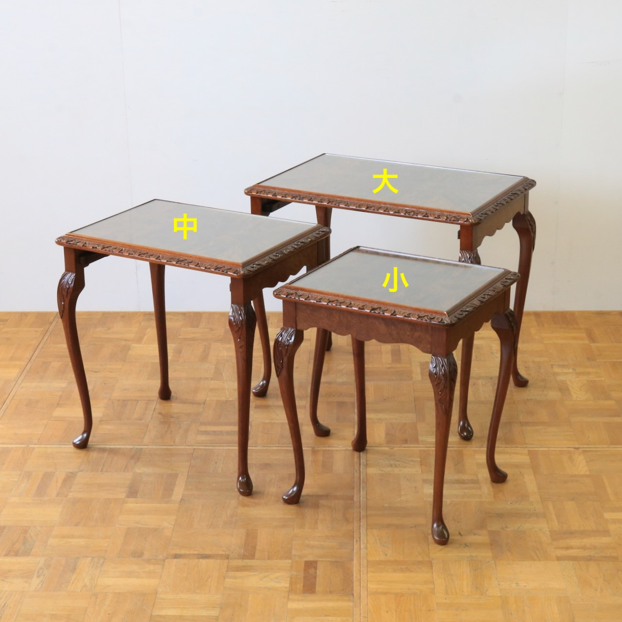 配送料の目安 ▶︎英国、ウォールナット材のネストテーブル。サイズ違いのスモールテーブルが3つでワンセットになっています。天板縁のリーフの彫刻や幕板は波型に型取られ、アカンサスが施された脚周りも美しいエレガントなデザイン。