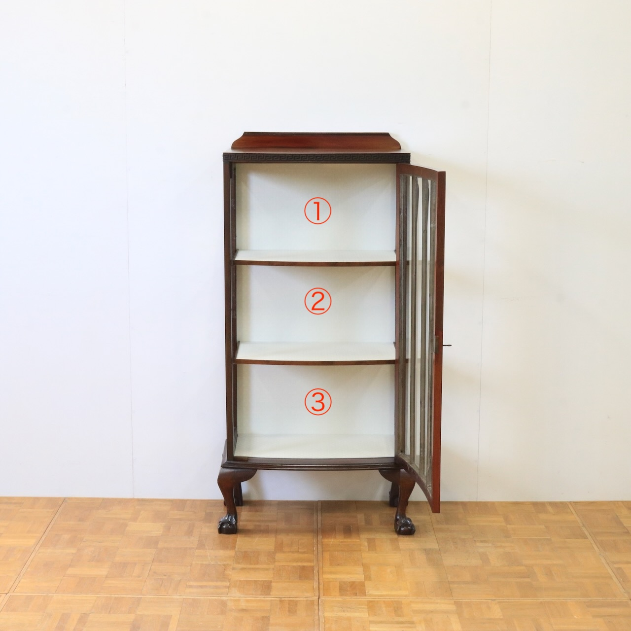配送料の目安 ▶︎1930年代、マホガニー材のグラスキャビネット。小ぶりでクセのないシルエットは様々なインテリアに馴染みやすく、天板縁のグリークキーや脚先のボールアンドクロウの意匠がクラシックな彩りを添えています。