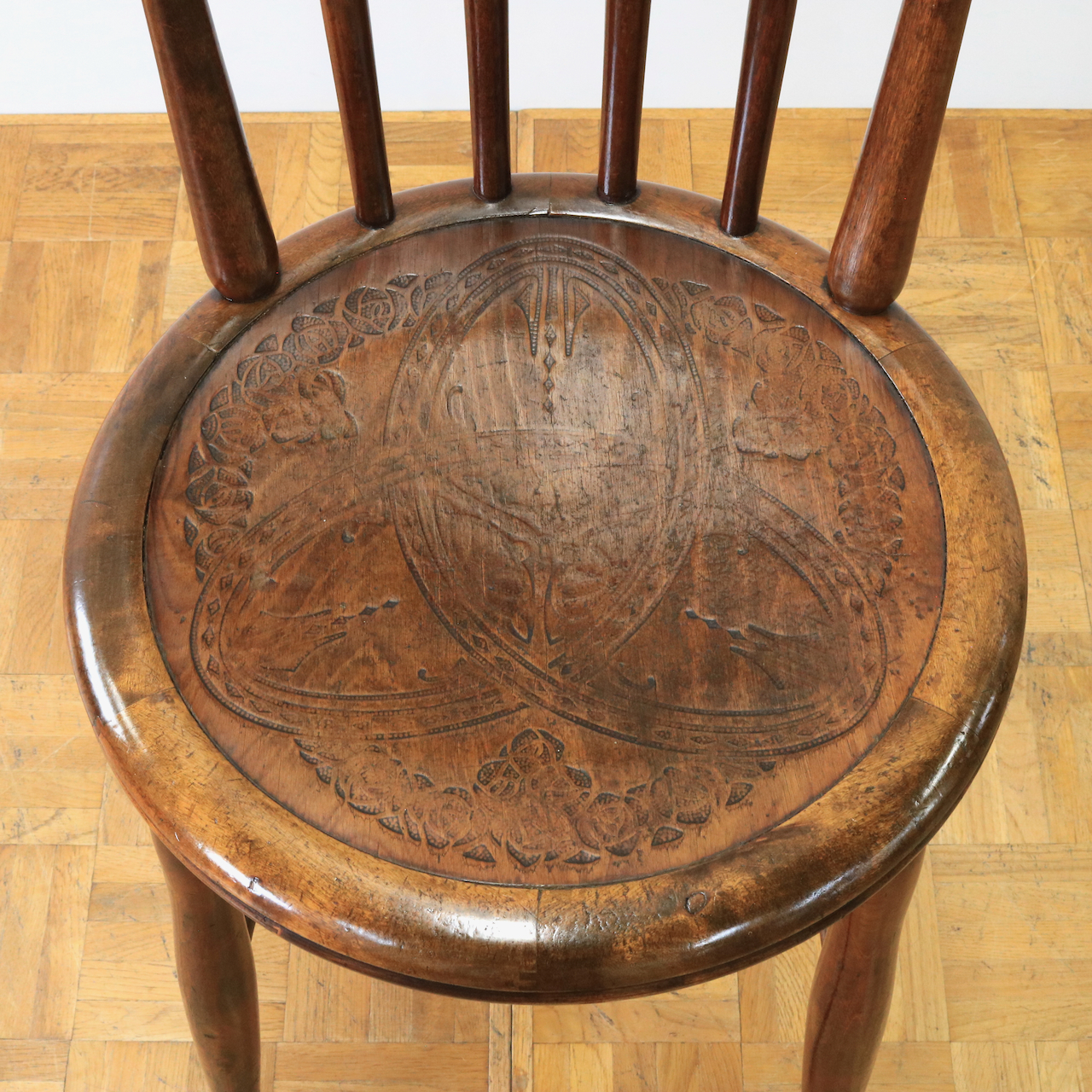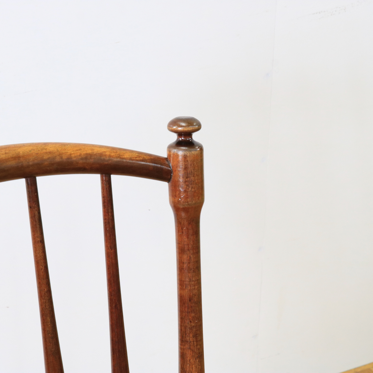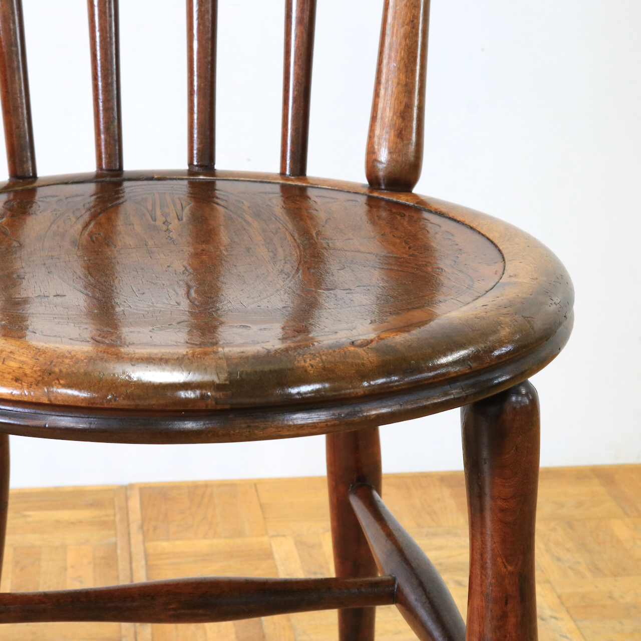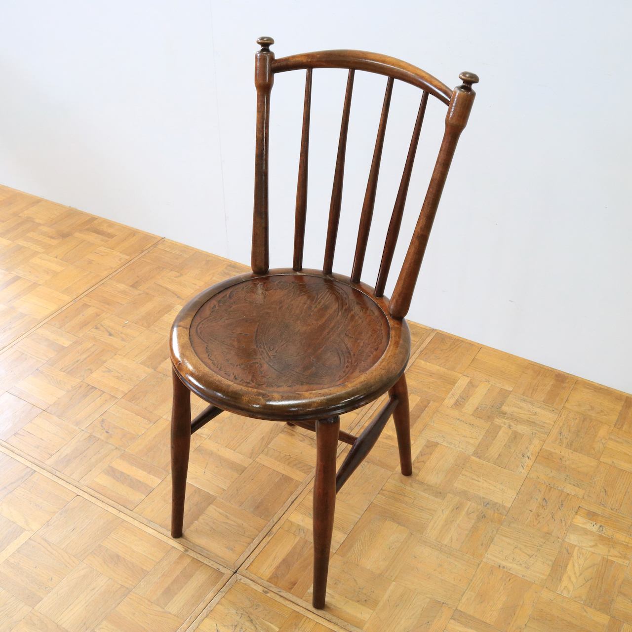 コームバックの背もたれと個性的なシートのエンボス加工が目を惹く、アンティークのベントウッドチェアーです。