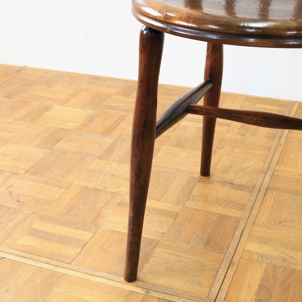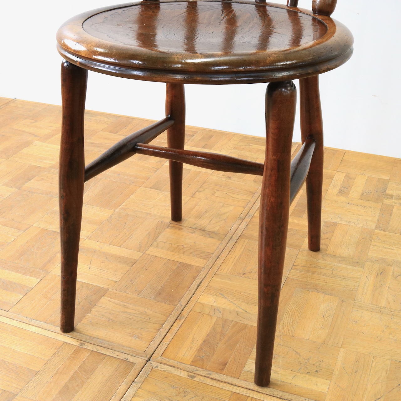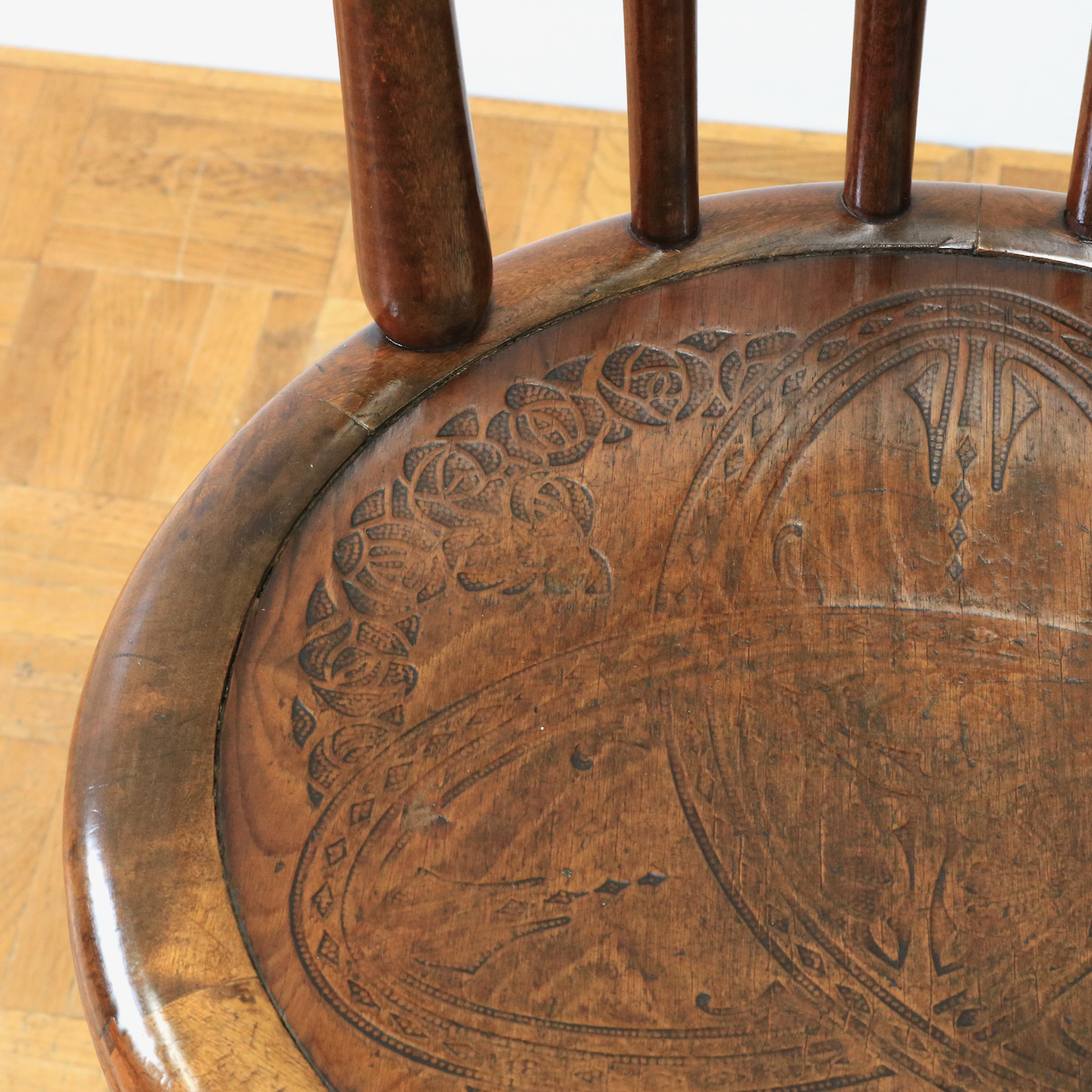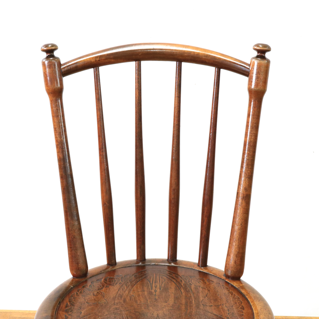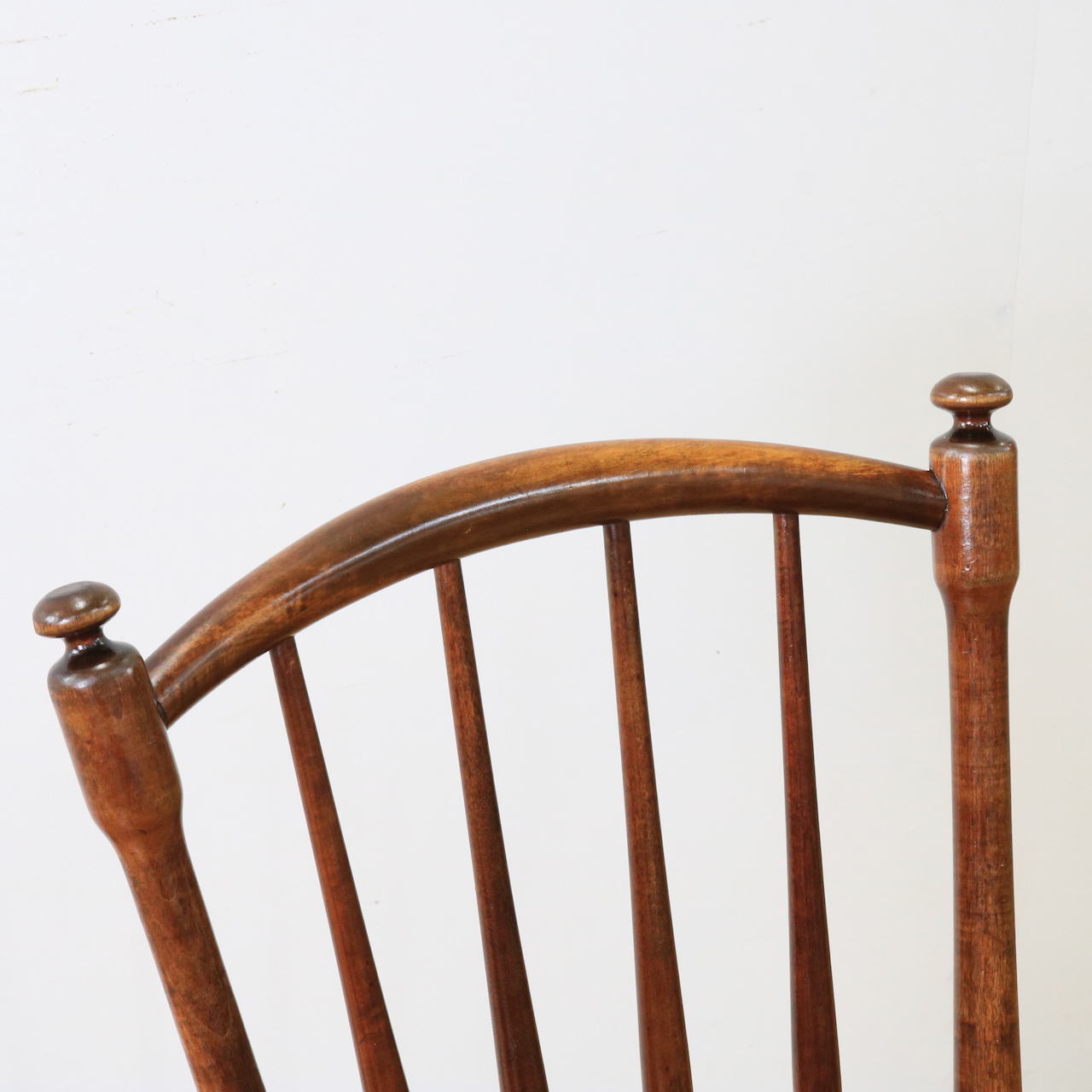 コームバックの背もたれと個性的なシートのエンボス加工が目を惹く、アンティークのベントウッドチェアーです。