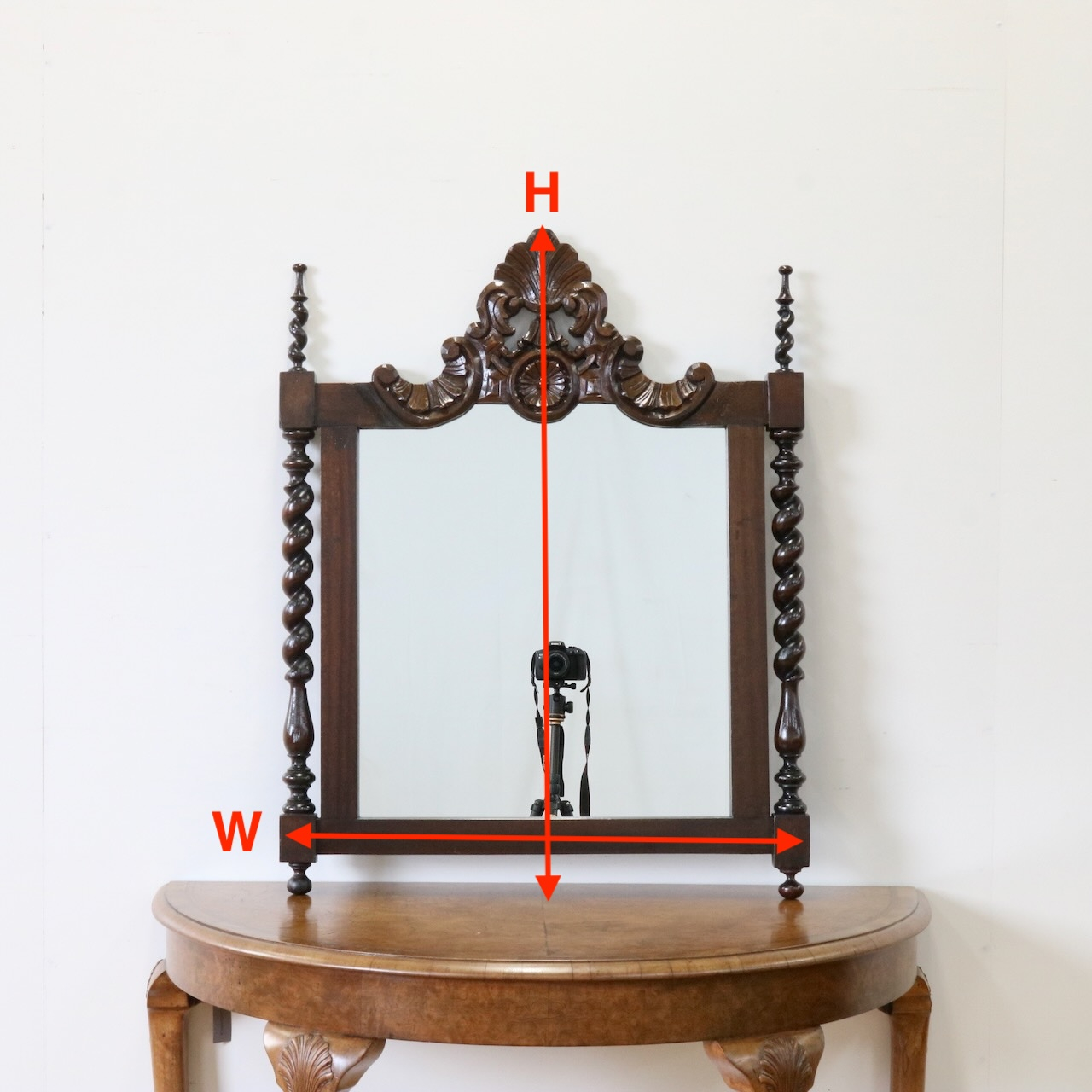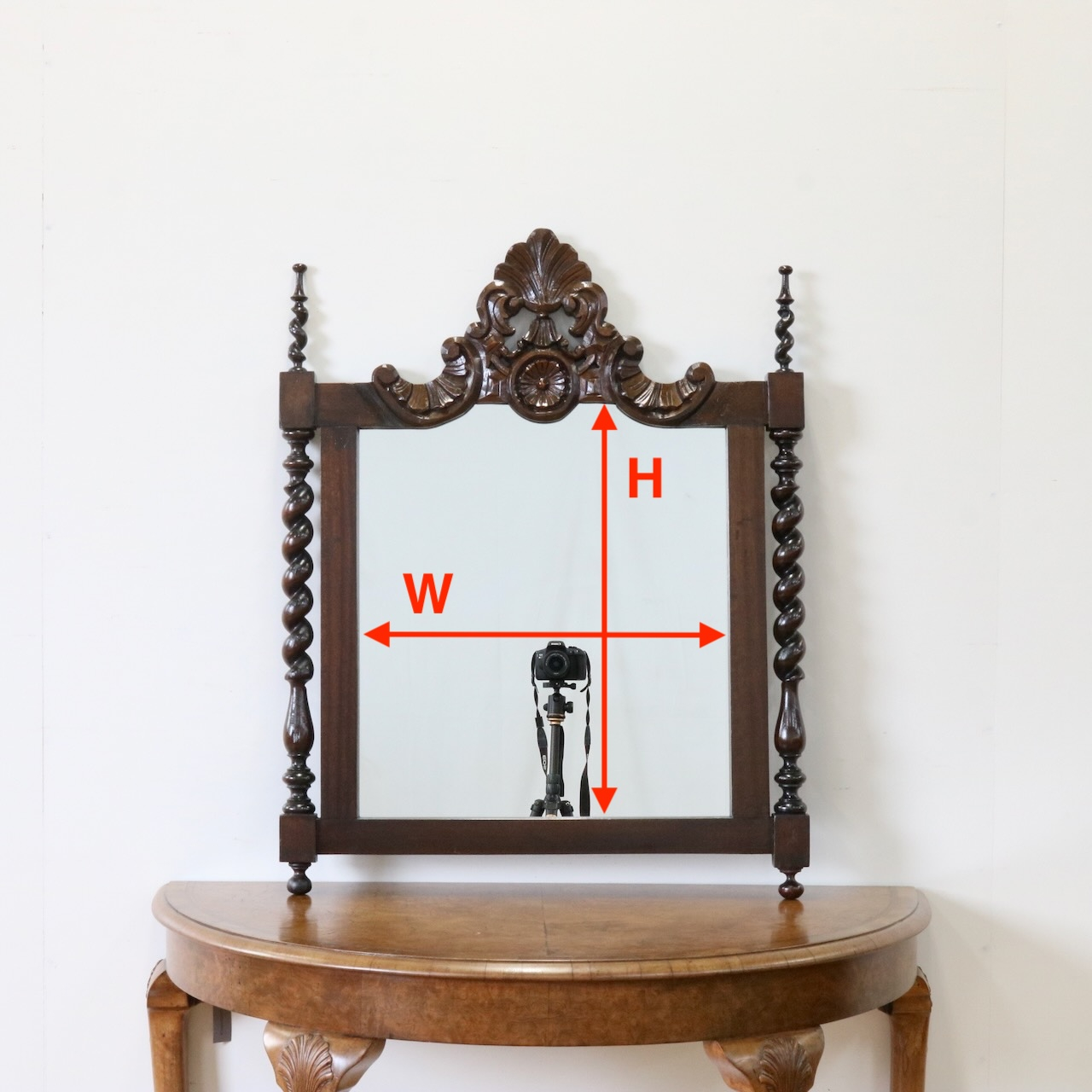 上部を飾るのは優美なアカンサスの葉を象った彫刻とその中央に配された繊細な円形の飾り、そしてフレームの両脇にはツイストが配されており、これらがこの鏡により高貴な印象を与えています。