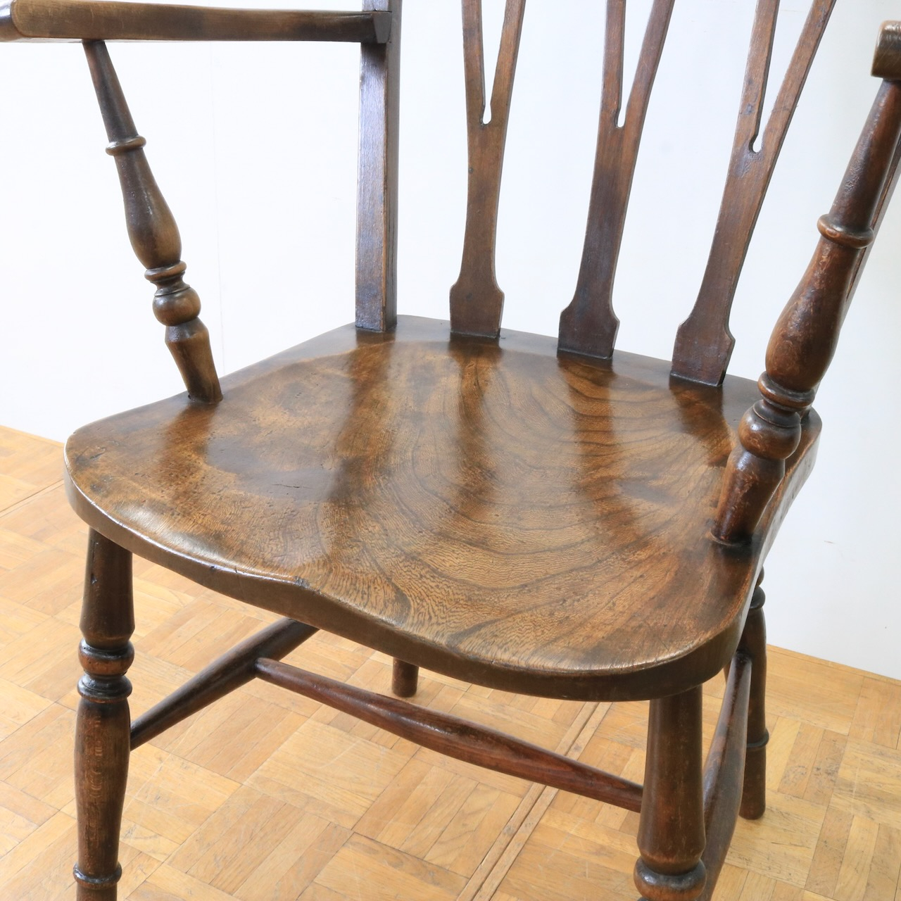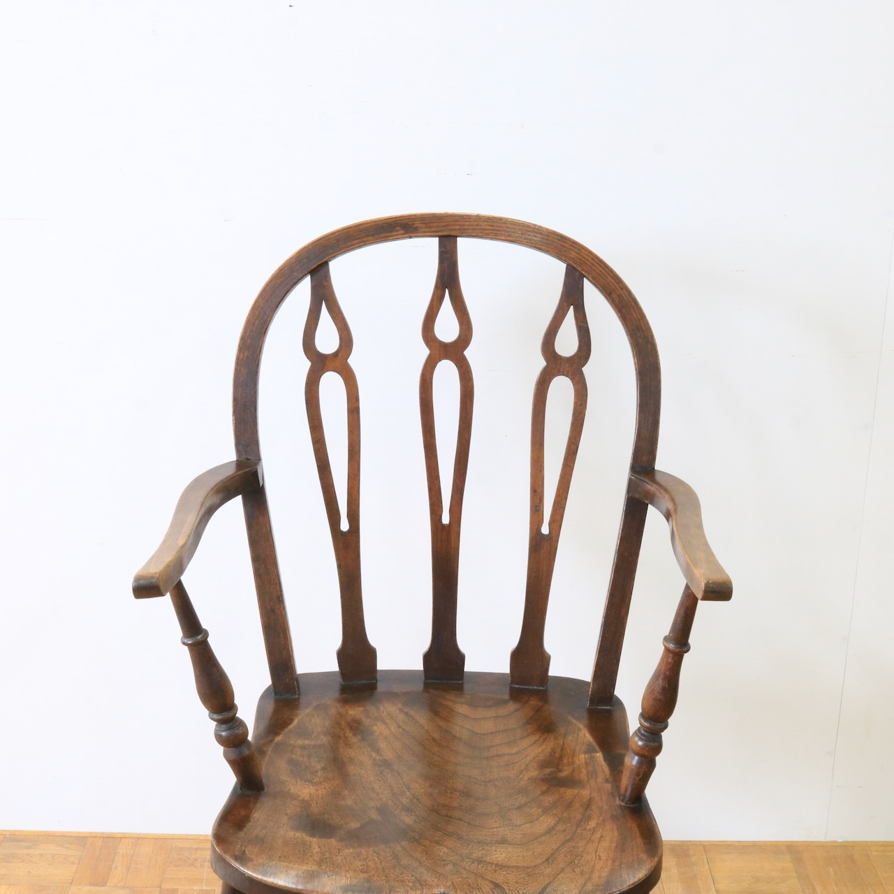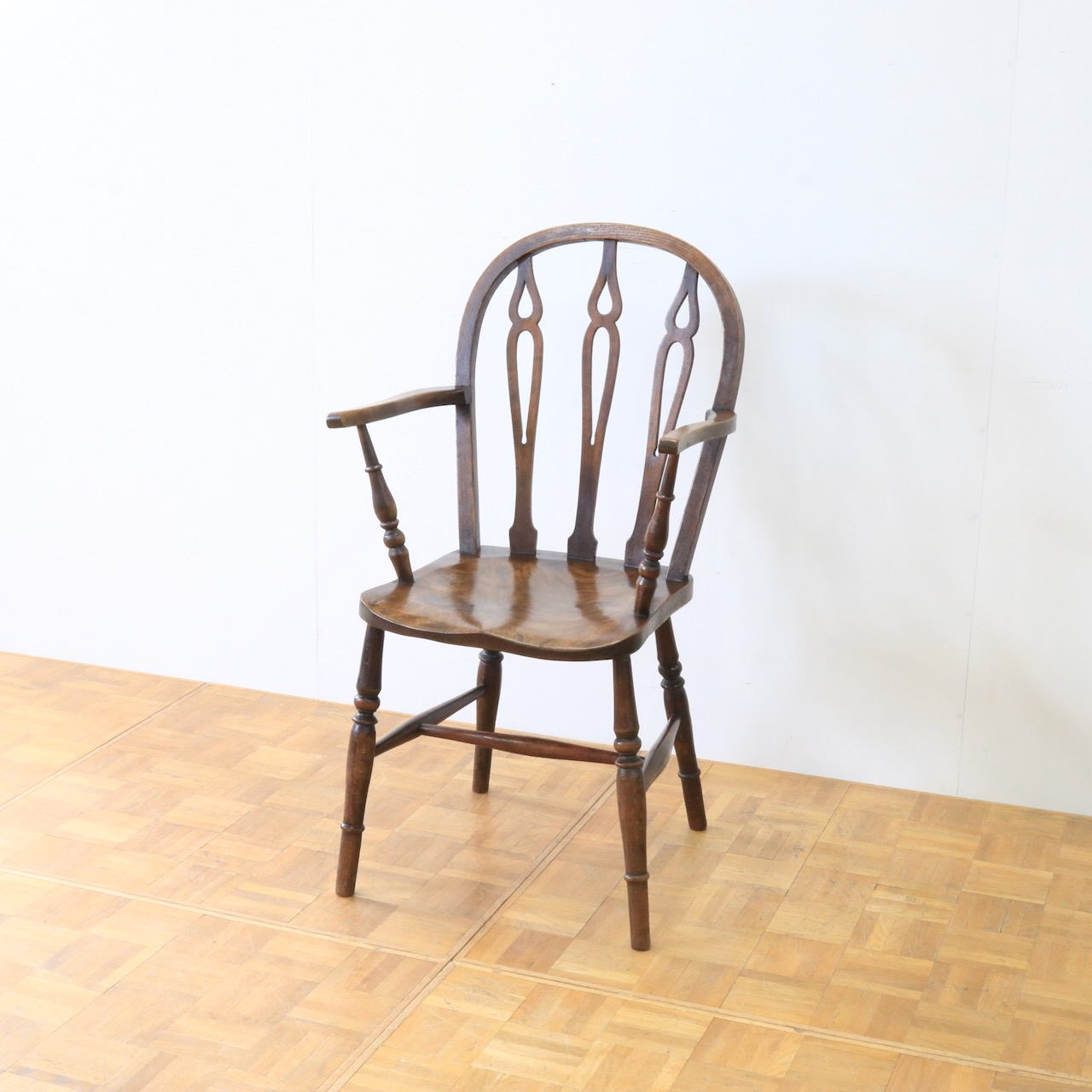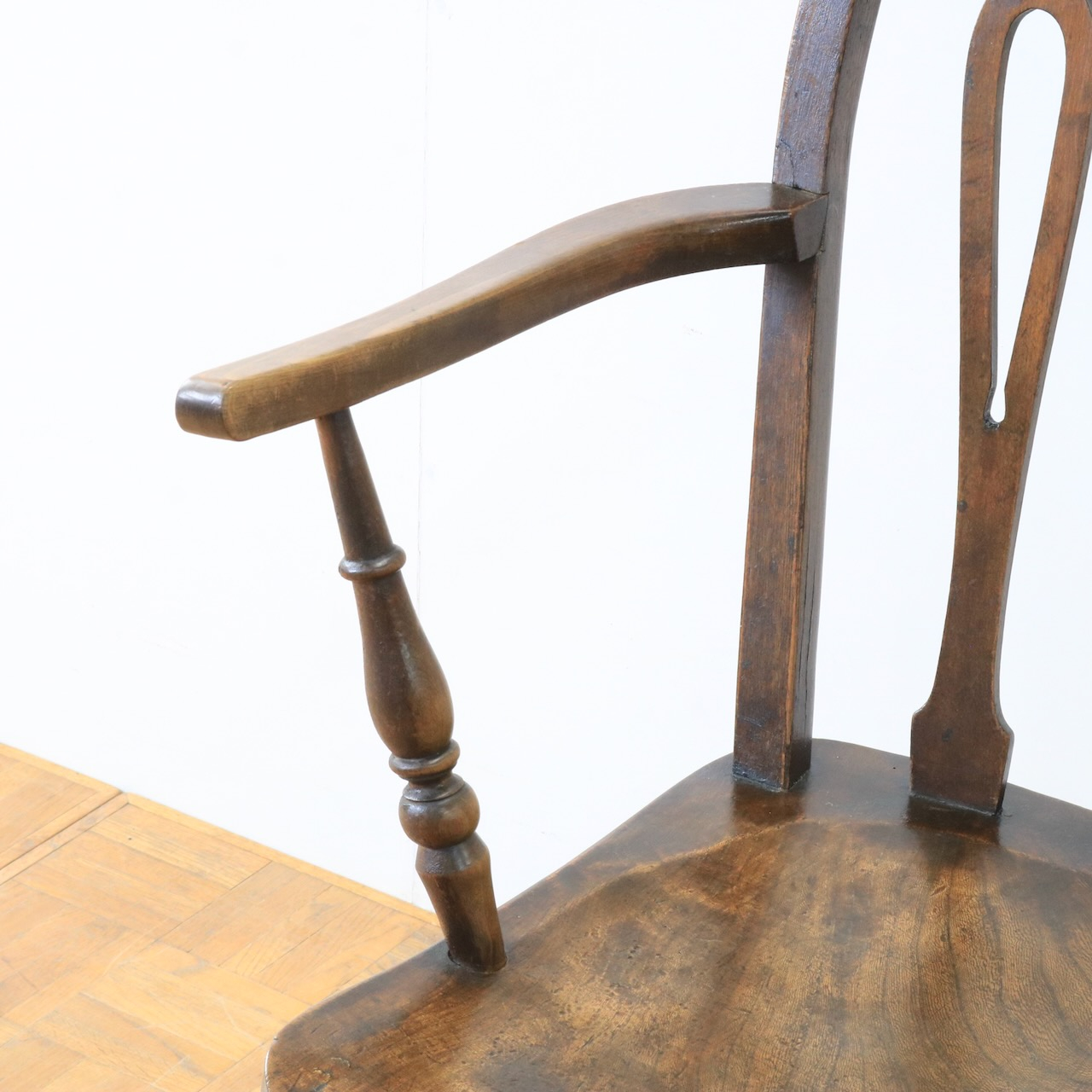 1920年代、エルム材のアームチェアー。エルム材ならではの素朴で温かみのある風合いが、ダイニングやデスク周りに落ち着いた雰囲気を添えてくれます。