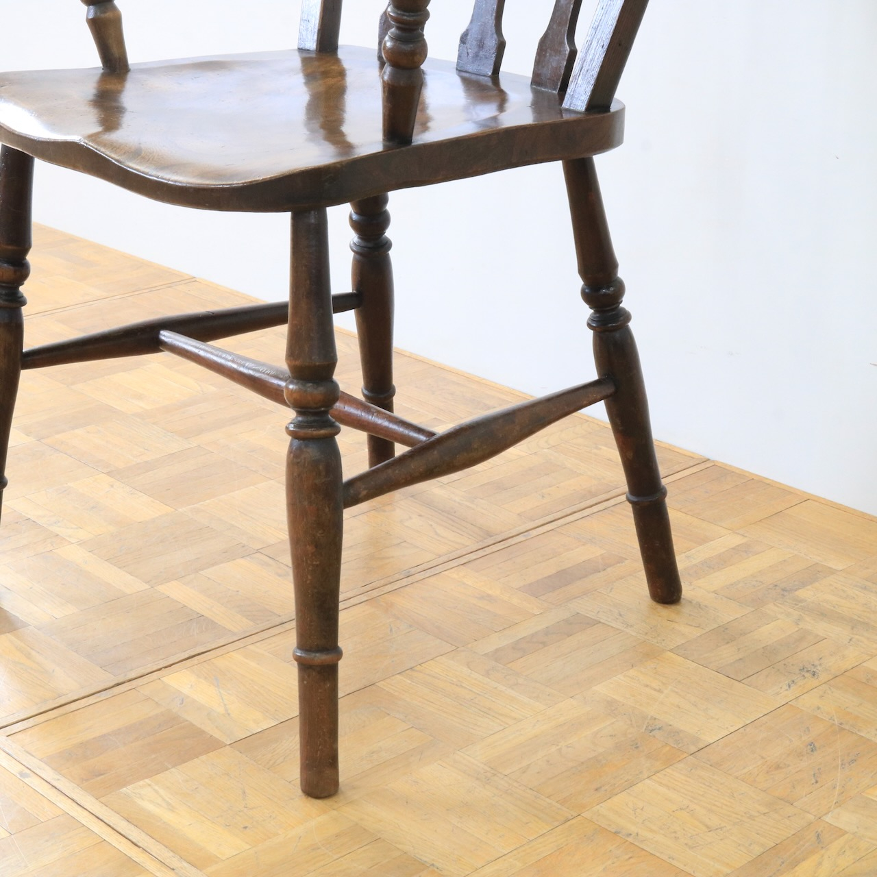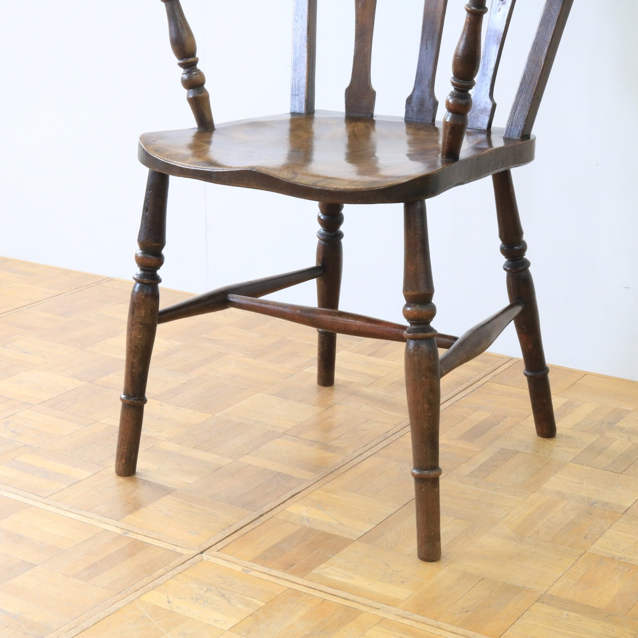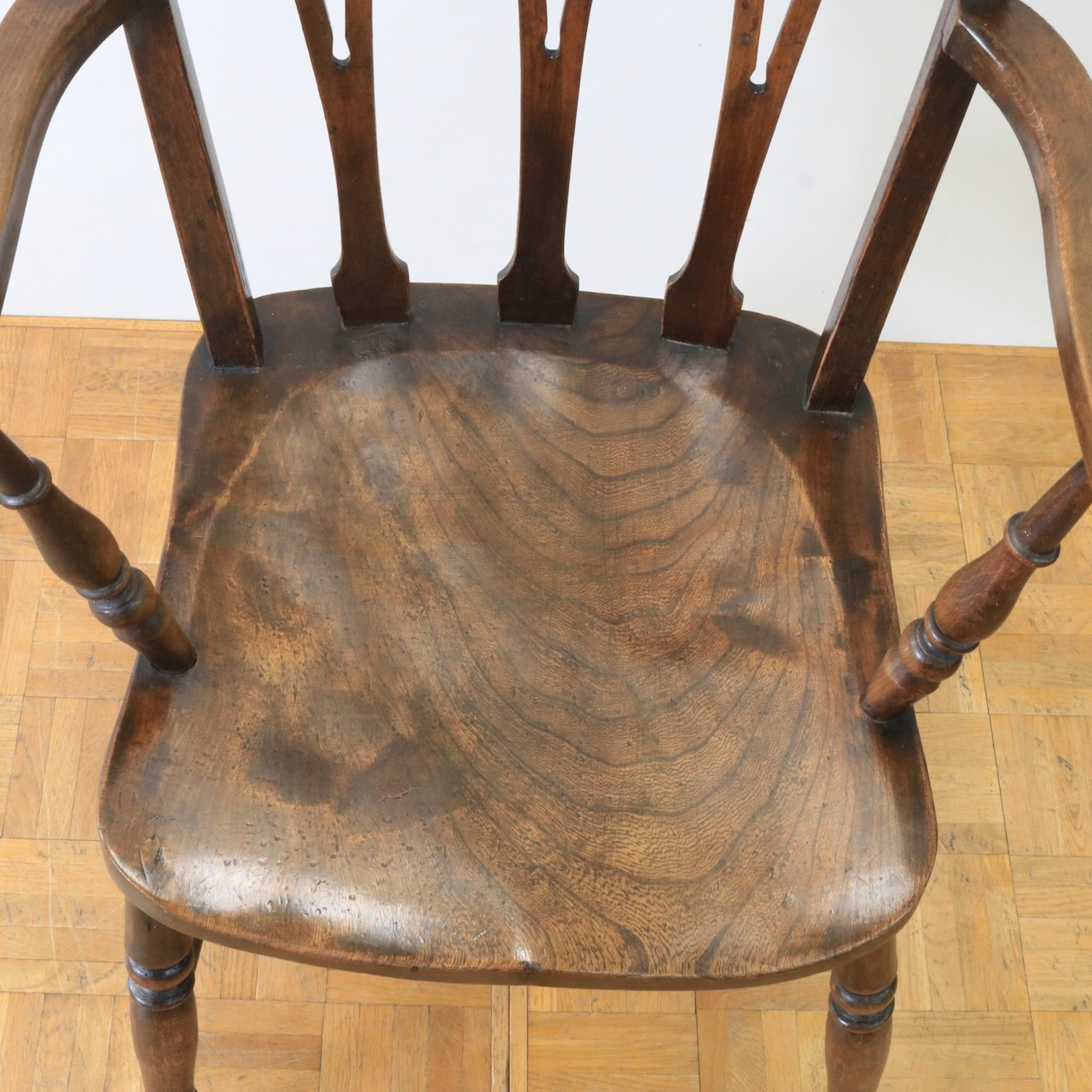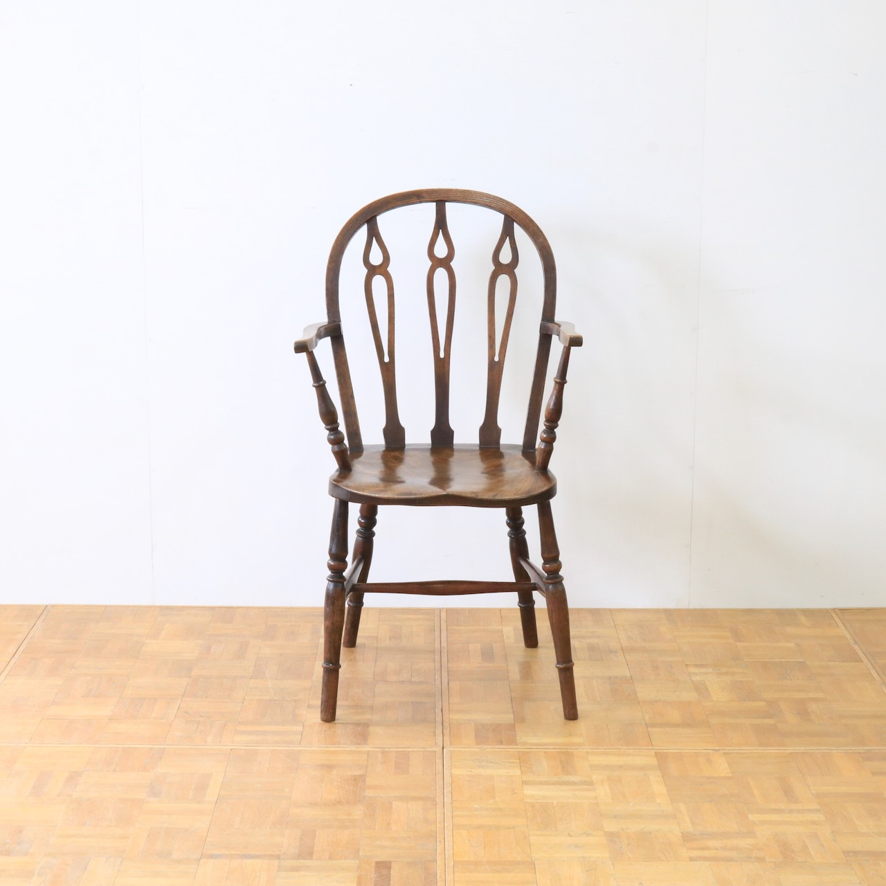 1920年代、エルム材のアームチェアー。エルム材ならではの素朴で温かみのある風合いが、ダイニングやデスク周りに落ち着いた雰囲気を添えてくれます。