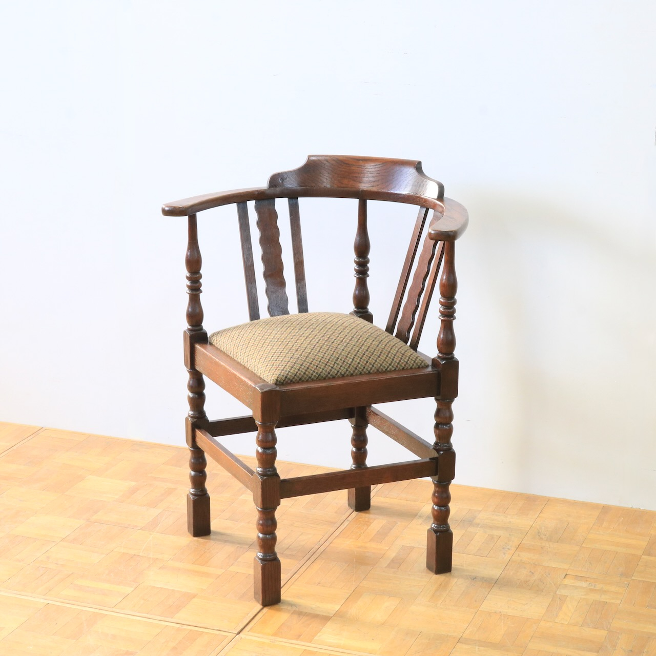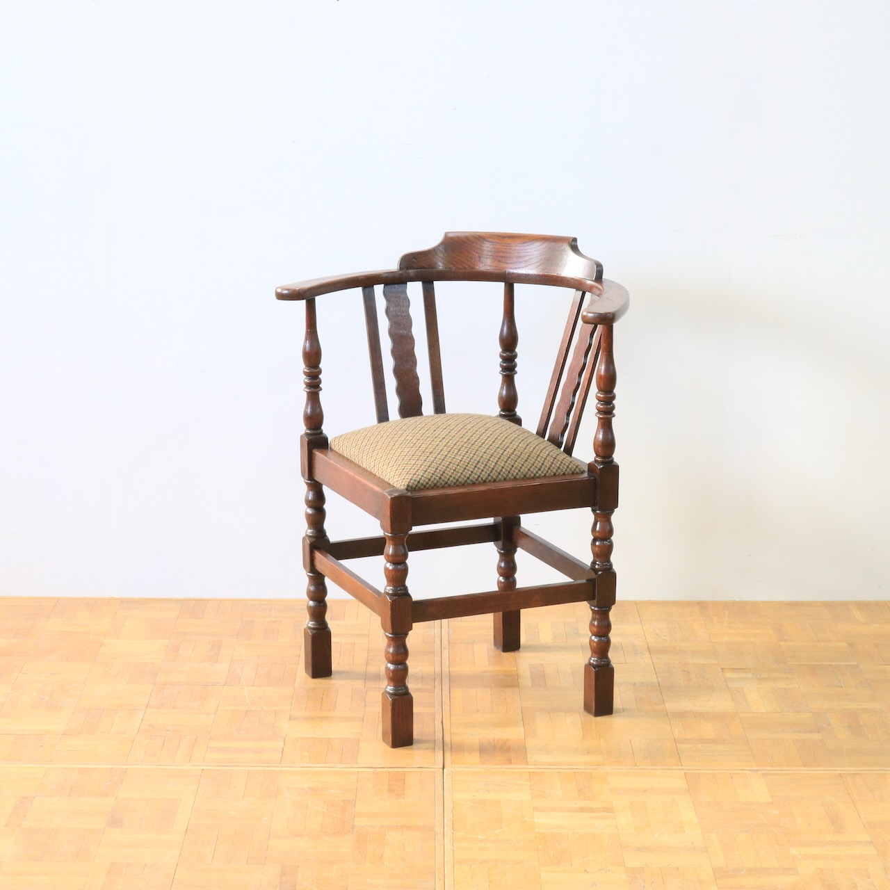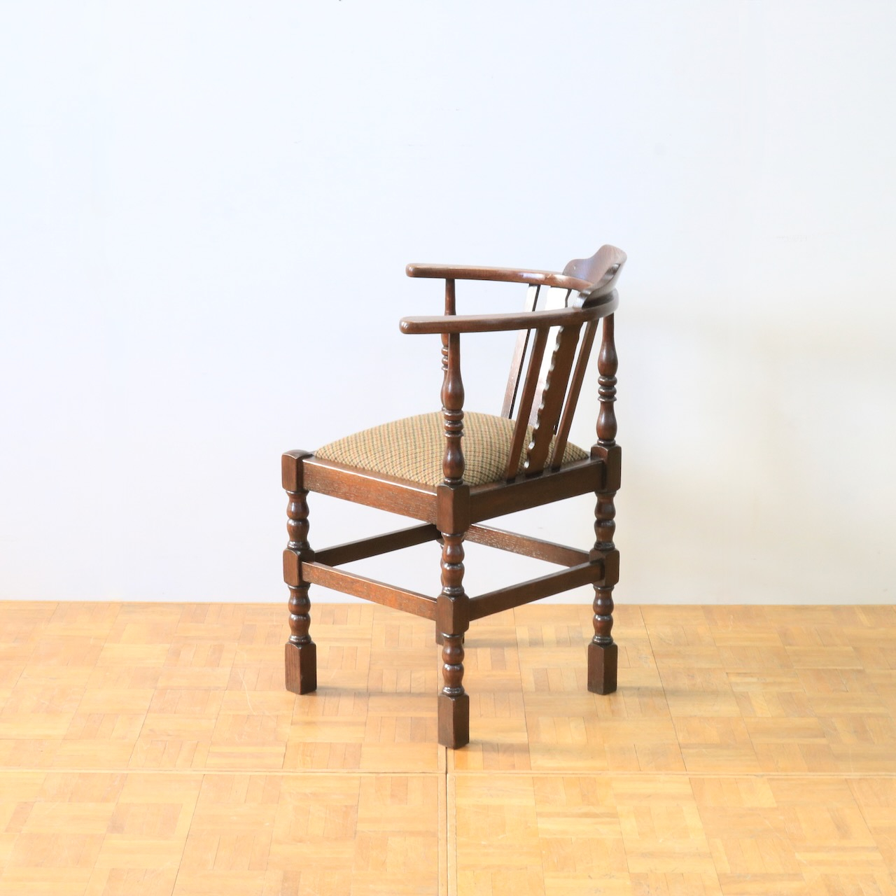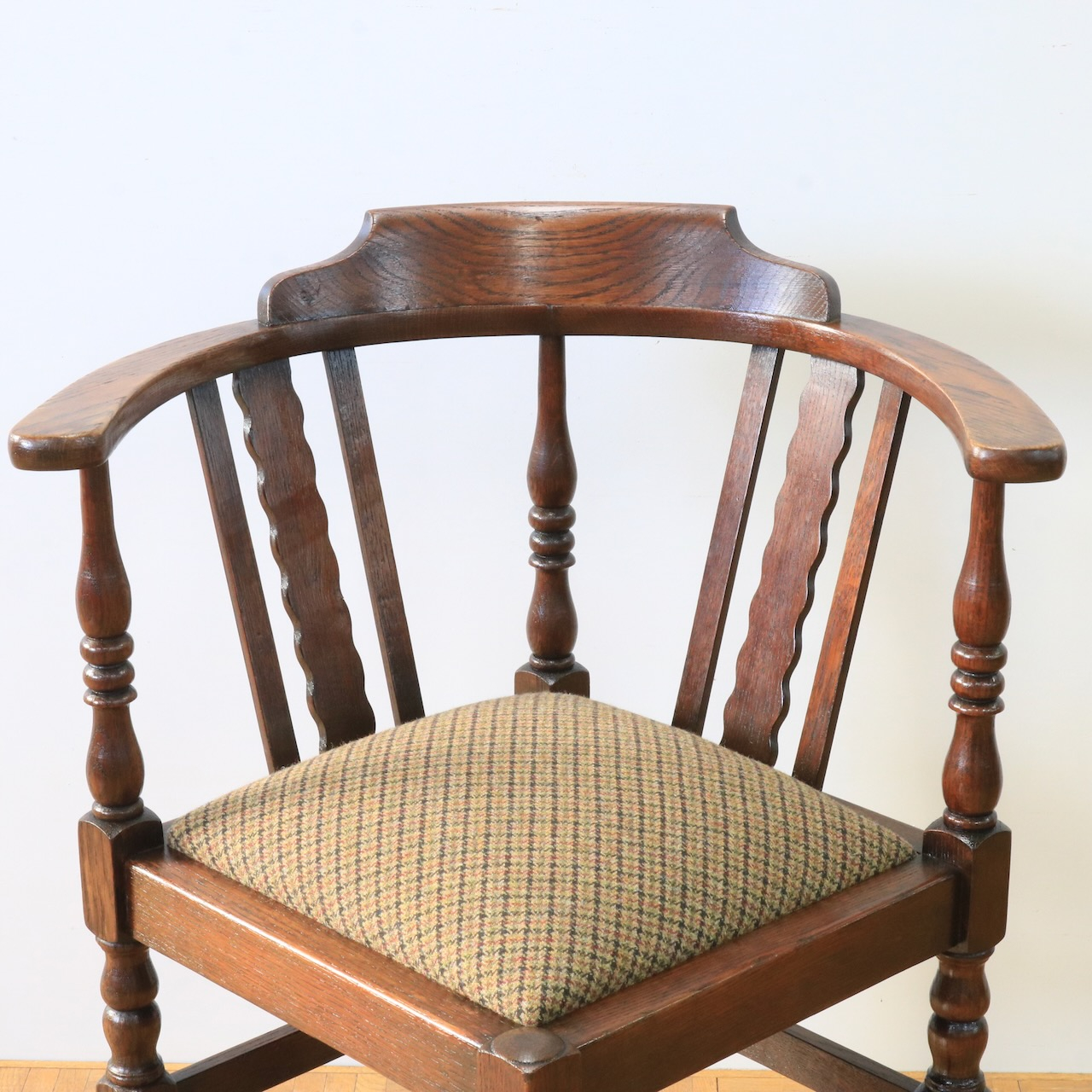 1930年代、オーク材のコーナーチェアー。お部屋の角やベッドの脇などに寄せて置くと素敵なチェアーです。柱の様に膨らんだデザインと波打つパネル状のデザインを組み合わせた背もたれがユニーク。