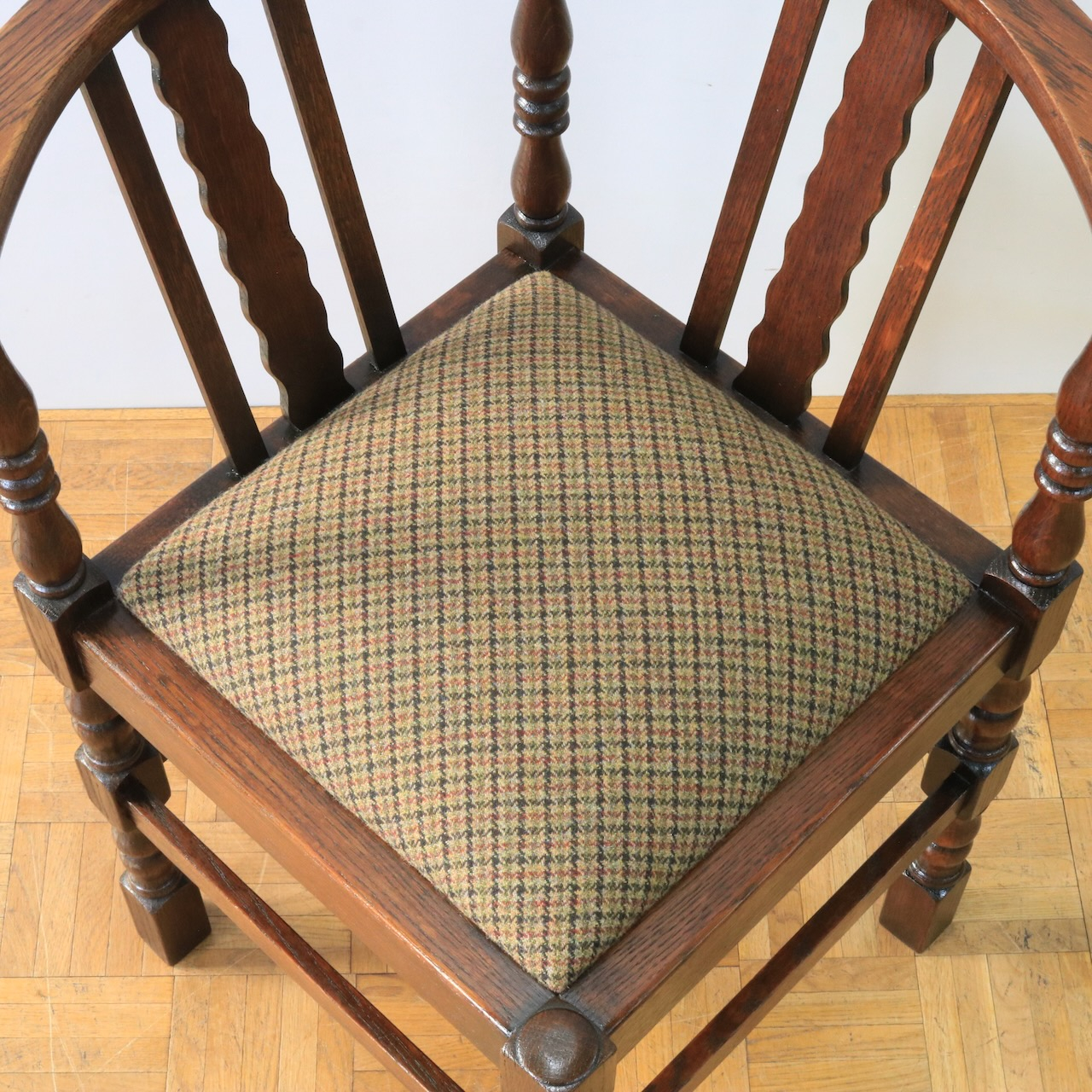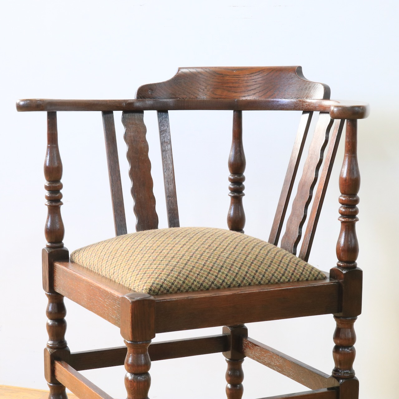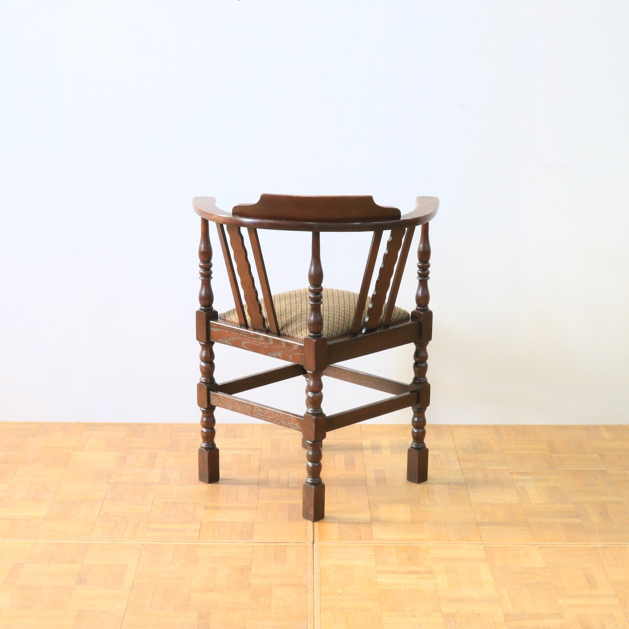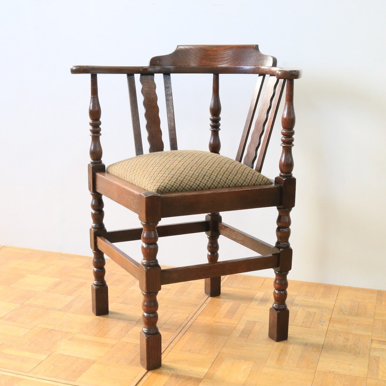 1930年代、オーク材のコーナーチェアー。お部屋の角やベッドの脇などに寄せて置くと素敵なチェアーです。柱の様に膨らんだデザインと波打つパネル状のデザインを組み合わせた背もたれがユニーク。