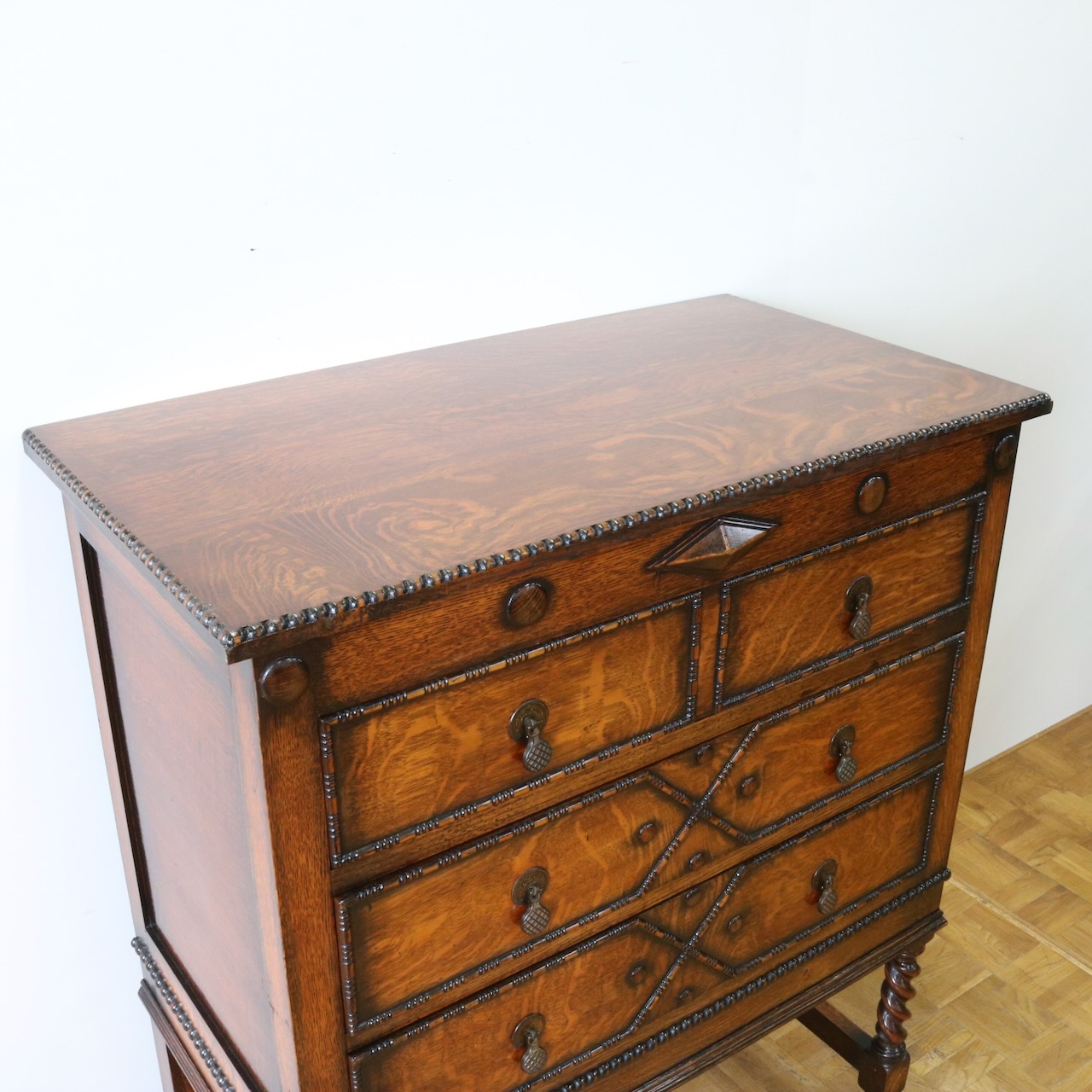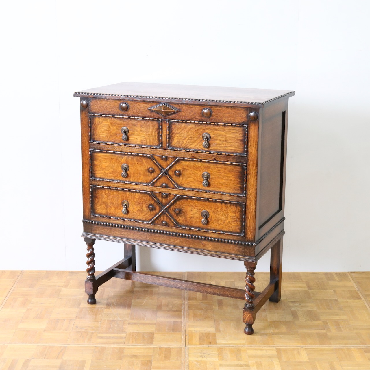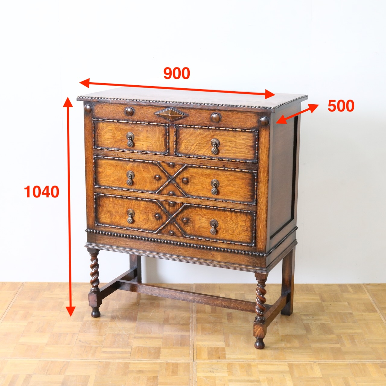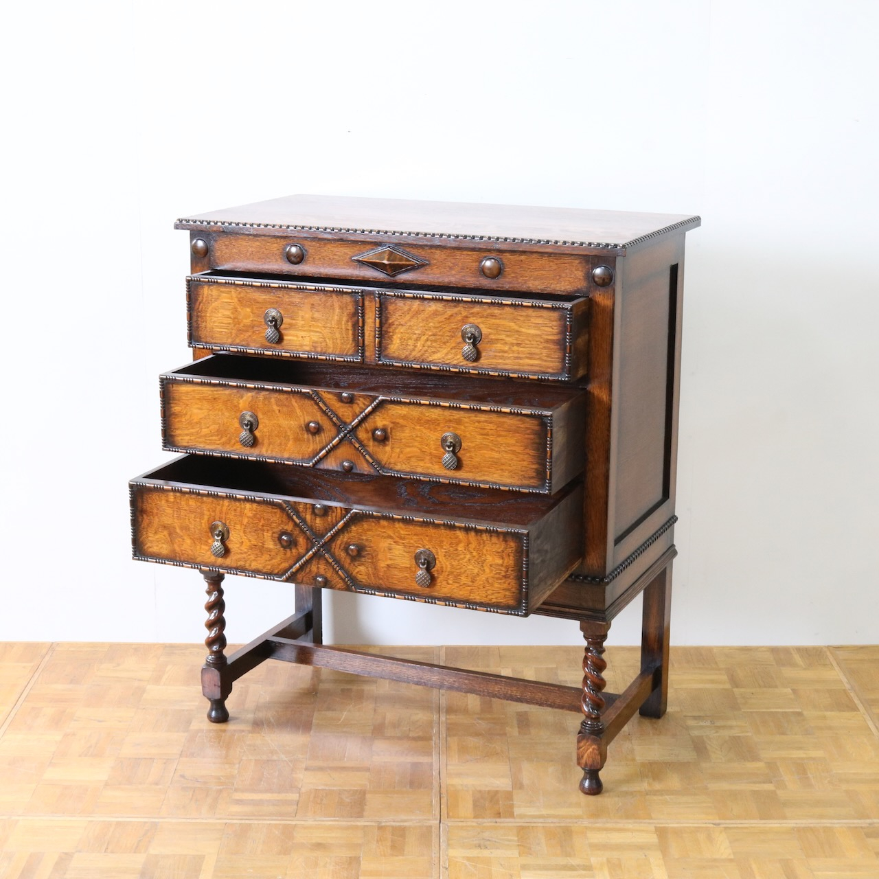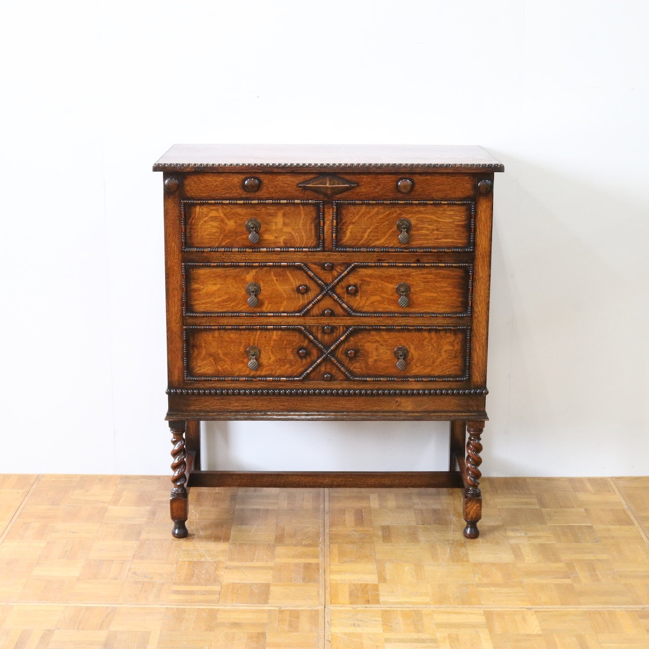1930年代、オーク材のチェストオブドロワーズ。重厚なオーク材の質感が際立つ、アンティークならではの魅力を放つ逸品です。挽物(ツイストレッグ)の脚も全体のデザインに優雅さを加えており、長い年月を経て培われた風合いがお部屋に深みを与えます。