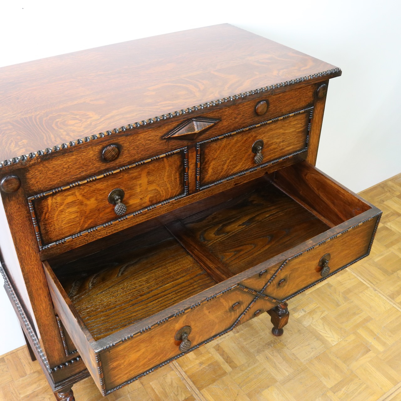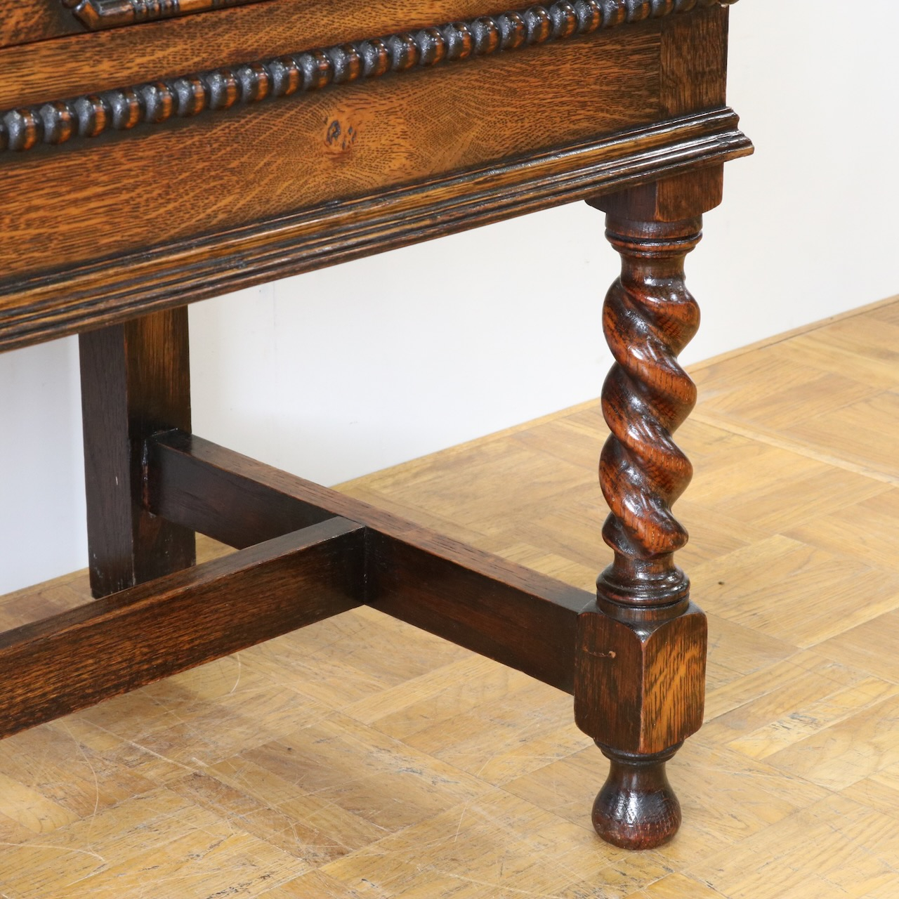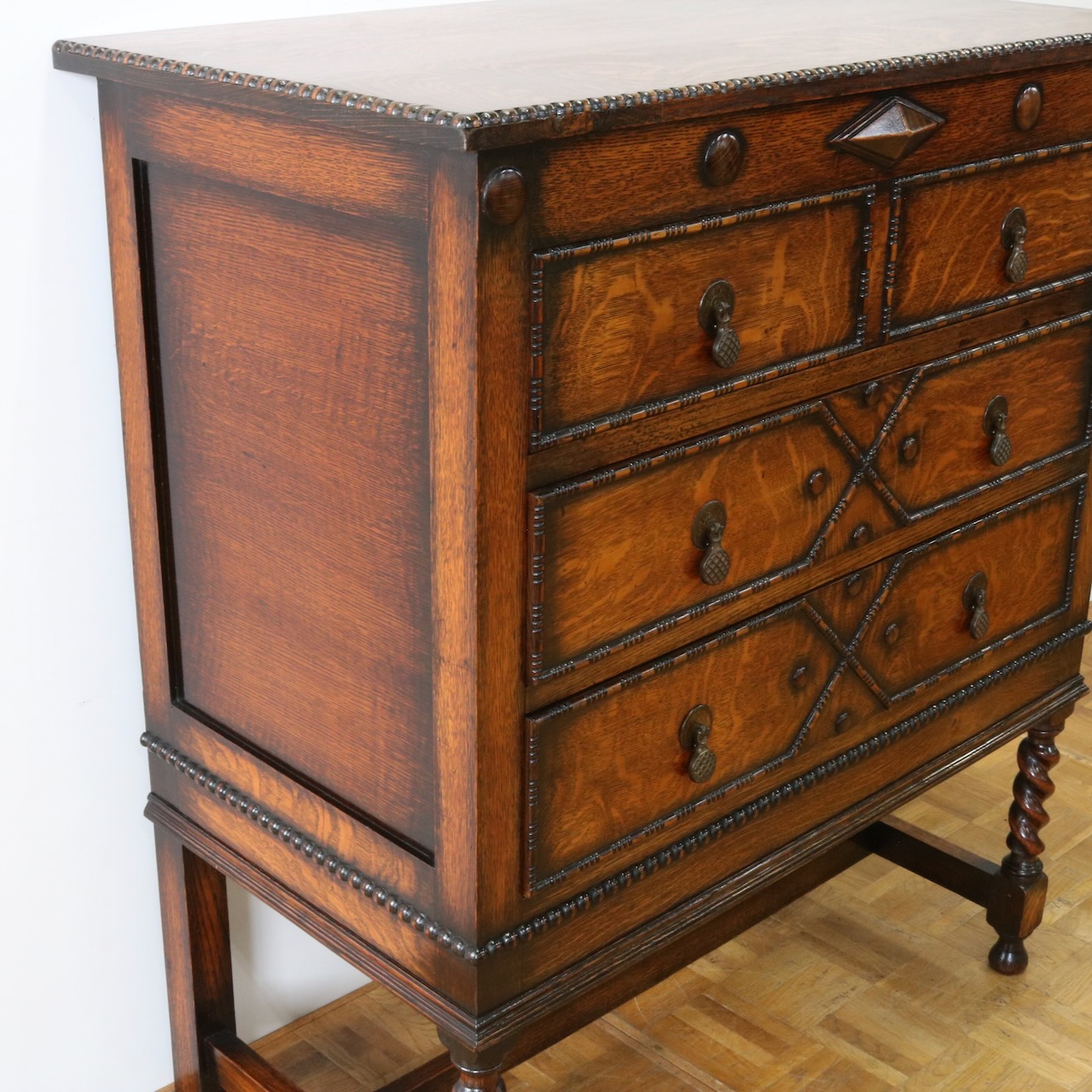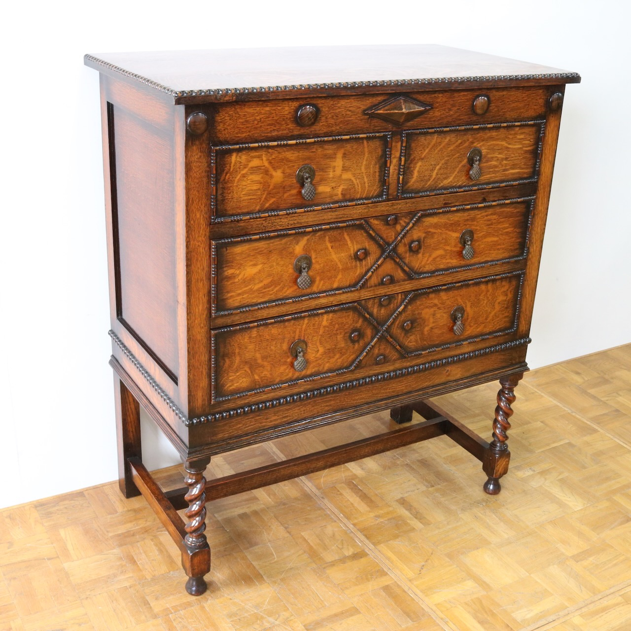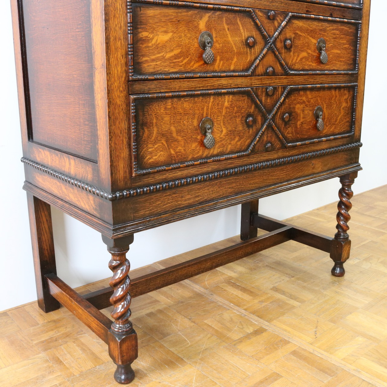 1930年代、オーク材のチェストオブドロワーズ。重厚なオーク材の質感が際立つ、アンティークならではの魅力を放つ逸品です。挽物(ツイストレッグ)の脚も全体のデザインに優雅さを加えており、長い年月を経て培われた風合いがお部屋に深みを与えます。