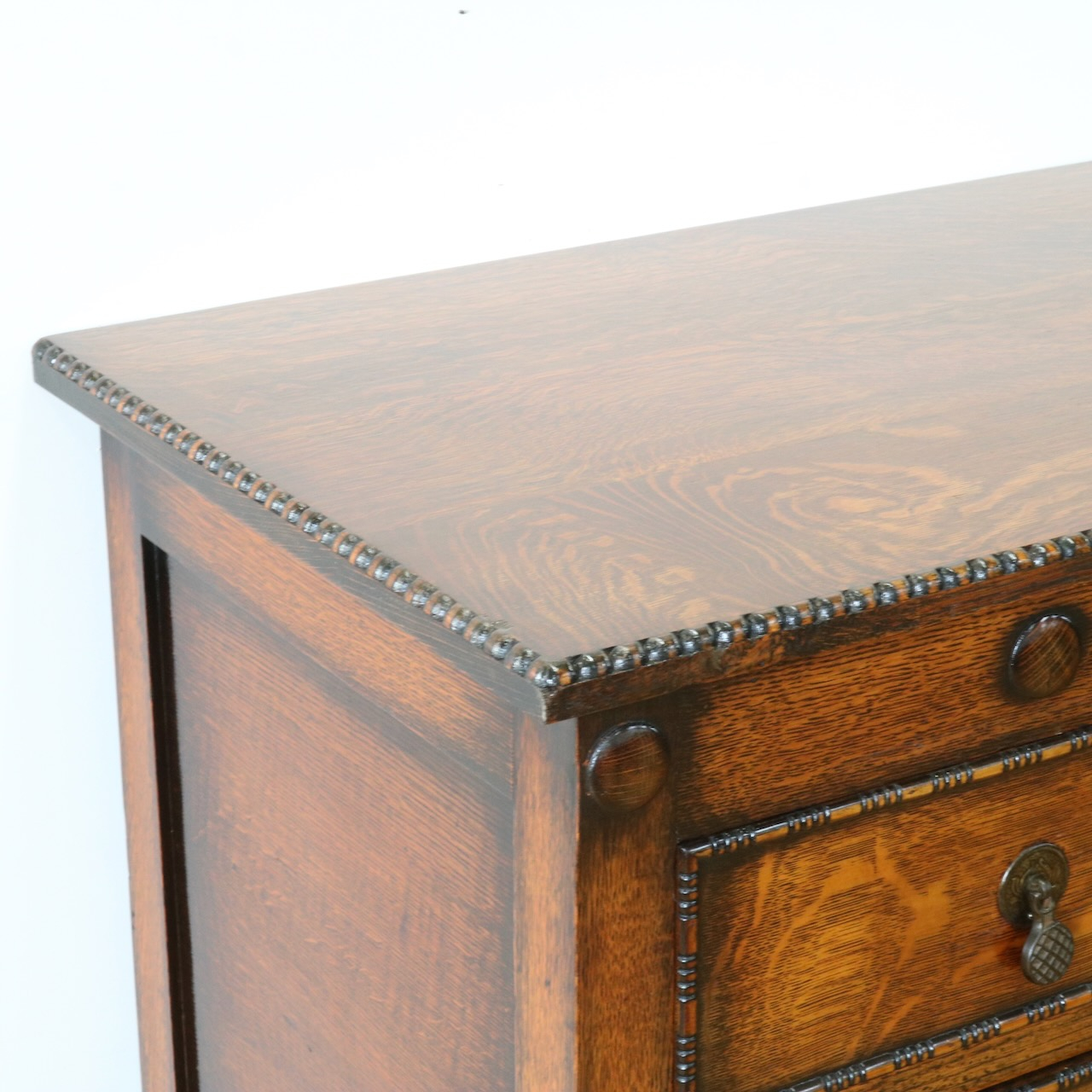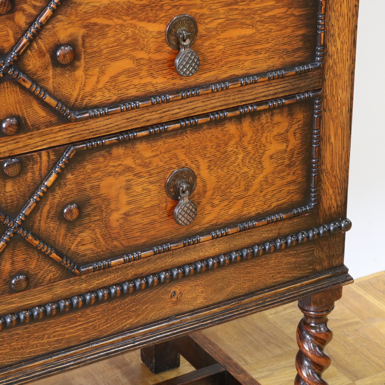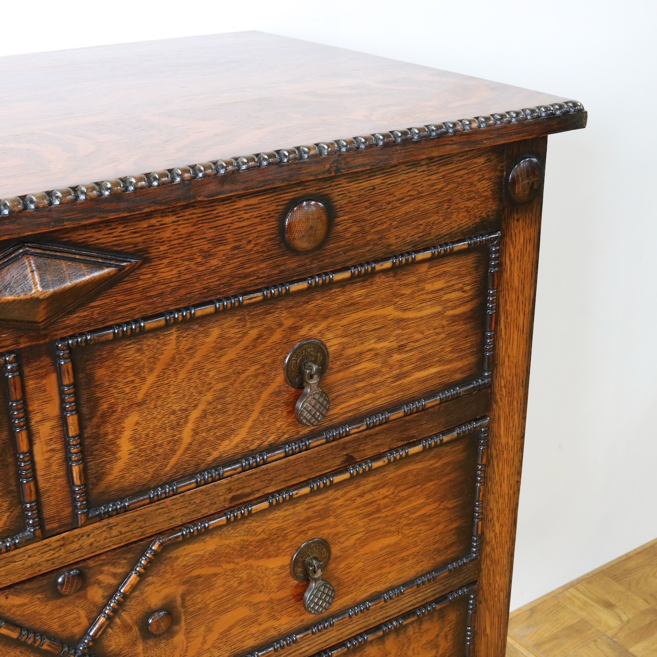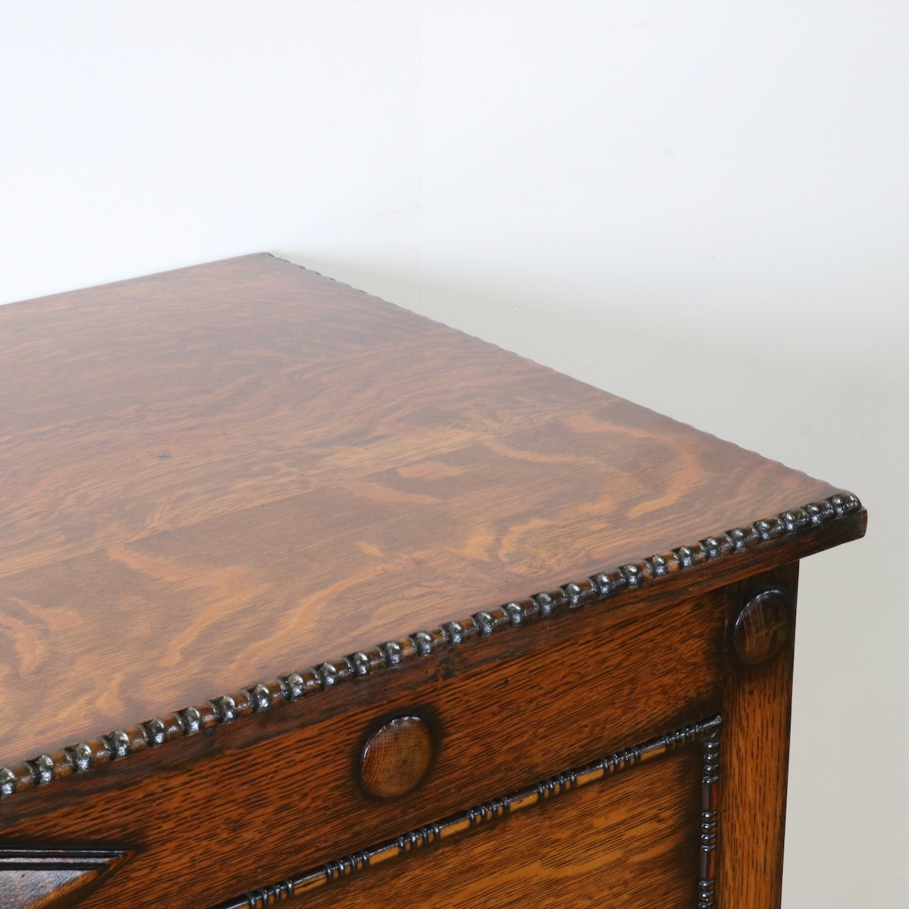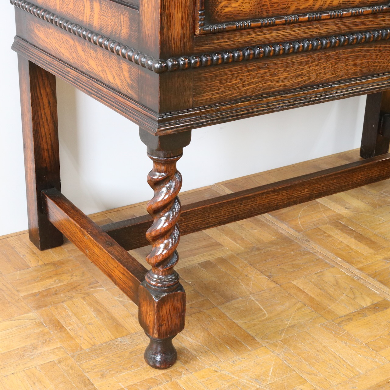 1930年代、オーク材のチェストオブドロワーズ。重厚なオーク材の質感が際立つ、アンティークならではの魅力を放つ逸品です。挽物(ツイストレッグ)の脚も全体のデザインに優雅さを加えており、長い年月を経て培われた風合いがお部屋に深みを与えます。