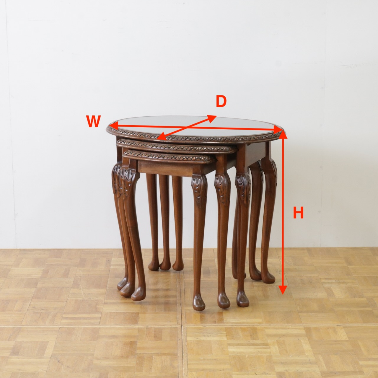 イギリス製マホガニーの入れ子式テーブル。ネストテーブルの名前の通り3台が一つにセットされた機能的なスモールテーブルです。セットインのままでも予めバラしてお部屋でお使い頂くも自由自在。天板はガラストップで水濡れをあまり気にせずお使いいただけます。