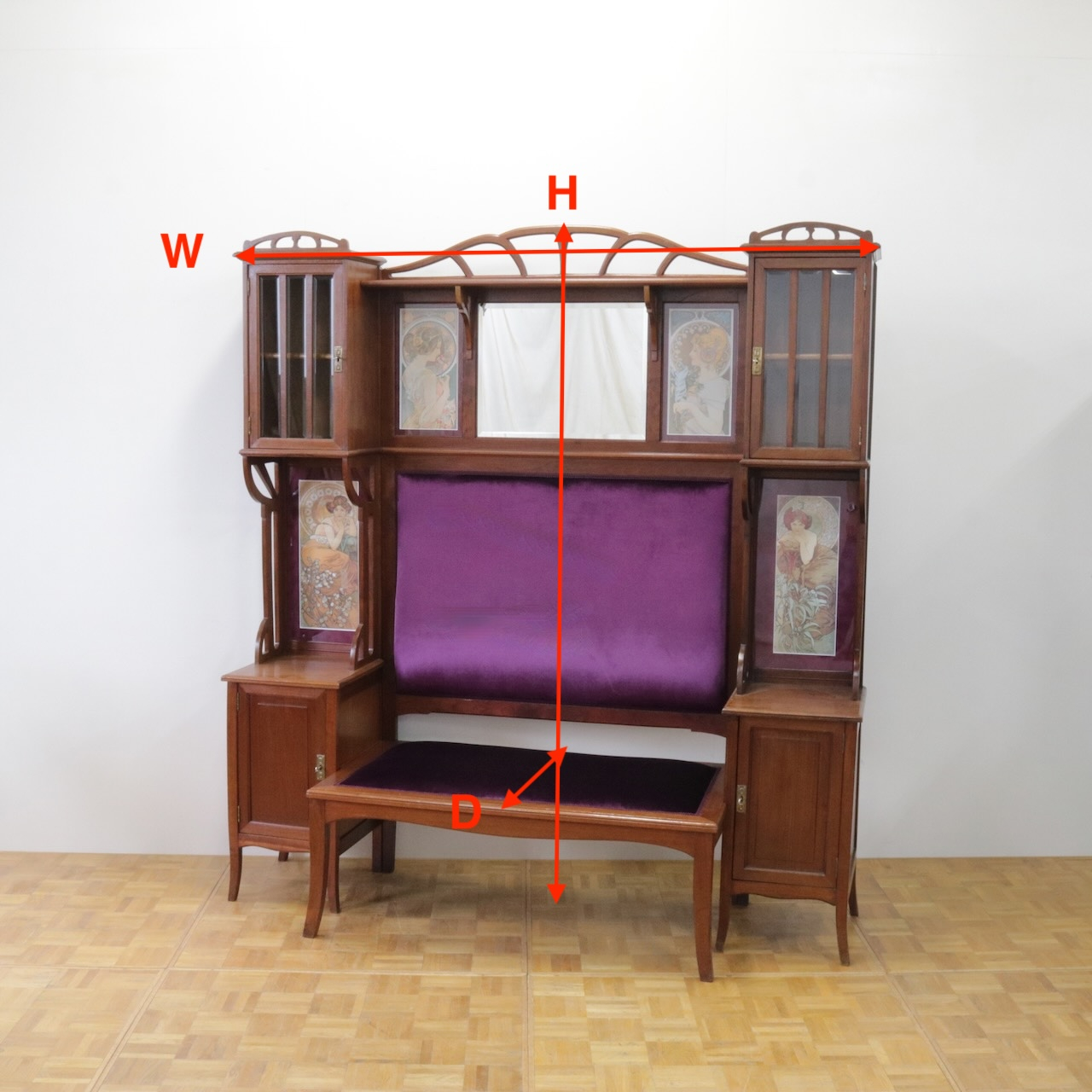 1900年代、ウォールナットのベンチ。アール・ヌーヴォーらしい曲線のアクセントが優美なデザイン。4箇所のフレームにはミュシャの絵が嵌め込まれ、待合スペースを華やかに演出します。