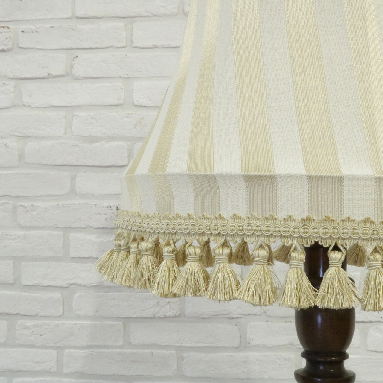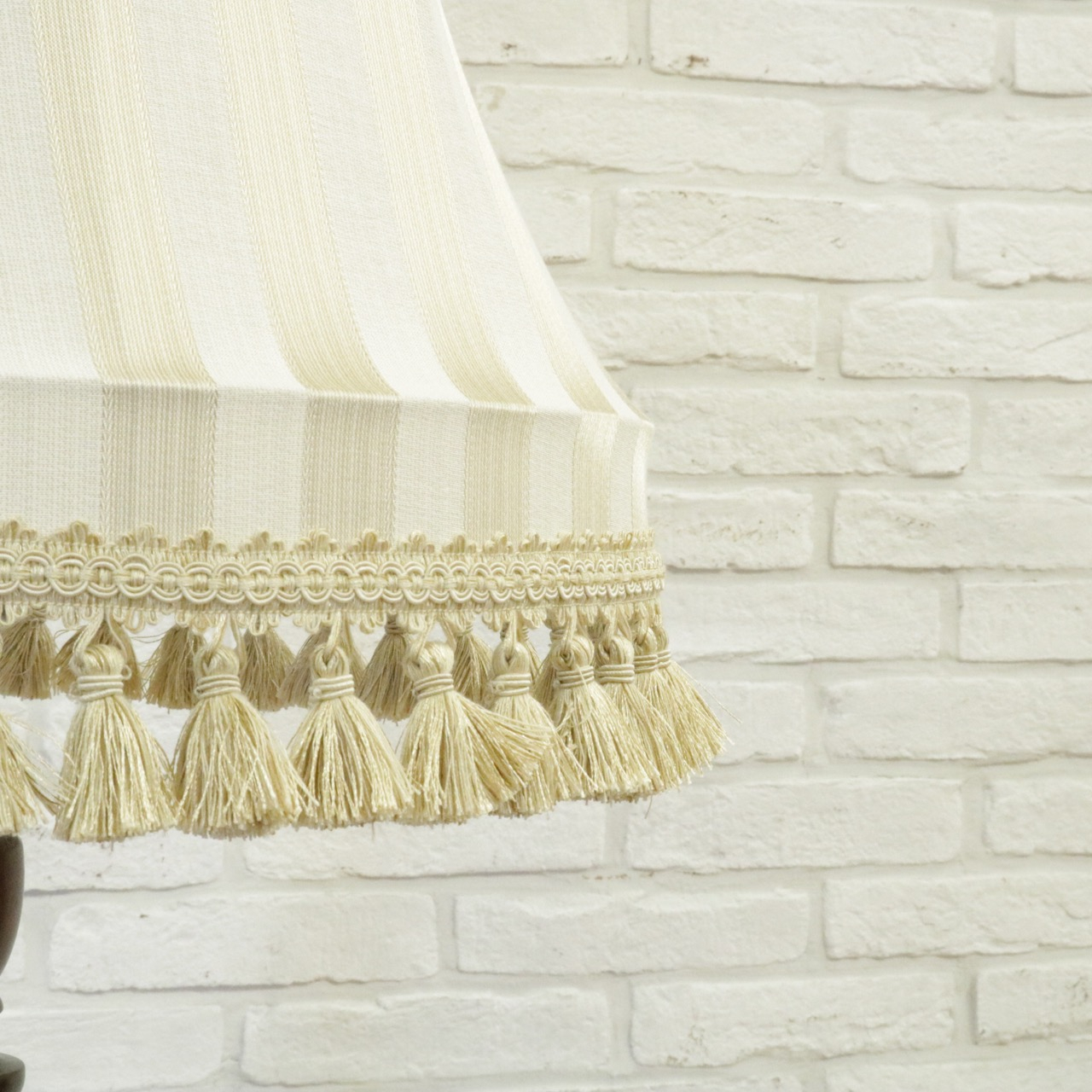 ホワイトのボリュームのあるタッセルトリムをアクセントとして留めています。