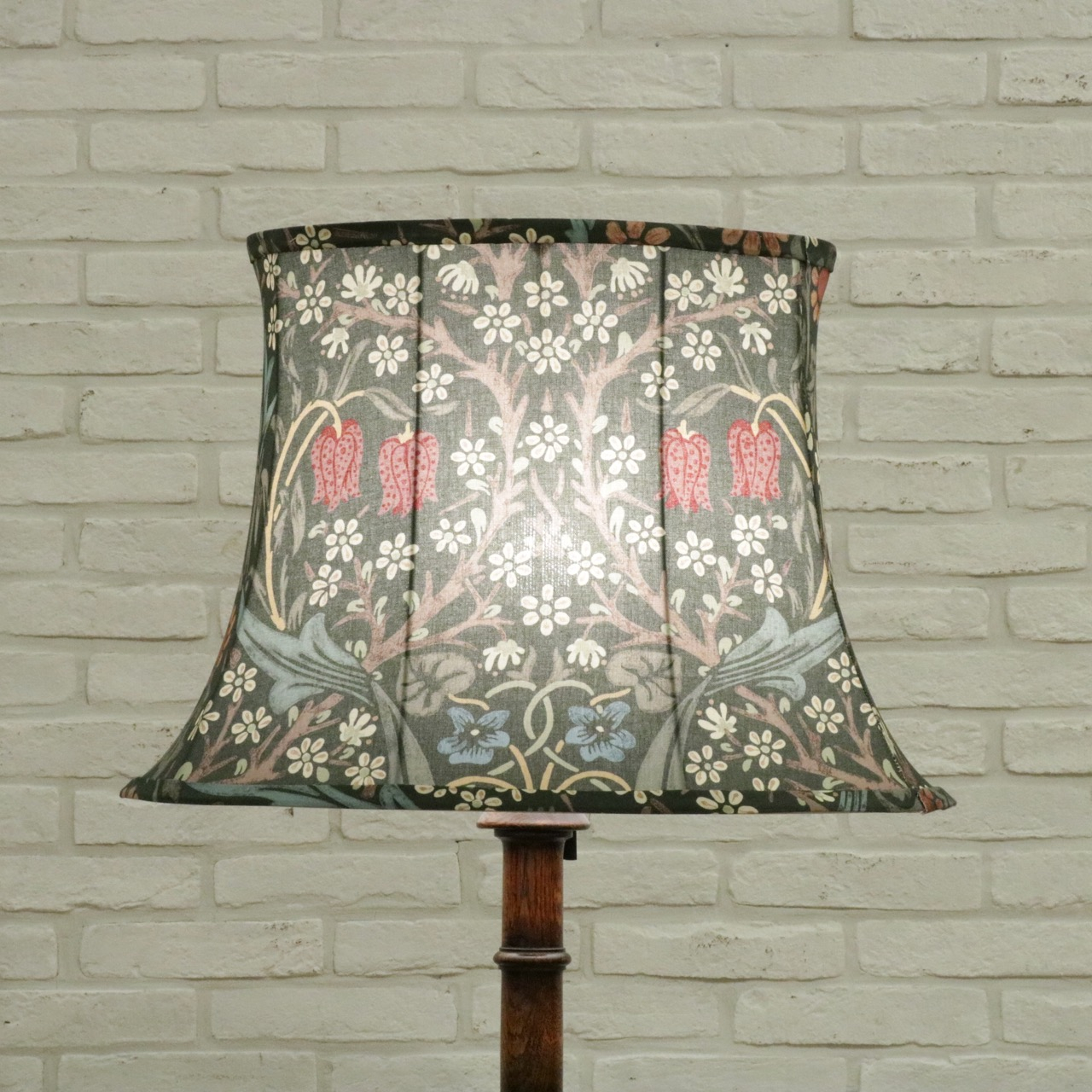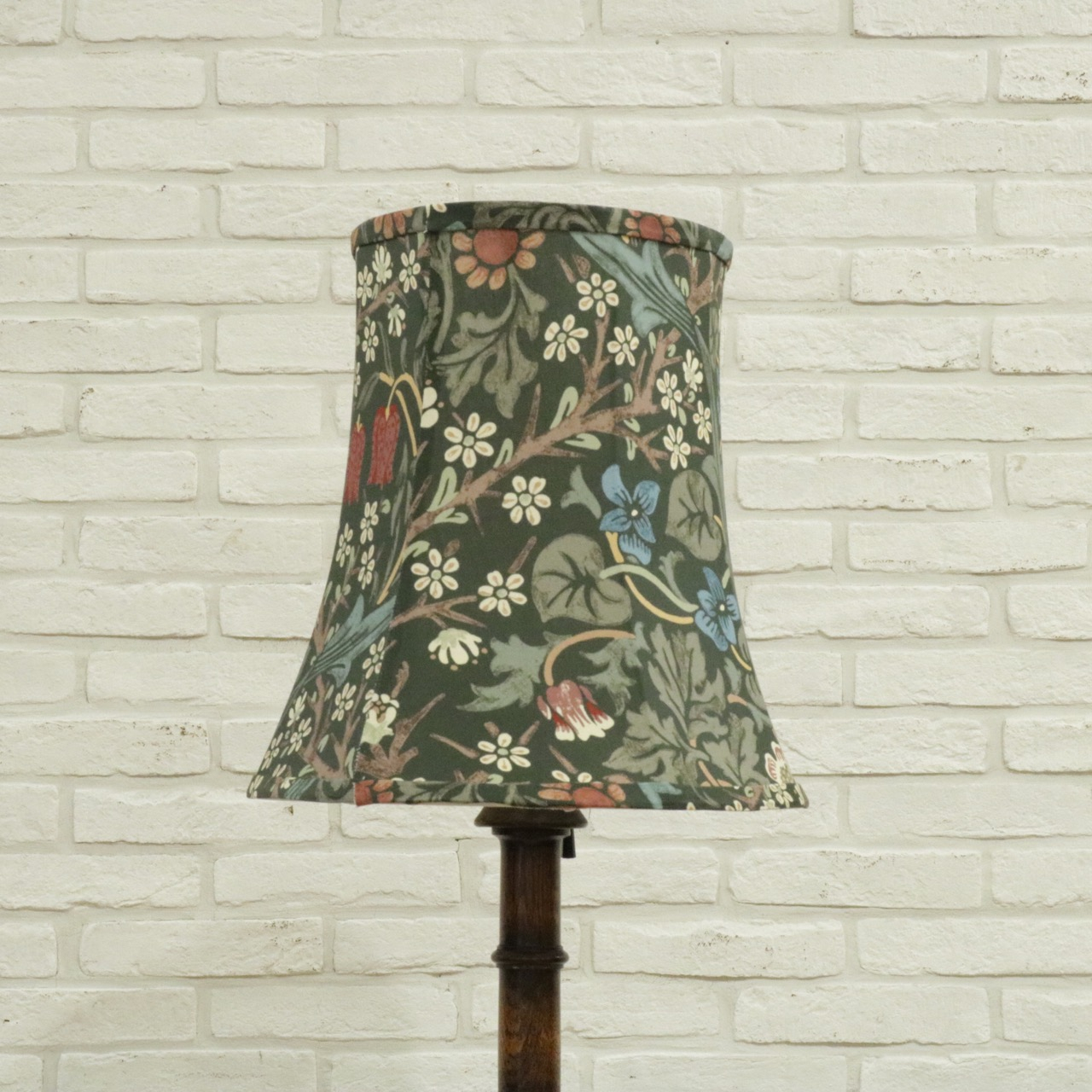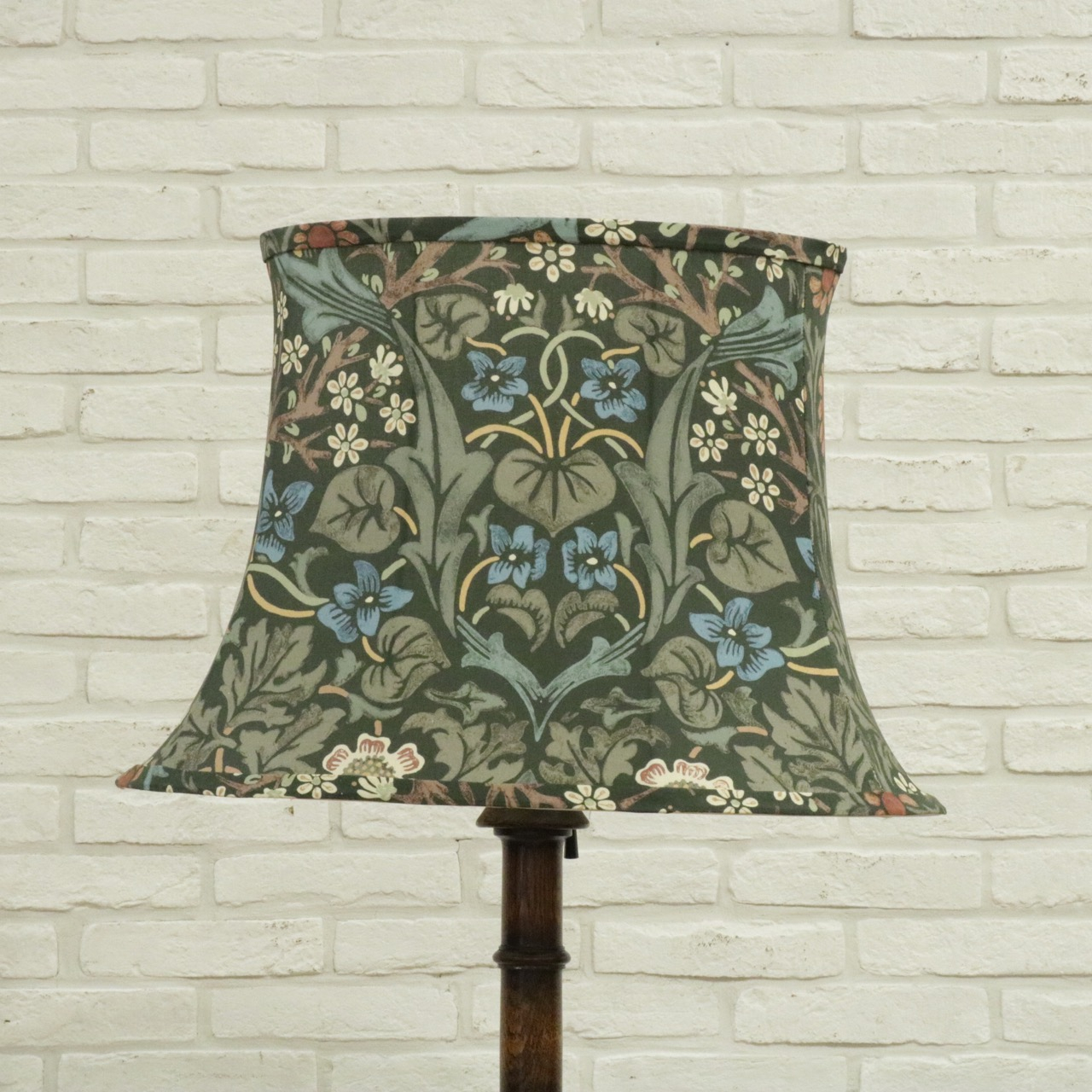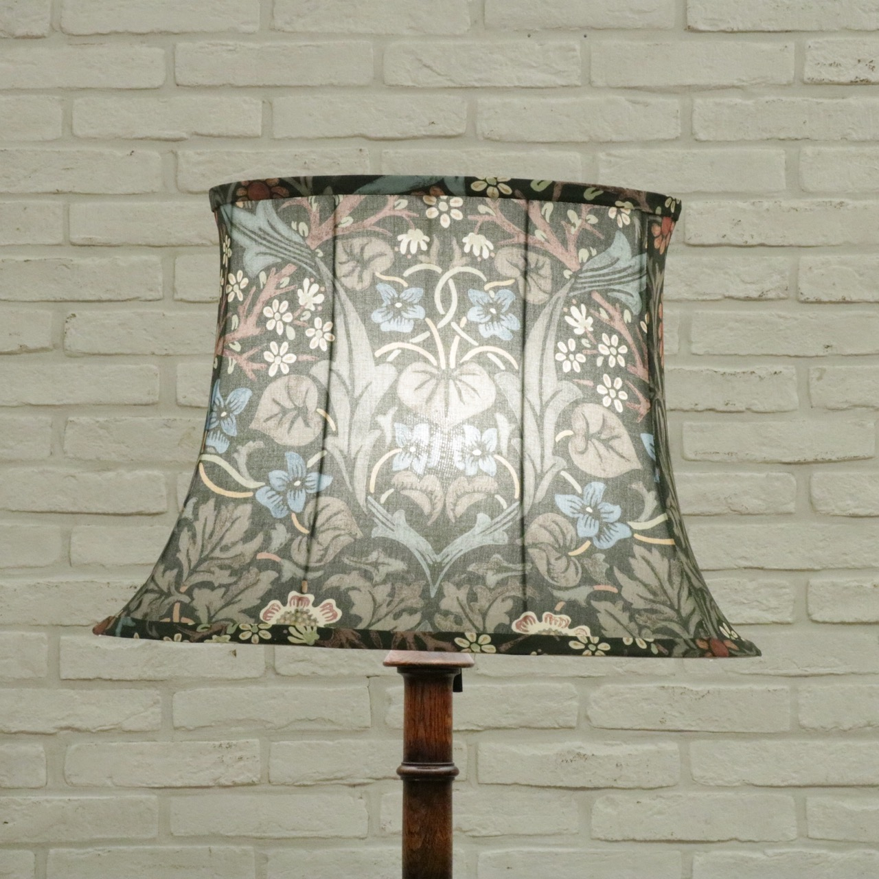ウィリアム・モリスの弟子であるジョン・ヘンリー・ダールによって1892年にデザインされた「ブラックトーン」のファブリックを用い、製作したランプシェードです。モリスの好んだ英国の花、バイモやブラックトーンやスミレがデザインされています。