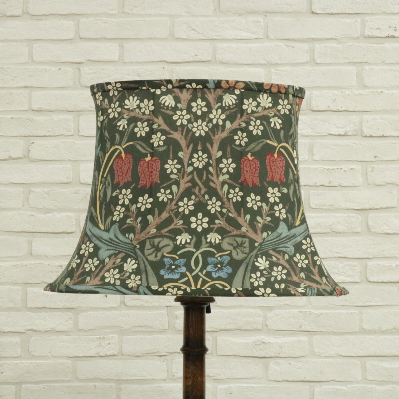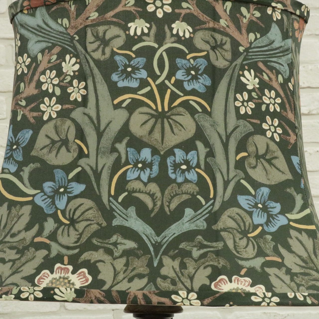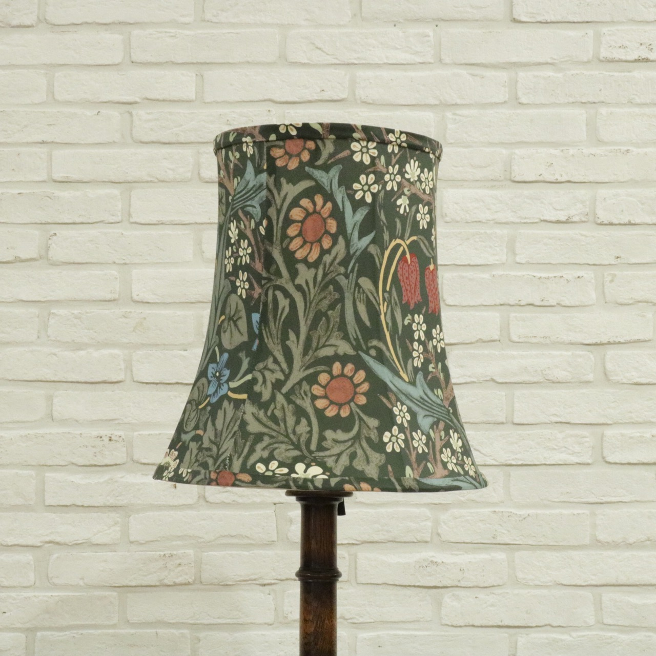 ウィリアム・モリスの弟子であるジョン・ヘンリー・ダールによって1892年にデザインされた「ブラックトーン」のファブリックを用い、製作したランプシェードです。モリスの好んだ英国の花、バイモやブラックトーンやスミレがデザインされています。