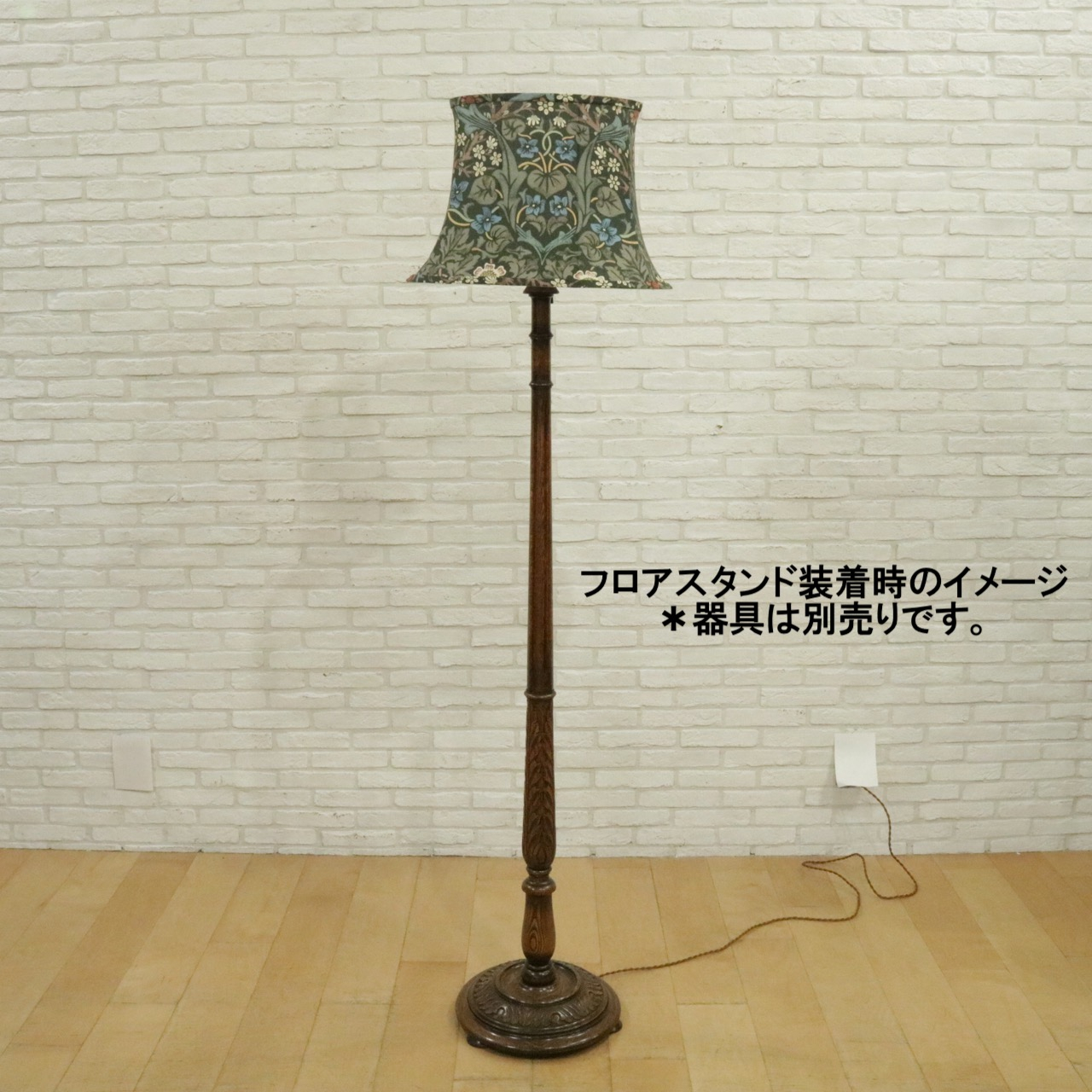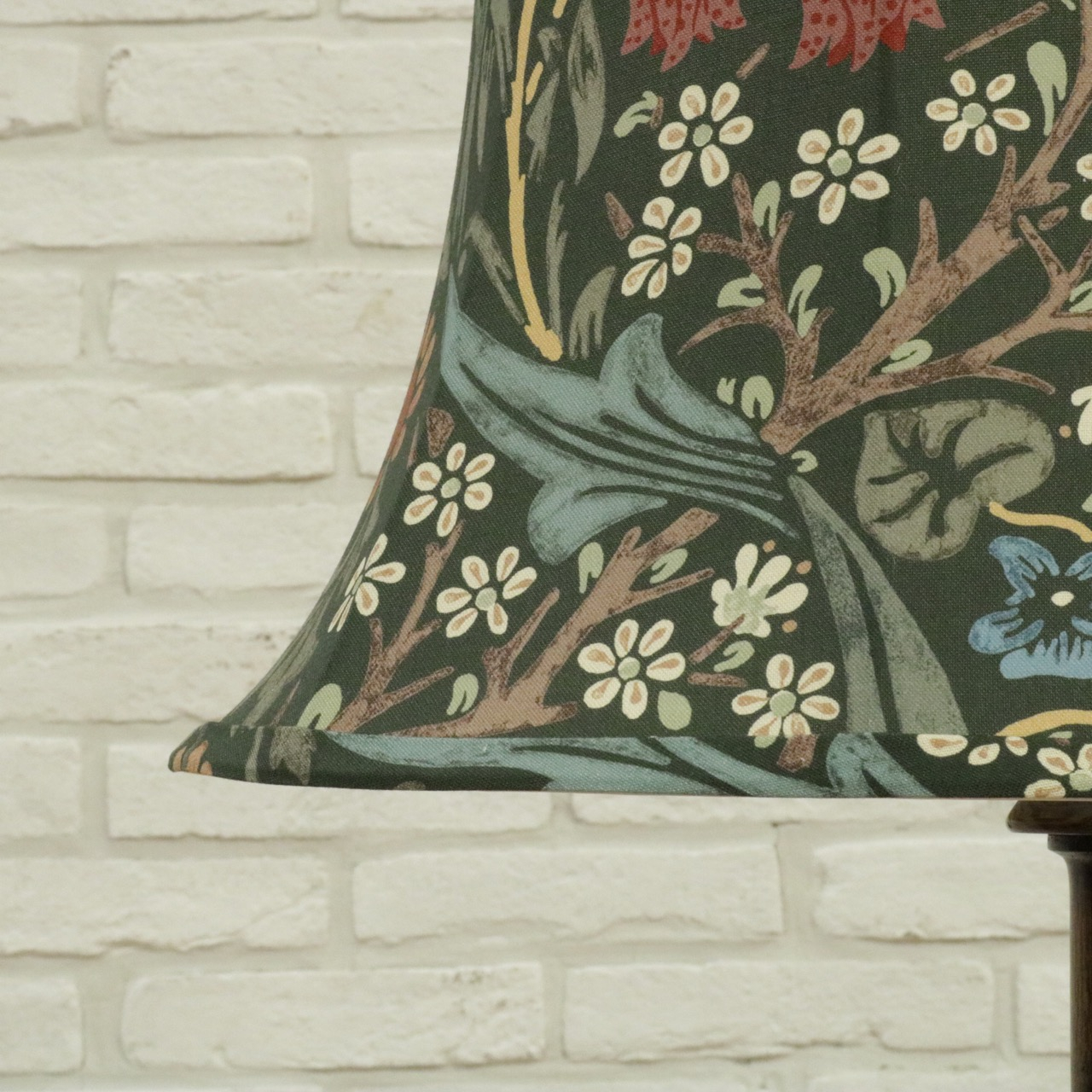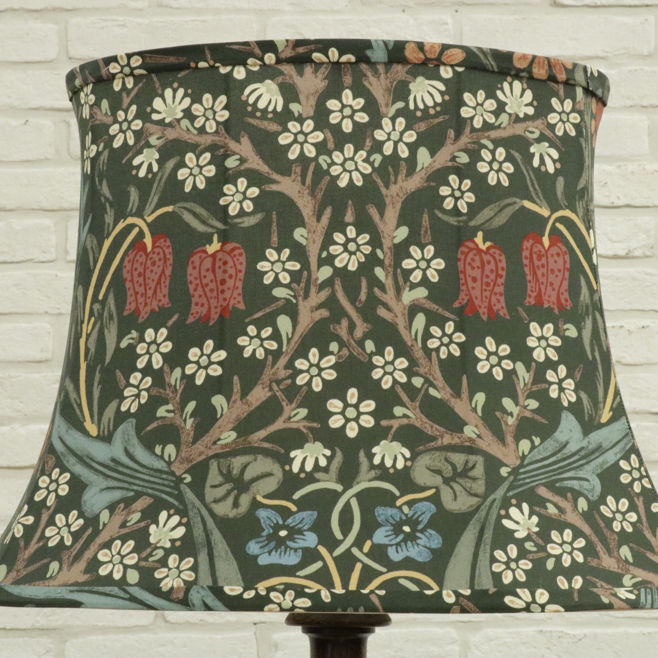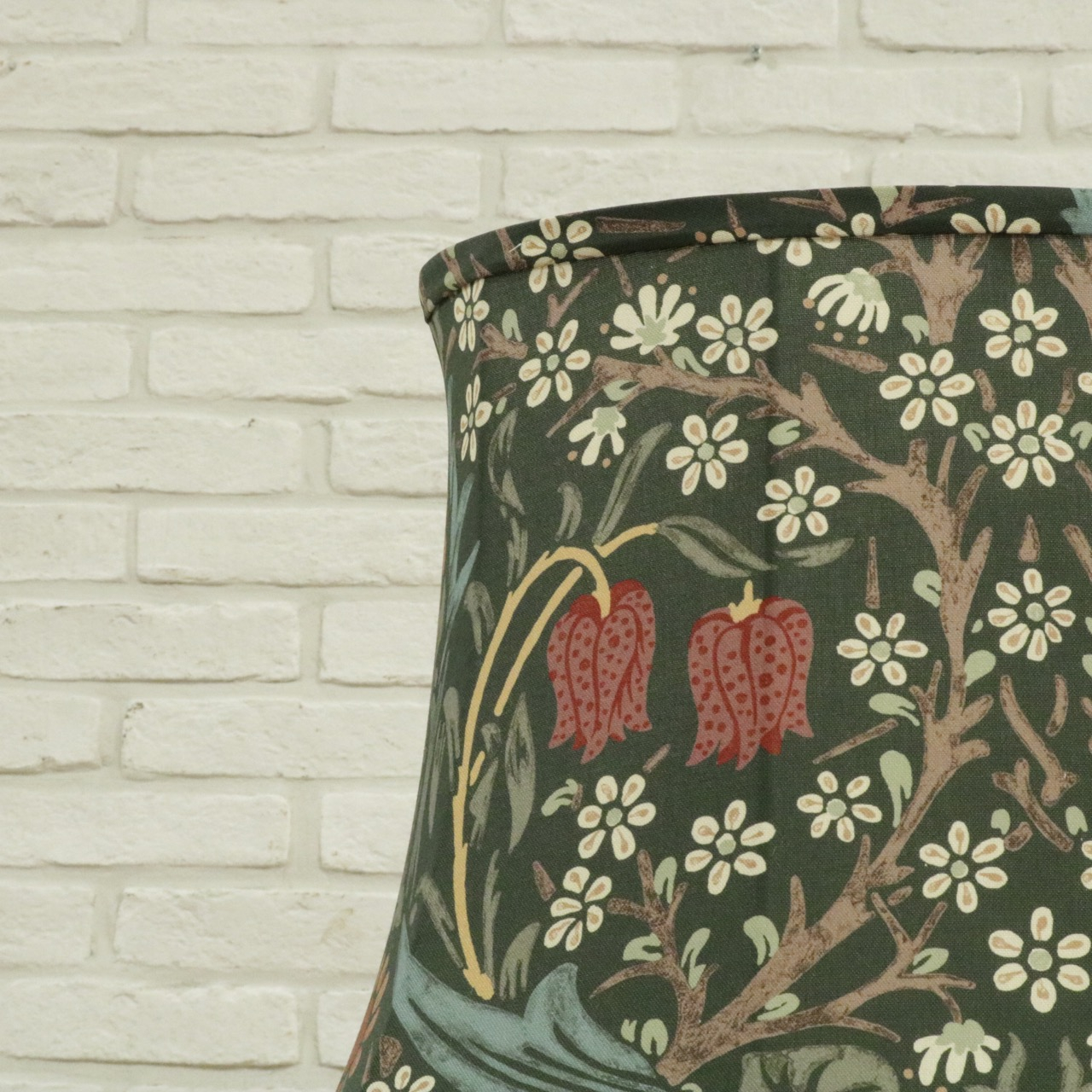 ウィリアム・モリスの弟子であるジョン・ヘンリー・ダールによって1892年にデザインされた「ブラックトーン」のファブリックを用い、製作したランプシェードです。モリスの好んだ英国の花、バイモやブラックトーンやスミレがデザインされています。