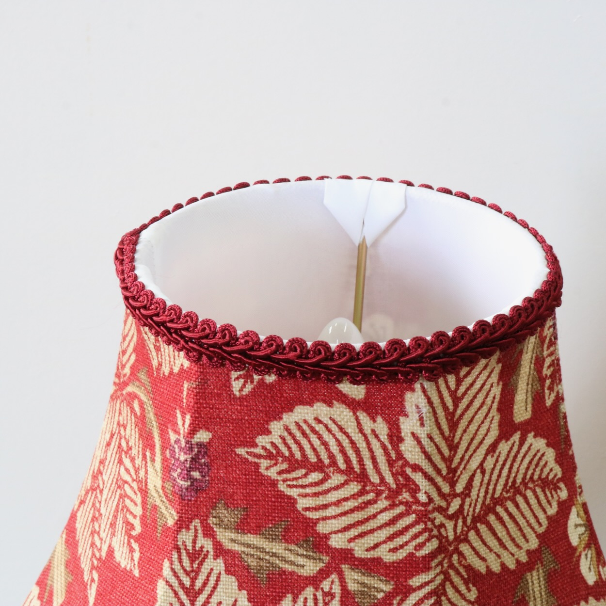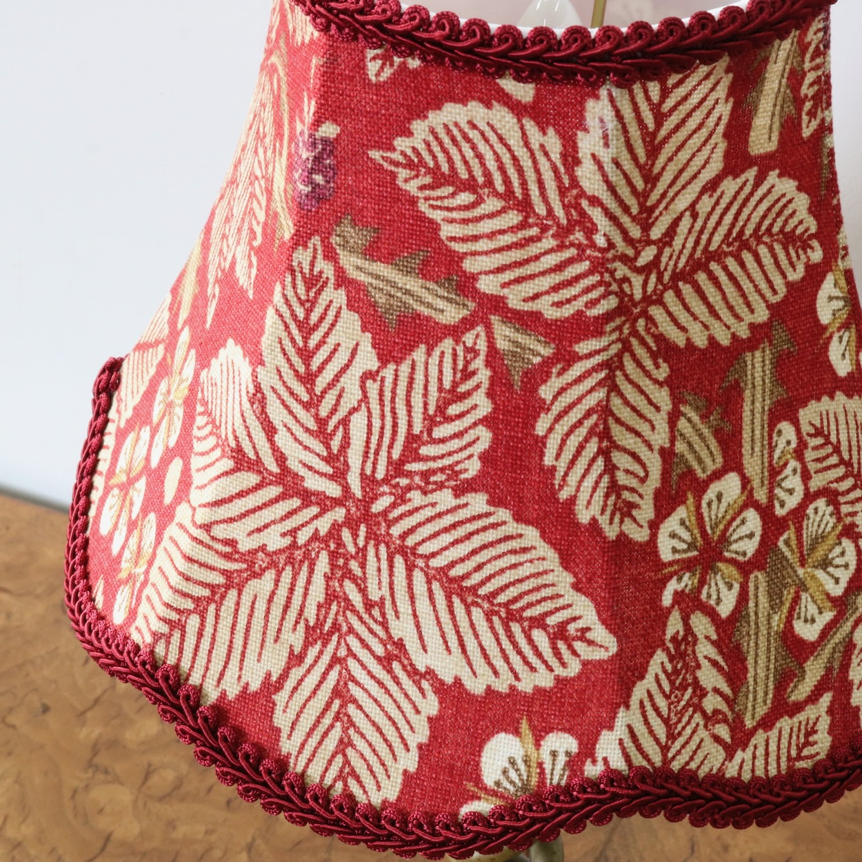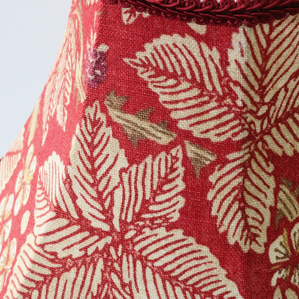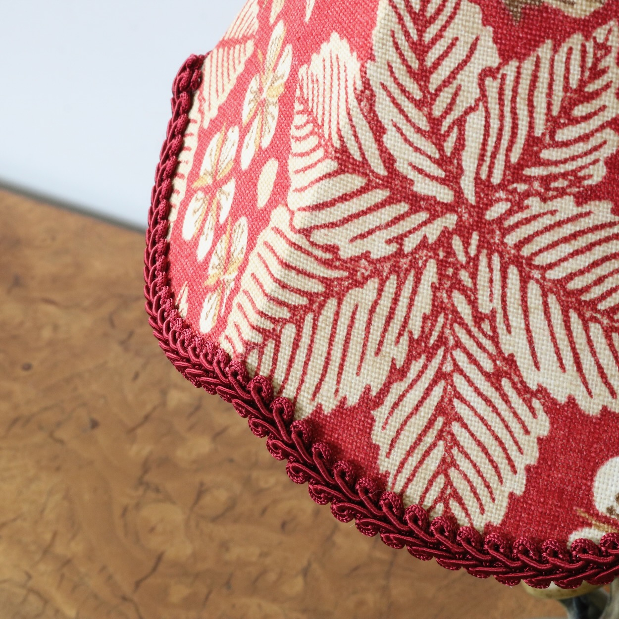 落ち着いた色合いの赤地に白い花やベリーが描かれた華やかで印象的なテキスタイル。