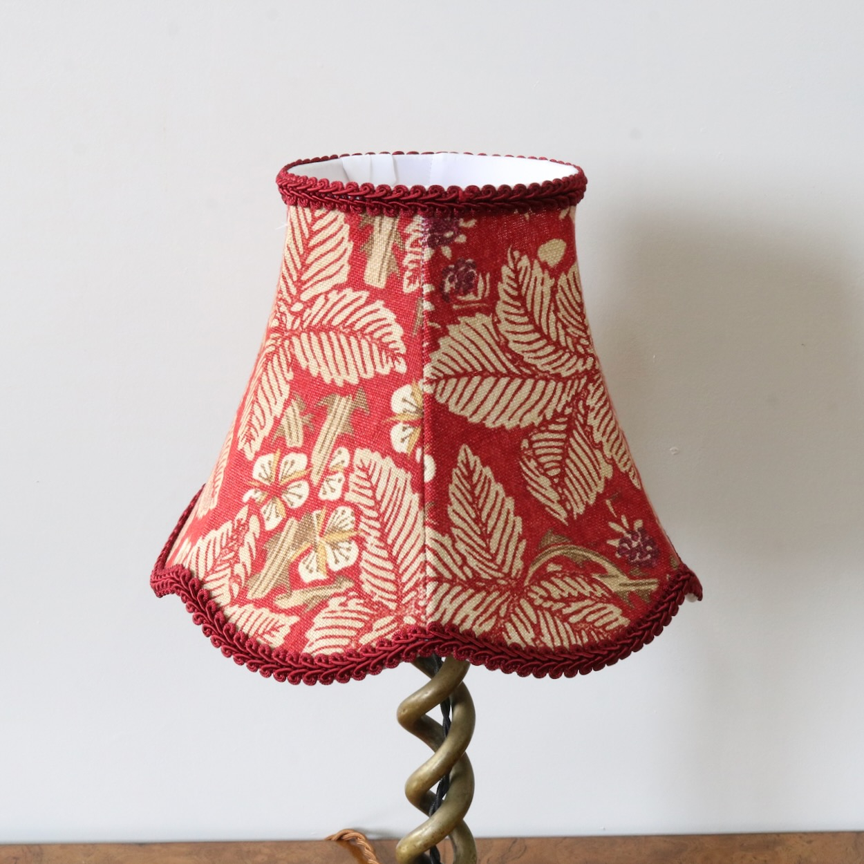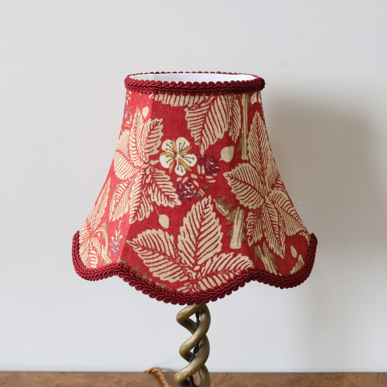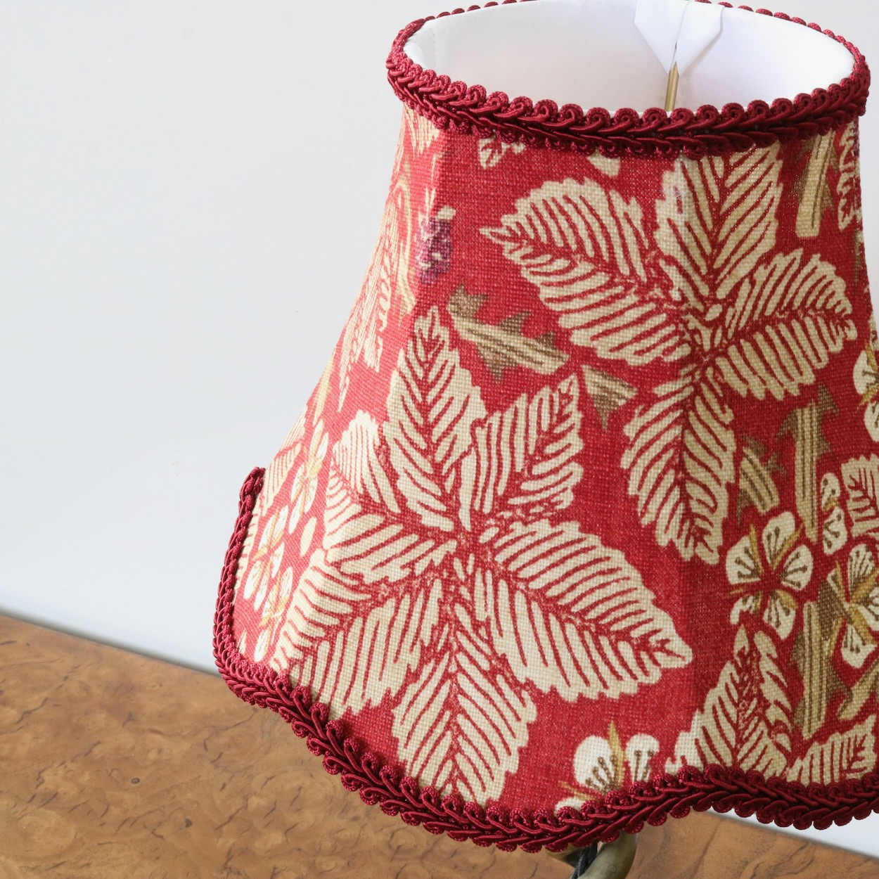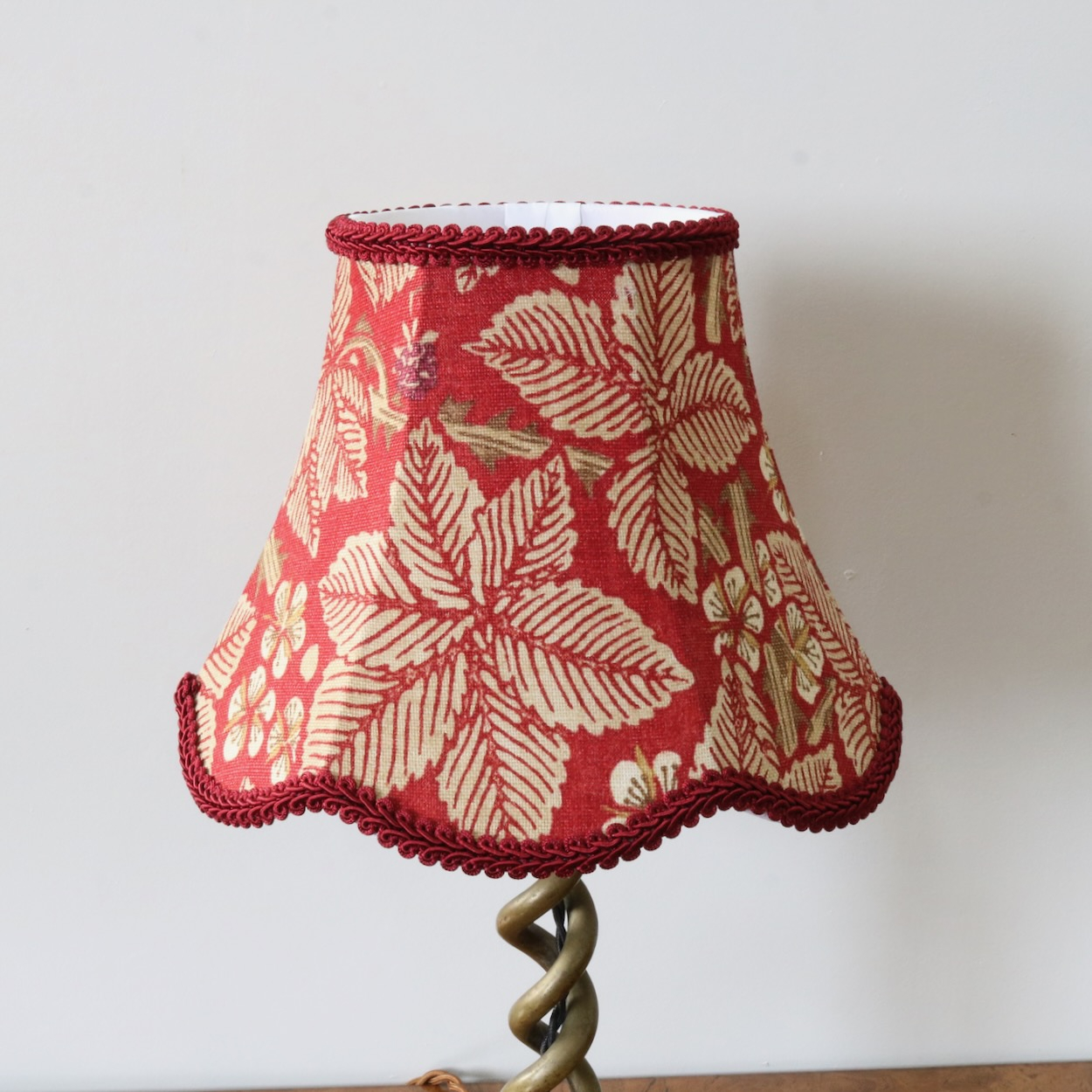 落ち着いた色合いの赤地に白い花やベリーが描かれた華やかで印象的なテキスタイル。