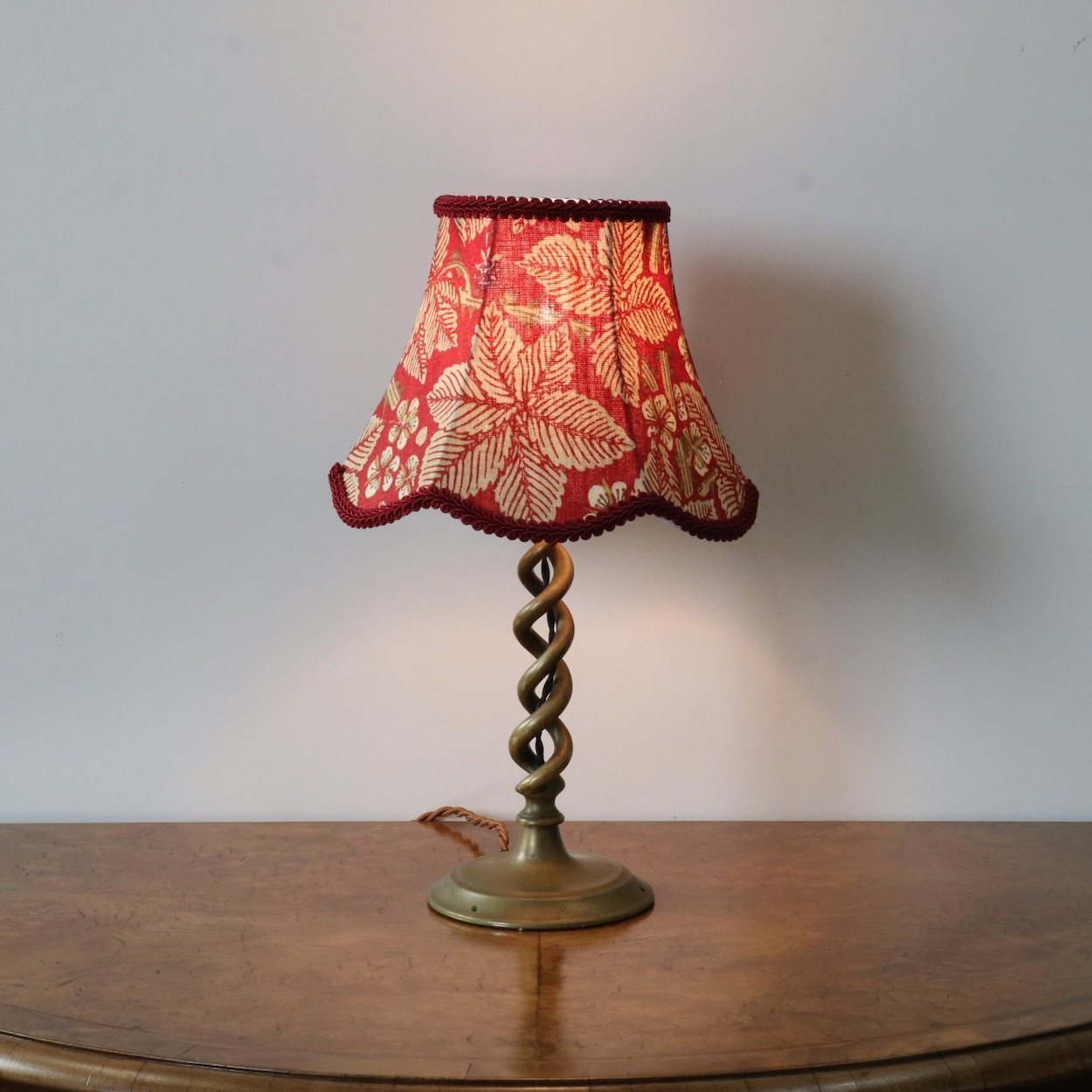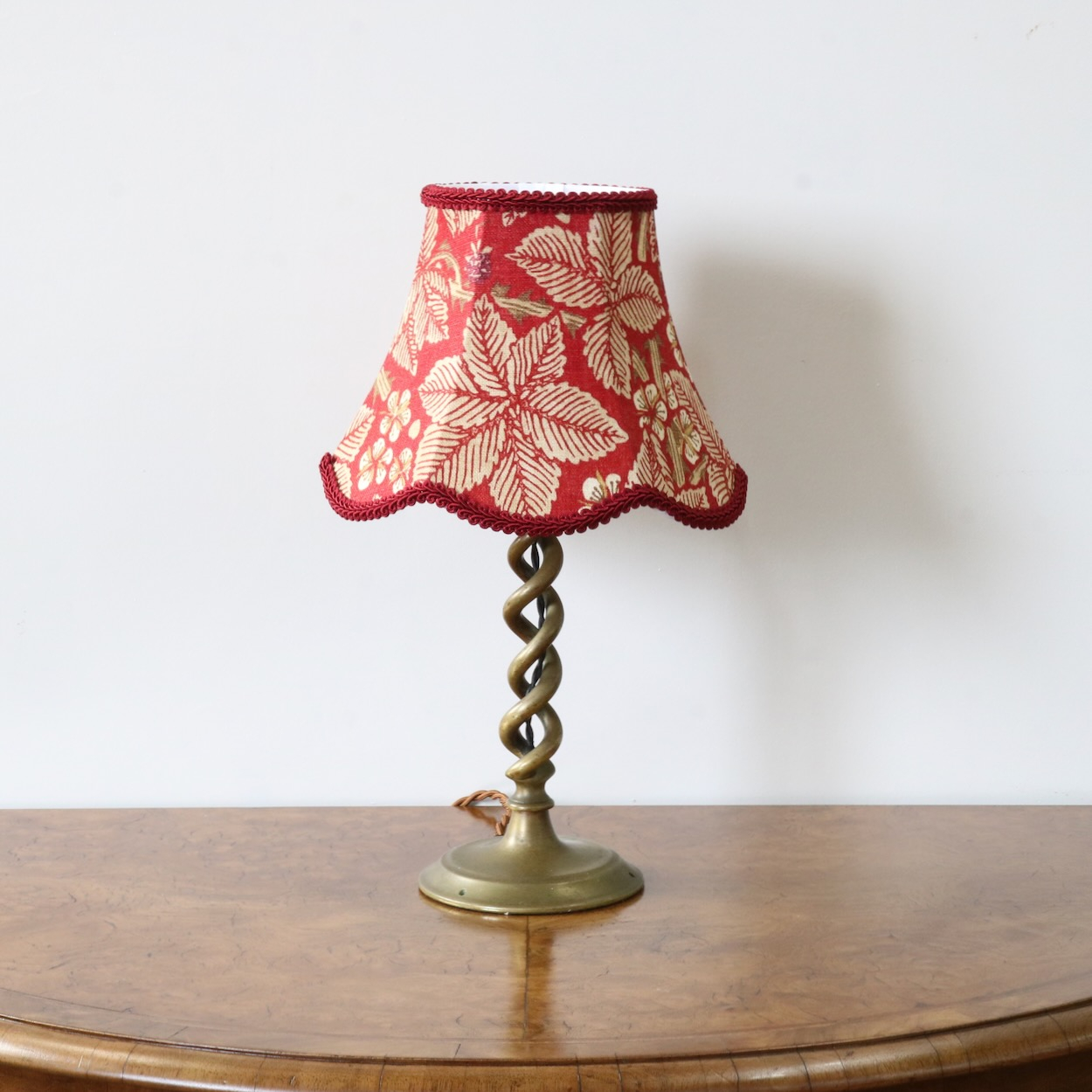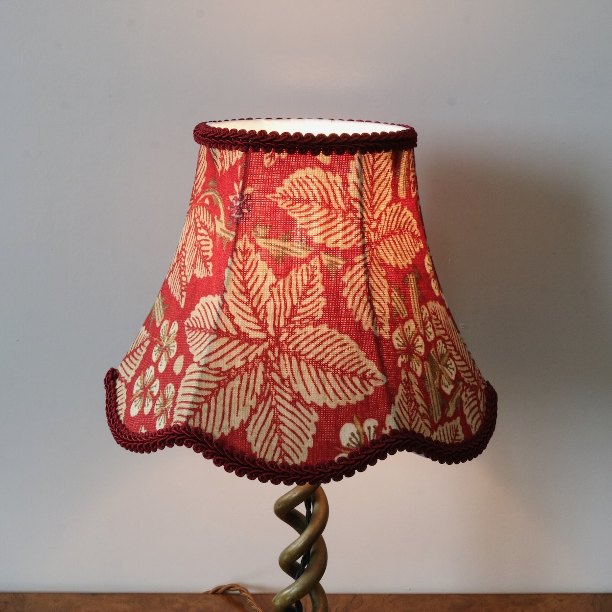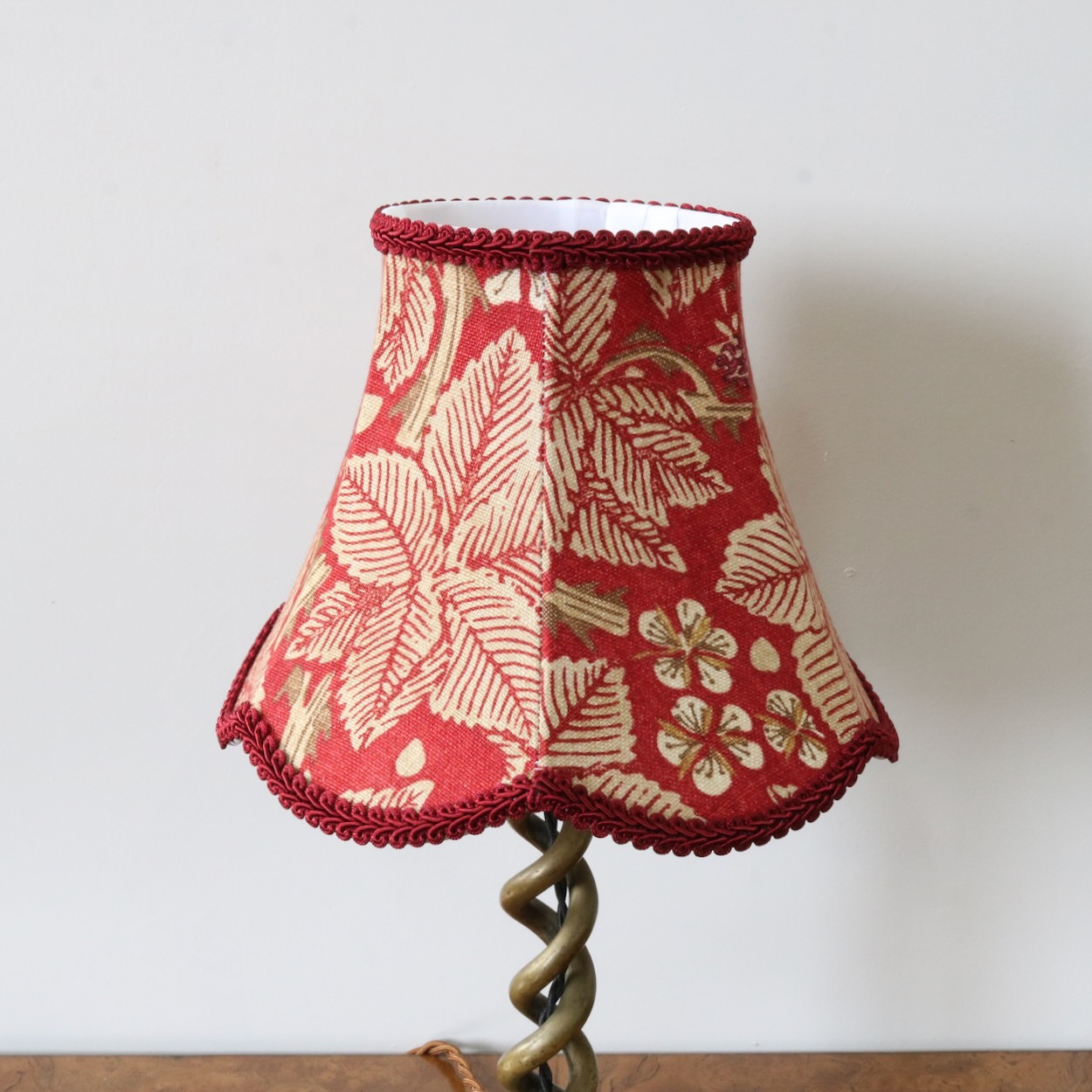 落ち着いた色合いの赤地に白い花やベリーが描かれた華やかで印象的なテキスタイル。