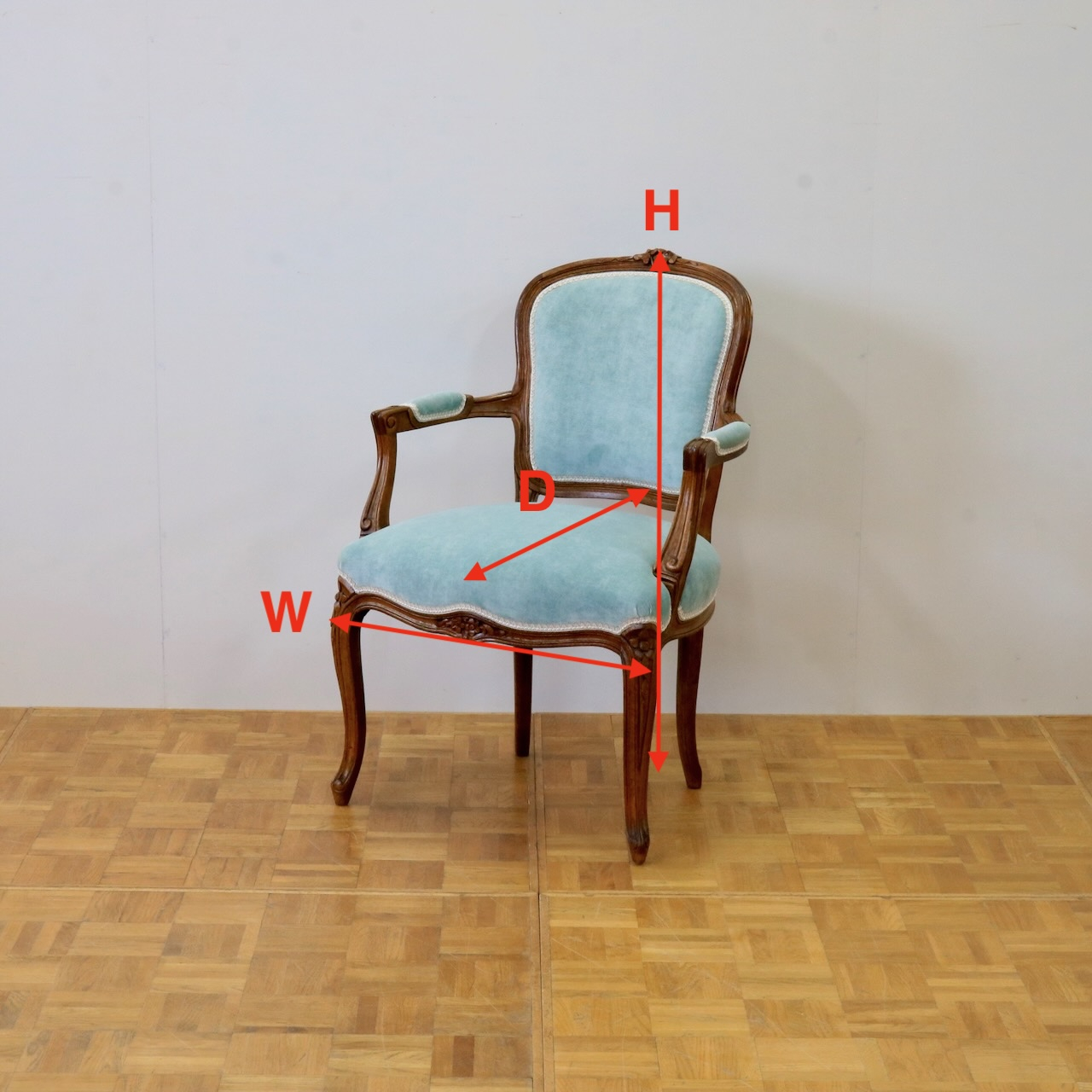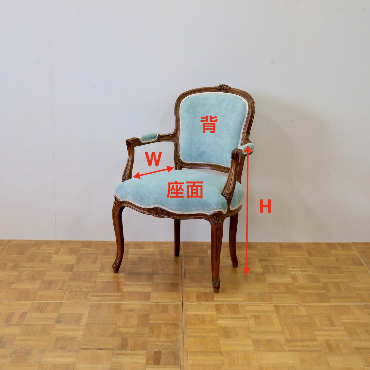 フレンチスクロールと呼ばれる渦を巻いたような意匠がアームや脚部に施され、軽やかさを演出しています。