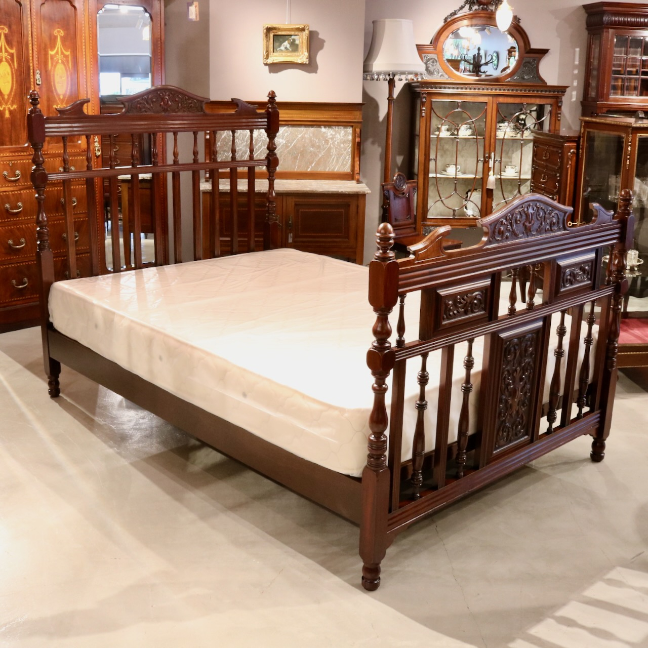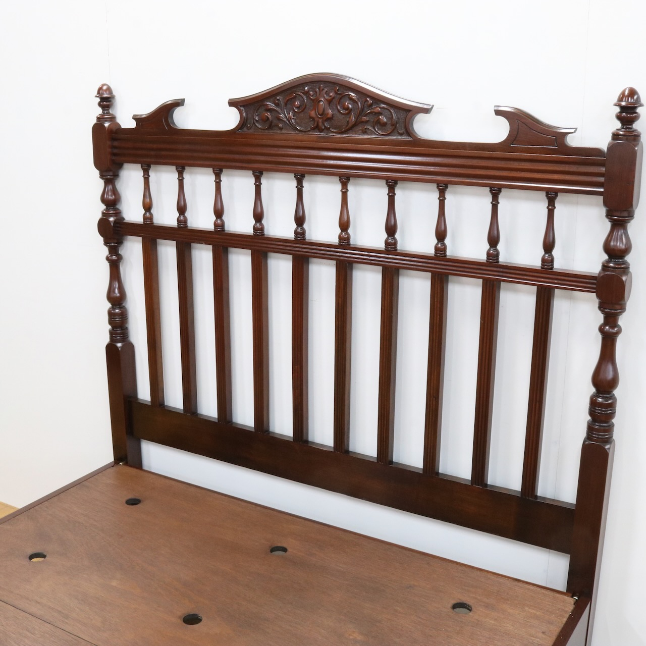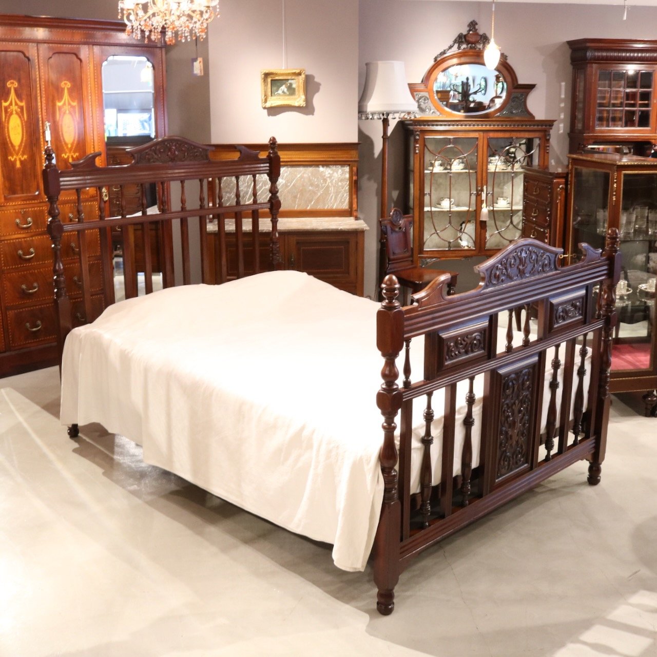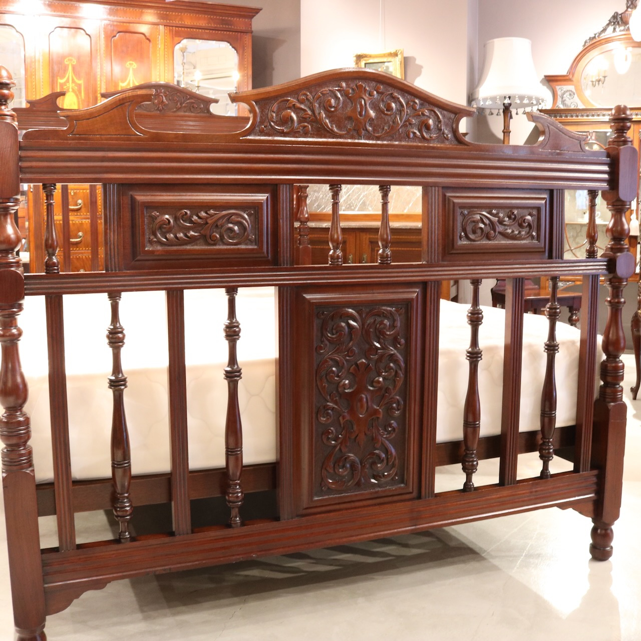 曲線的なデザインに挽物細工が多様され、アンティークならではの美しく雰囲気の良いひと品です。フットボードのパネルには細やかな植物モチーフのレリーフが施され贅沢な造りになっています。