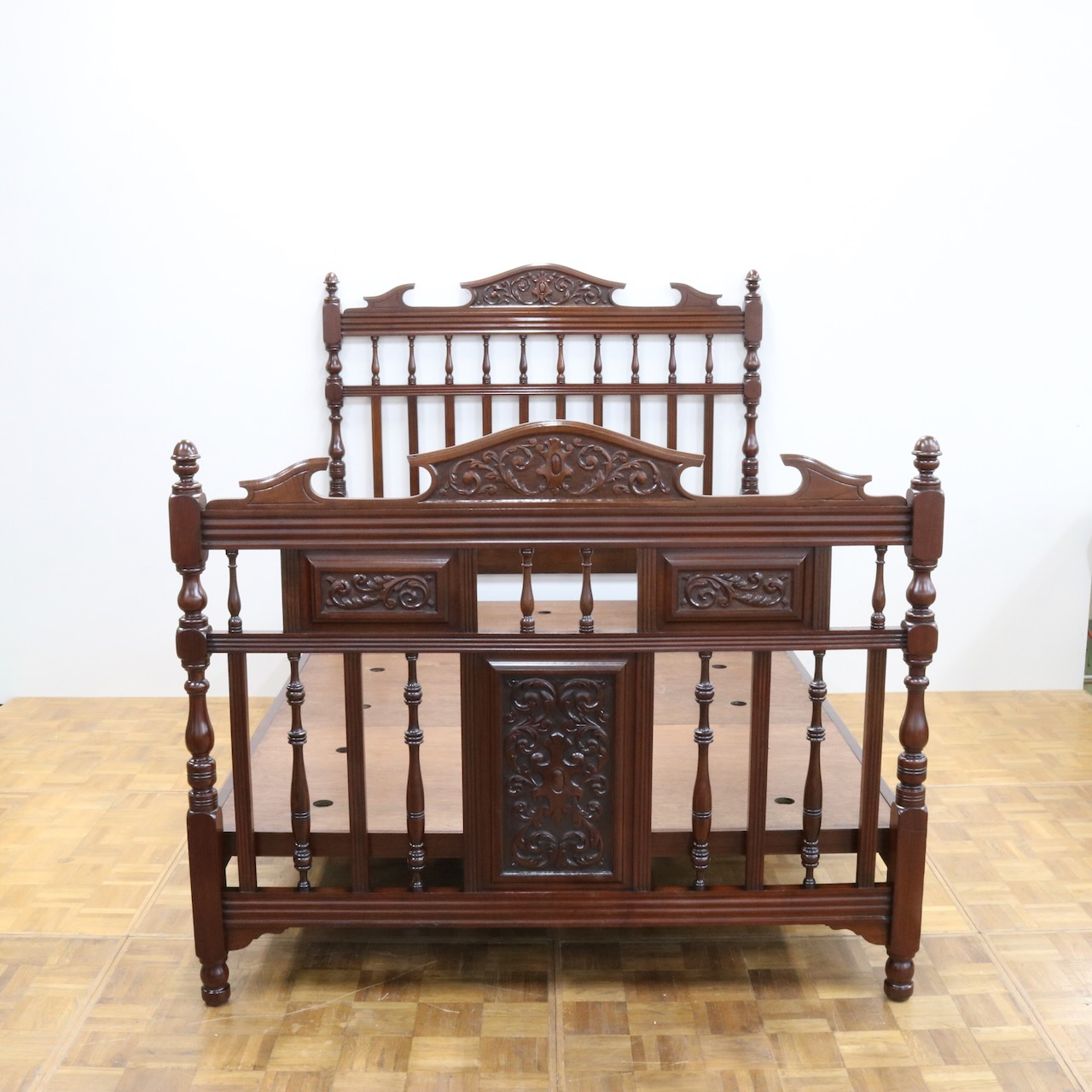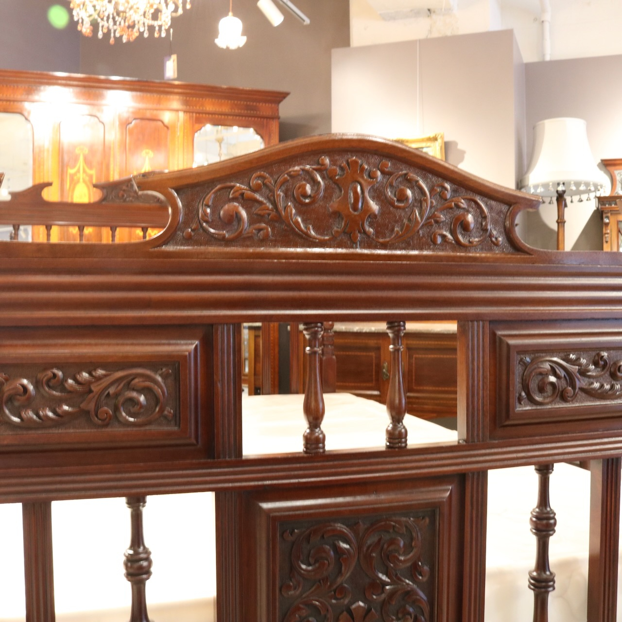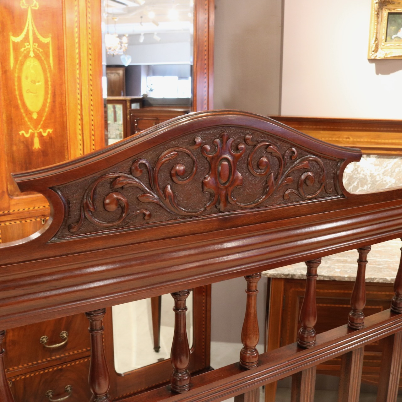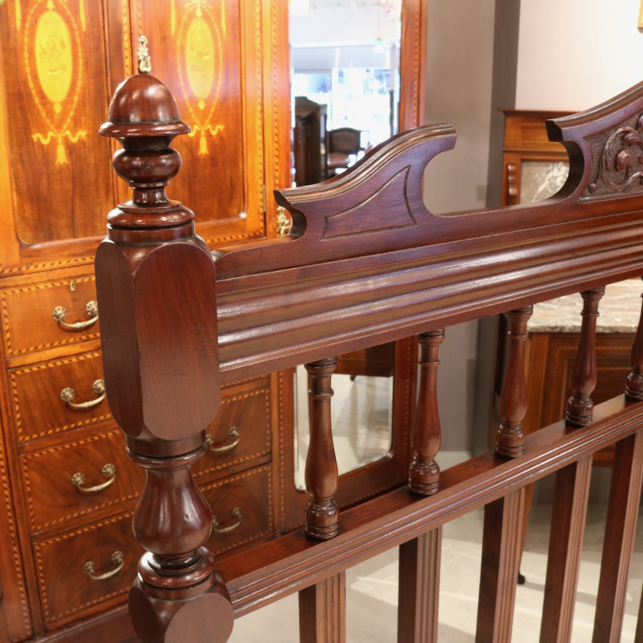 曲線的なデザインに挽物細工が多様され、アンティークならではの美しく雰囲気の良いひと品です。フットボードのパネルには細やかな植物モチーフのレリーフが施され贅沢な造りになっています。