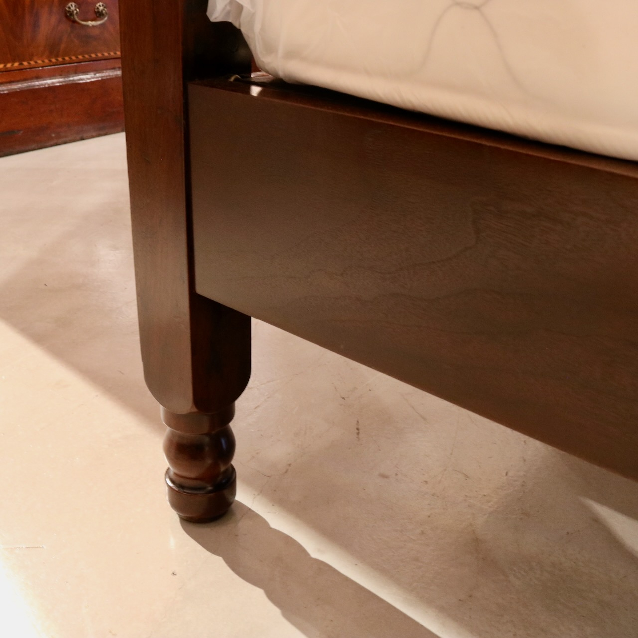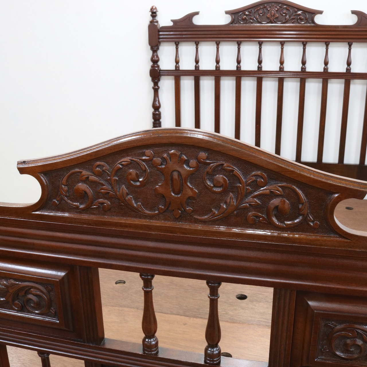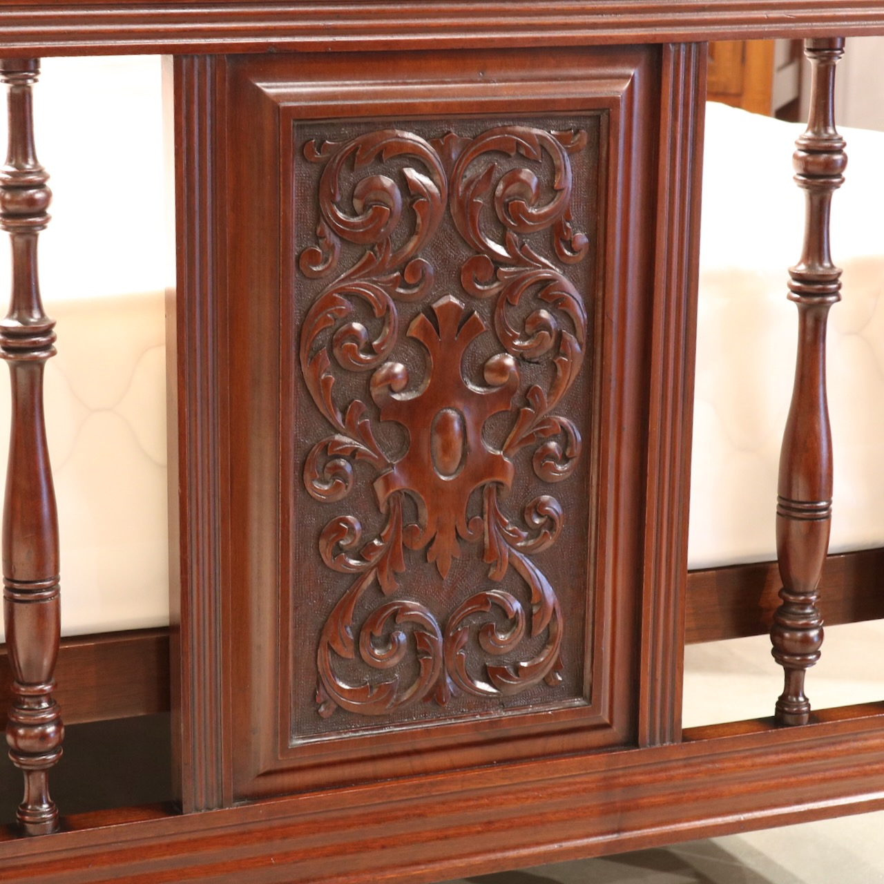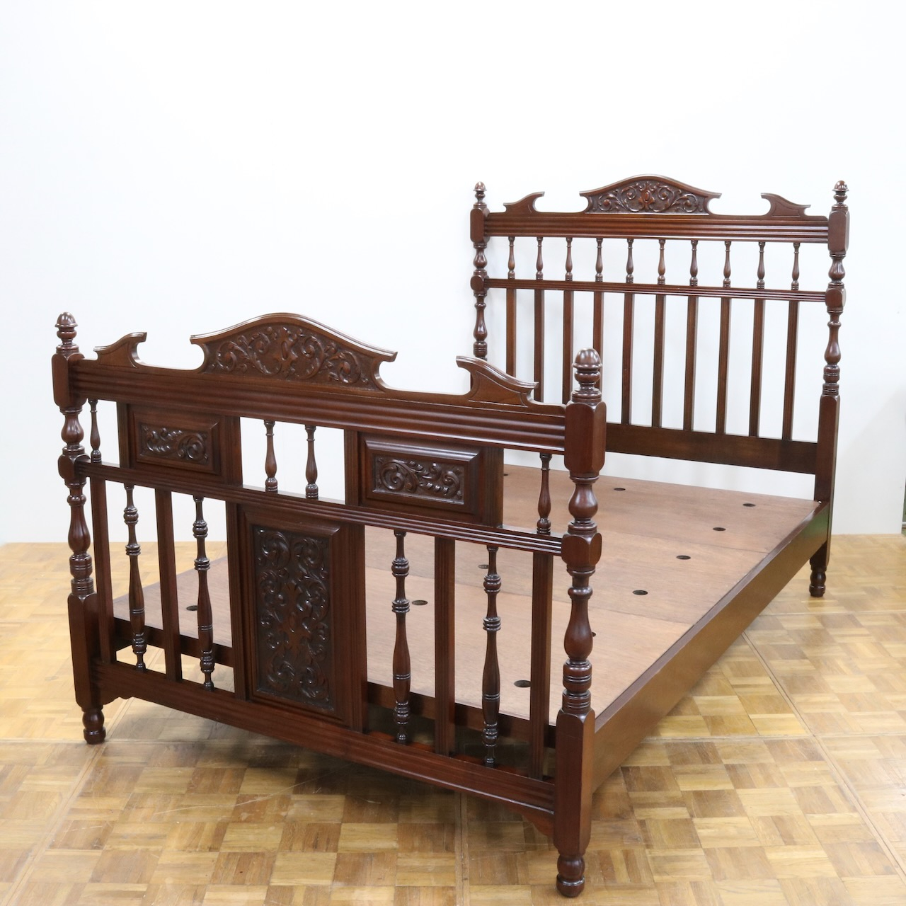 曲線的なデザインに挽物細工が多様され、アンティークならではの美しく雰囲気の良いひと品です。フットボードのパネルには細やかな植物モチーフのレリーフが施され贅沢な造りになっています。