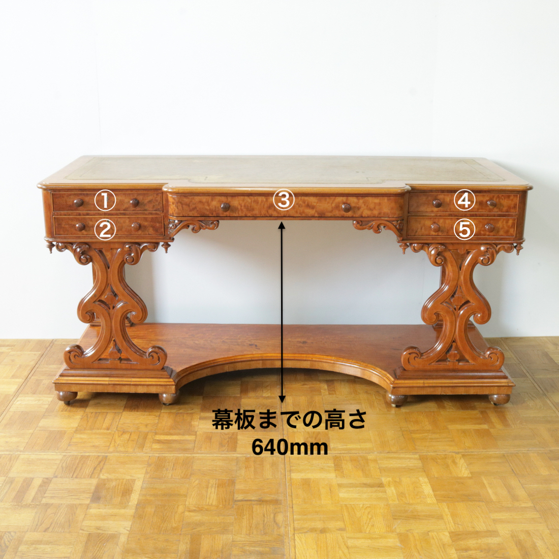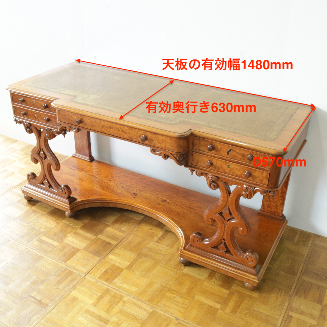 エレガントな意匠が随所に散りばめられ、レザートップの天板もクラシックな雰囲気です。大きめのサイズですがキャスターがついているので移動もしやすいのが嬉しいところ。