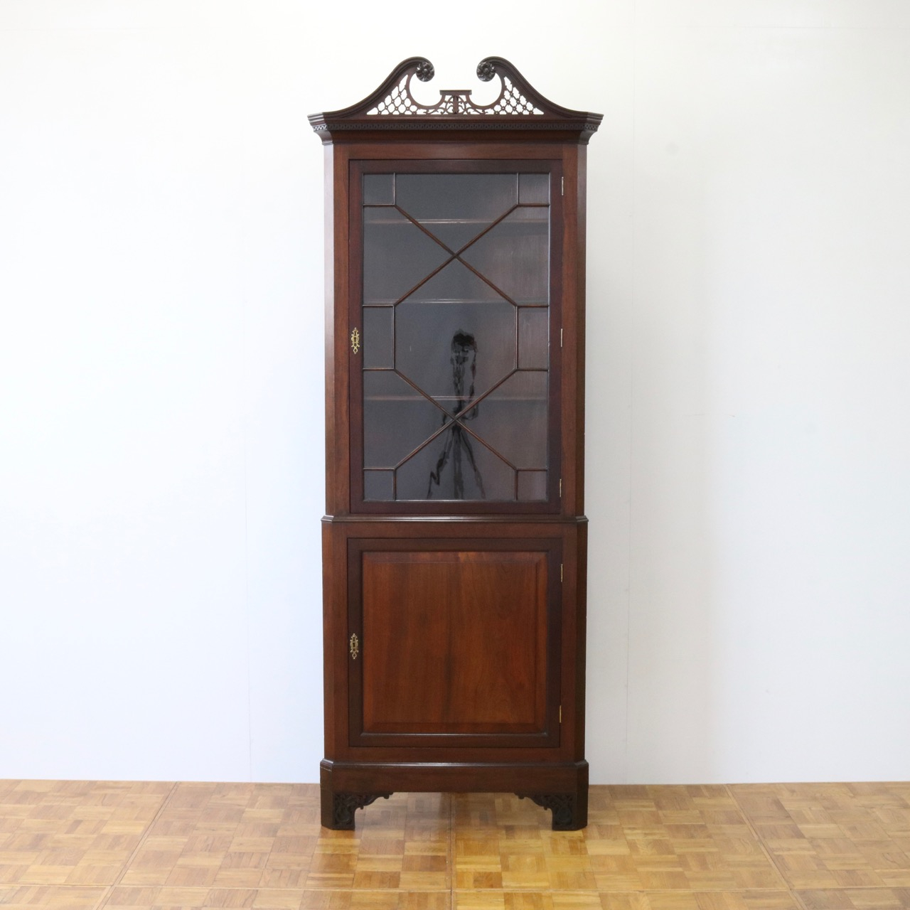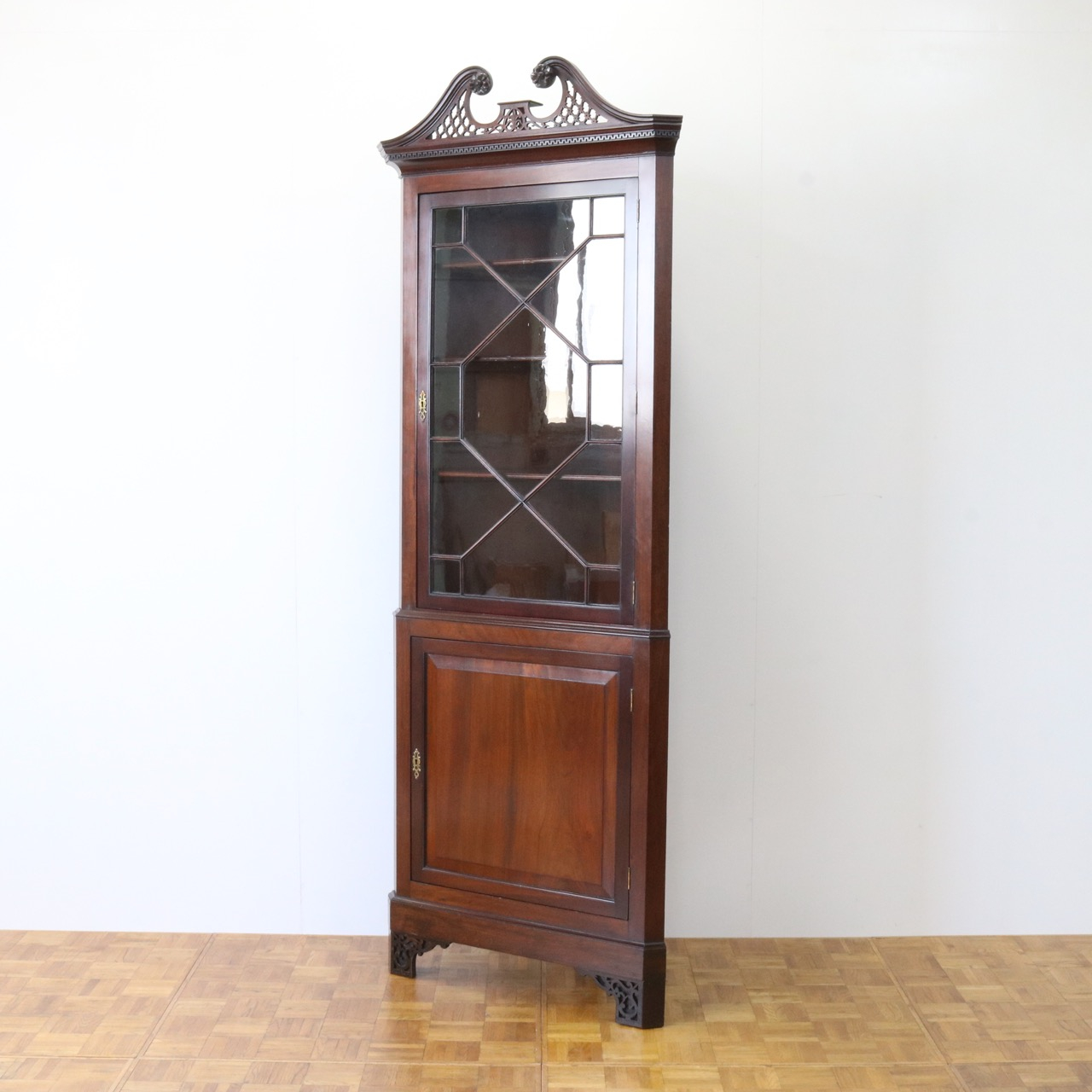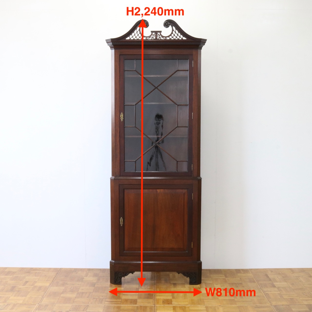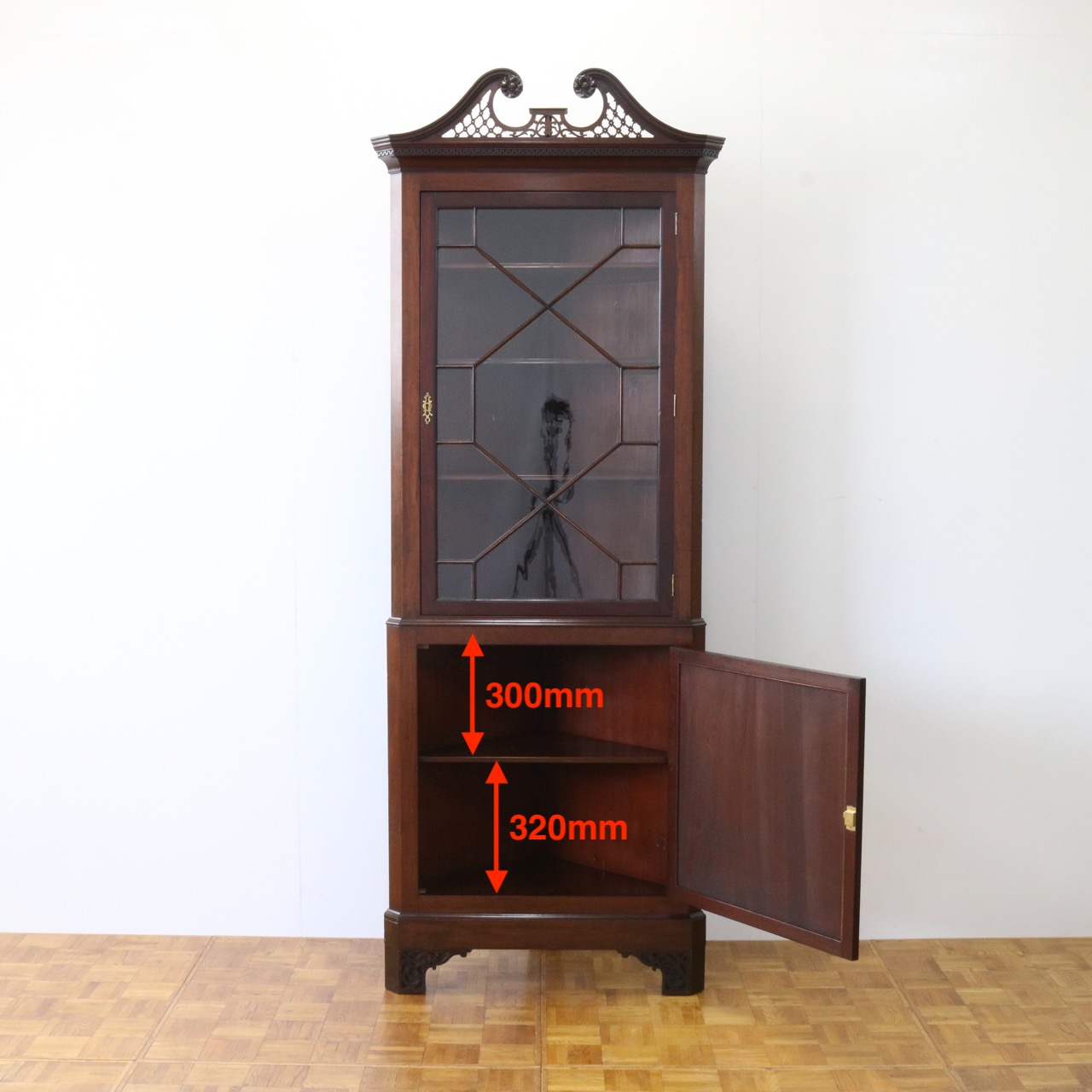 配送料の目安 ▶︎1930年代、マホガニーのコーナーキャビネット。扉の木桟とブロークンペディメントが華やかで洗練されたデザイン。コーナーを美しく彩るアイテムです。