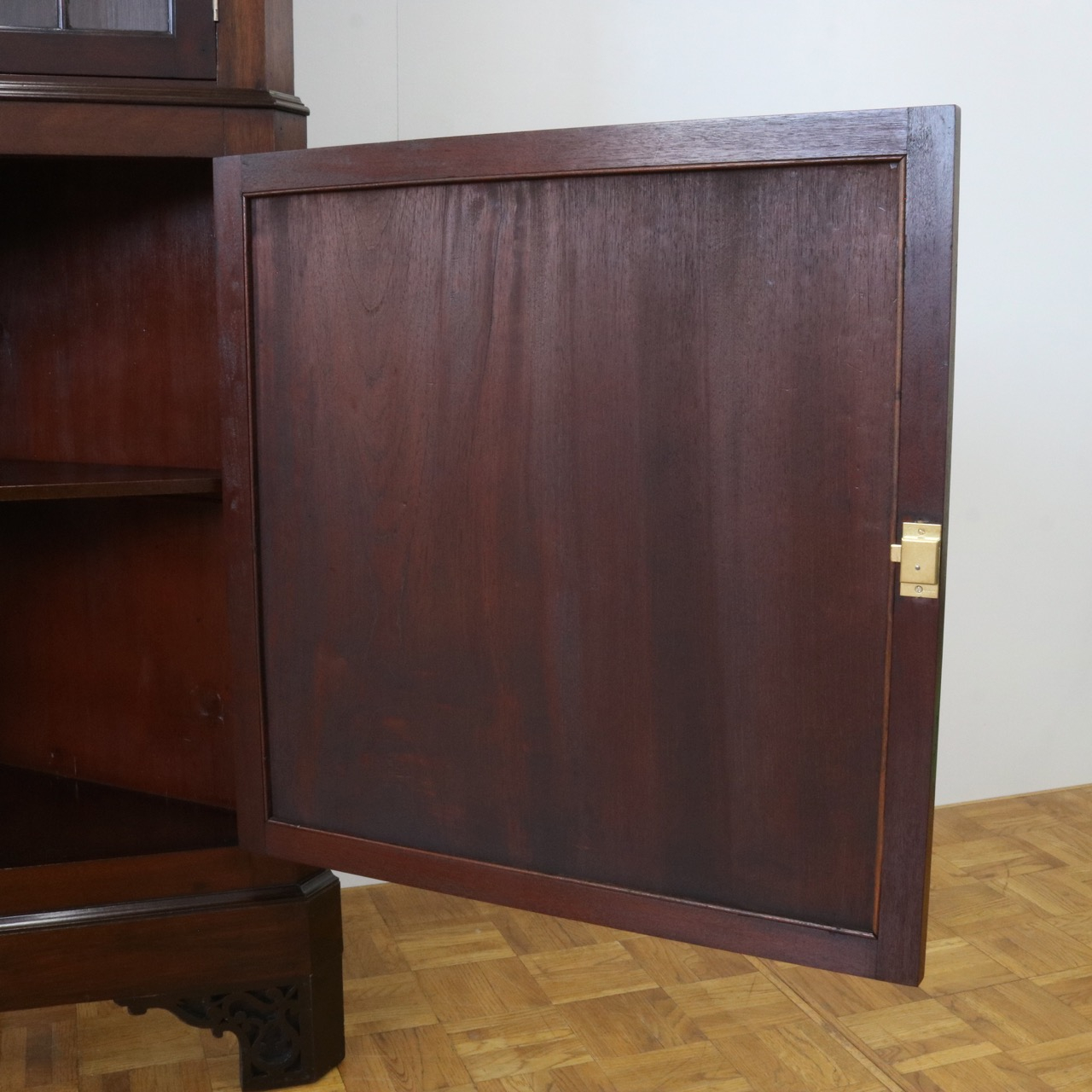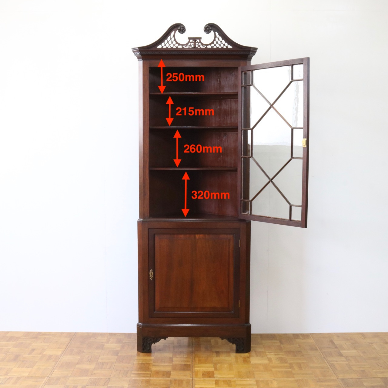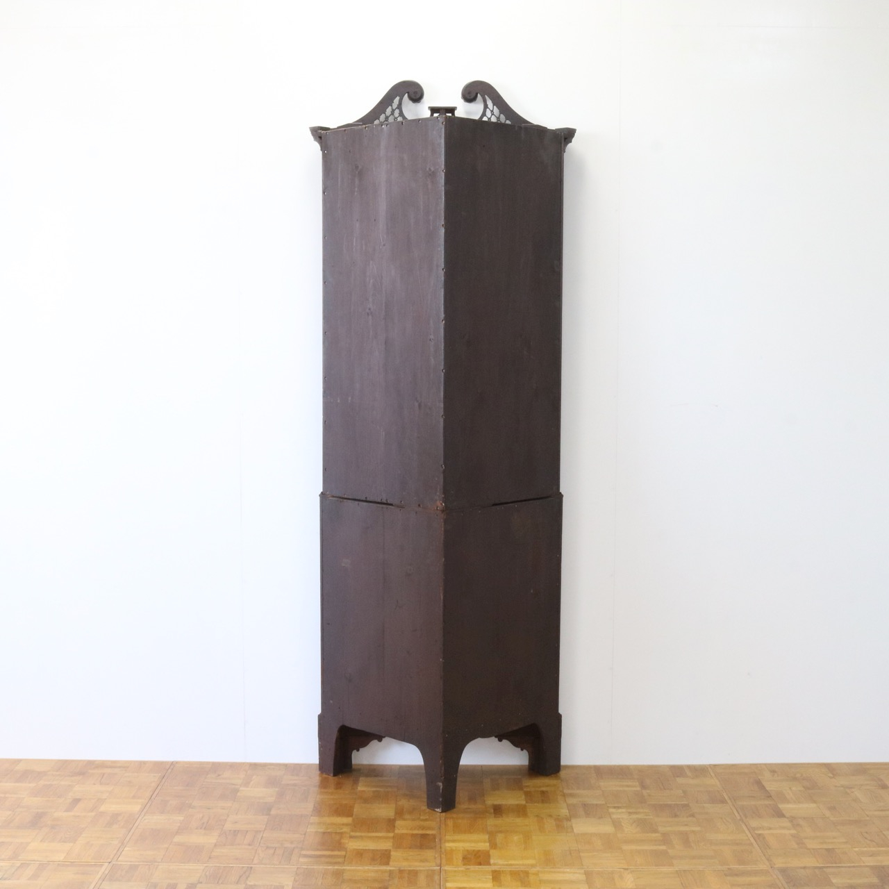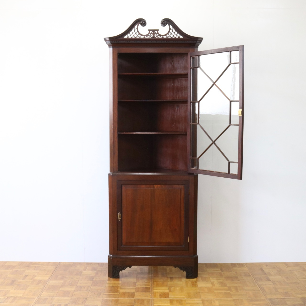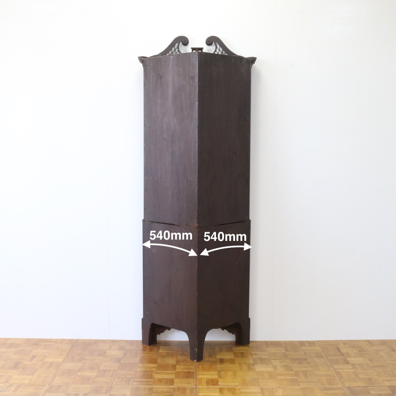配送料の目安 ▶︎1930年代、マホガニーのコーナーキャビネット。扉の木桟とブロークンペディメントが華やかで洗練されたデザイン。コーナーを美しく彩るアイテムです。