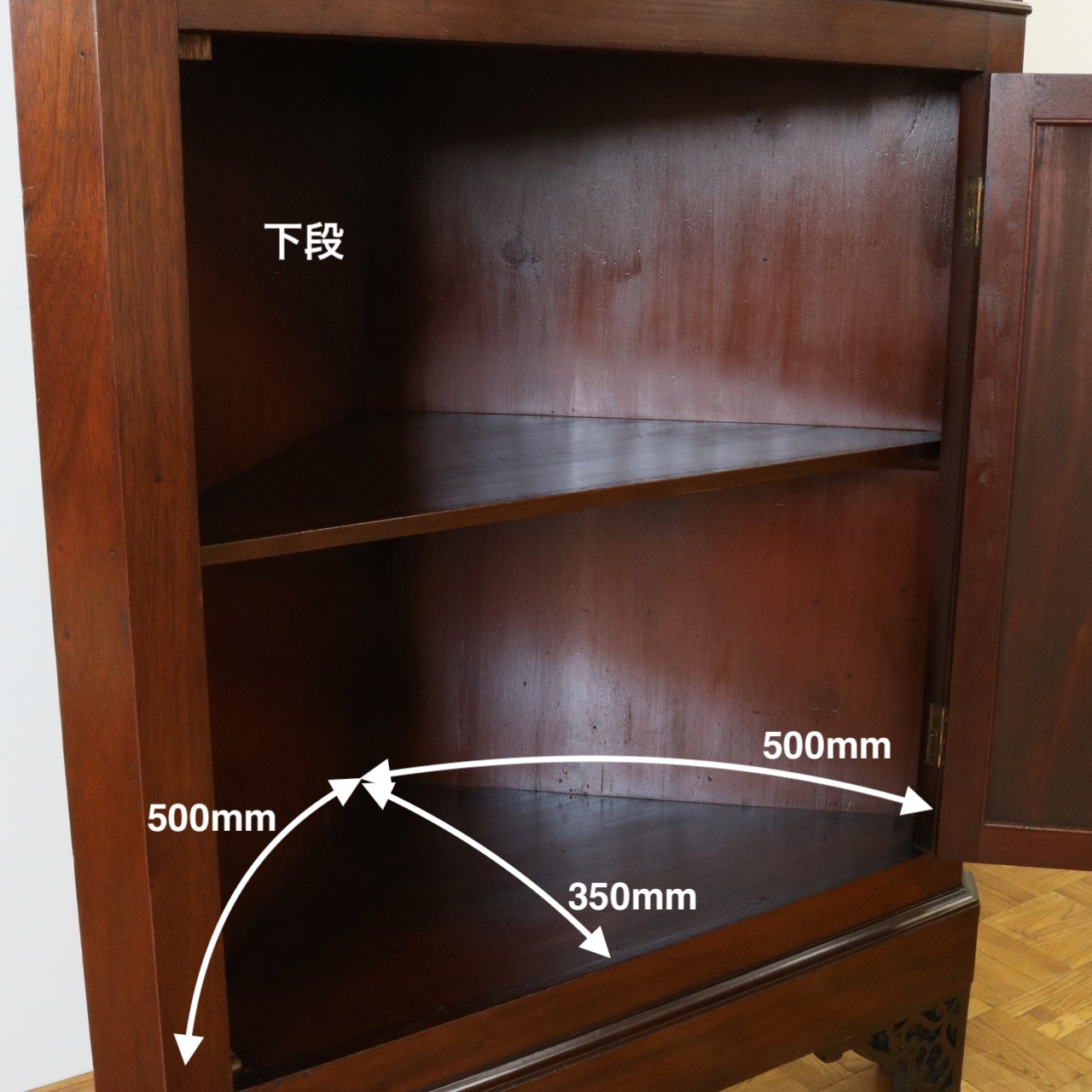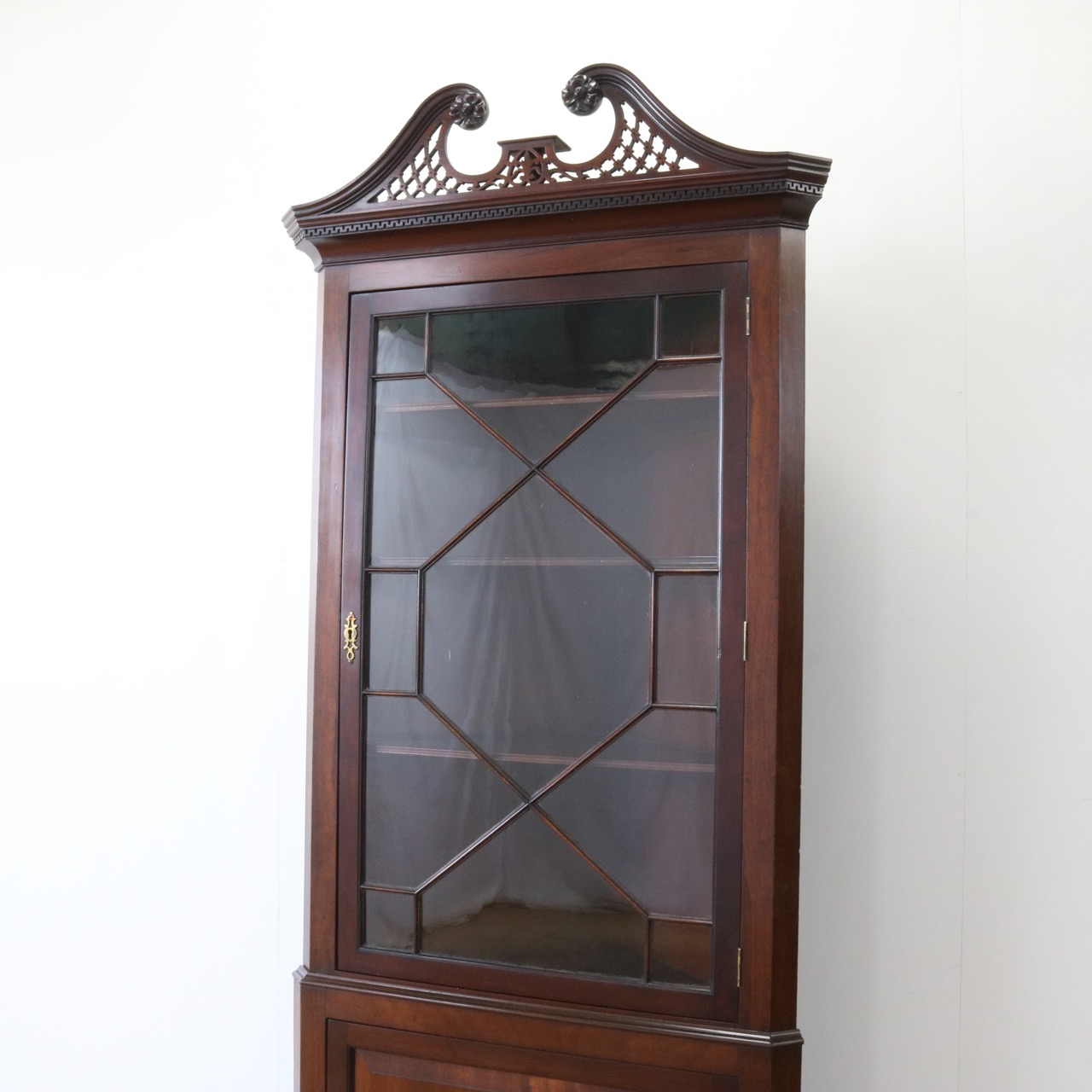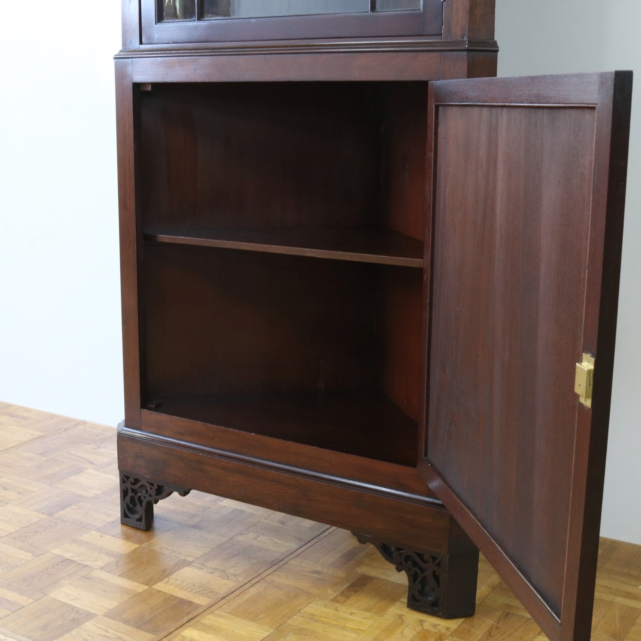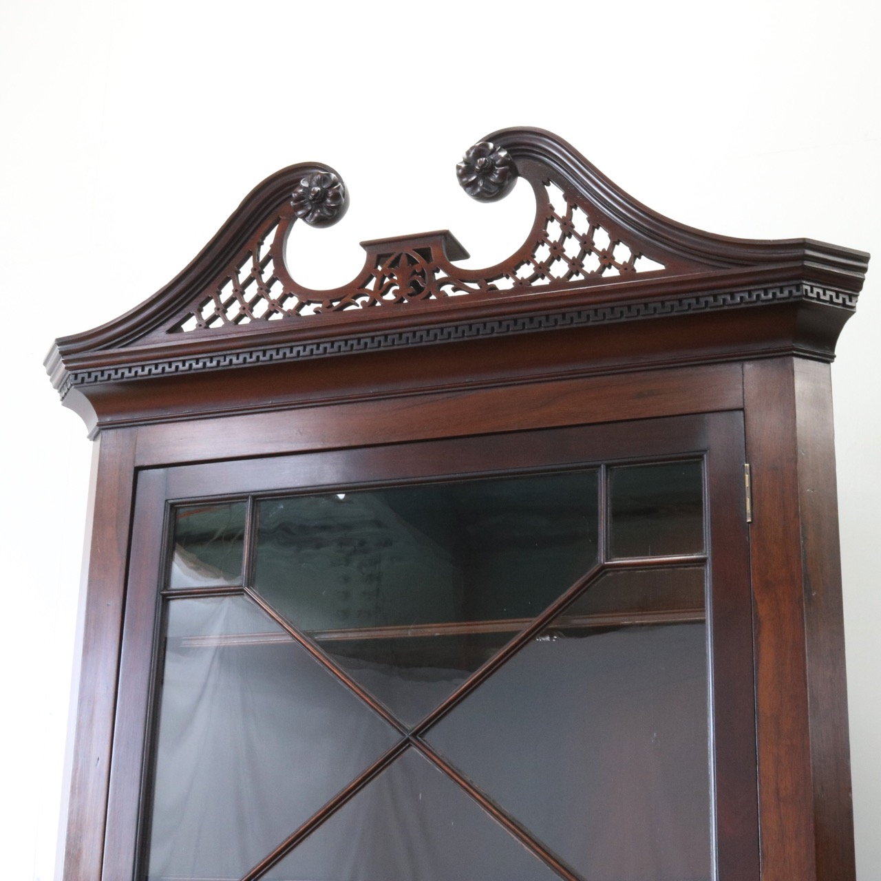 配送料の目安 ▶︎1930年代、マホガニーのコーナーキャビネット。扉の木桟とブロークンペディメントが華やかで洗練されたデザイン。コーナーを美しく彩るアイテムです。