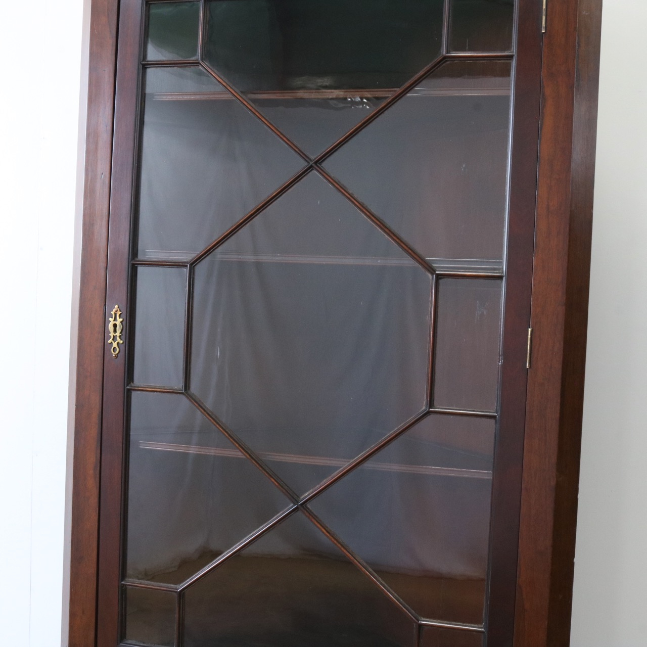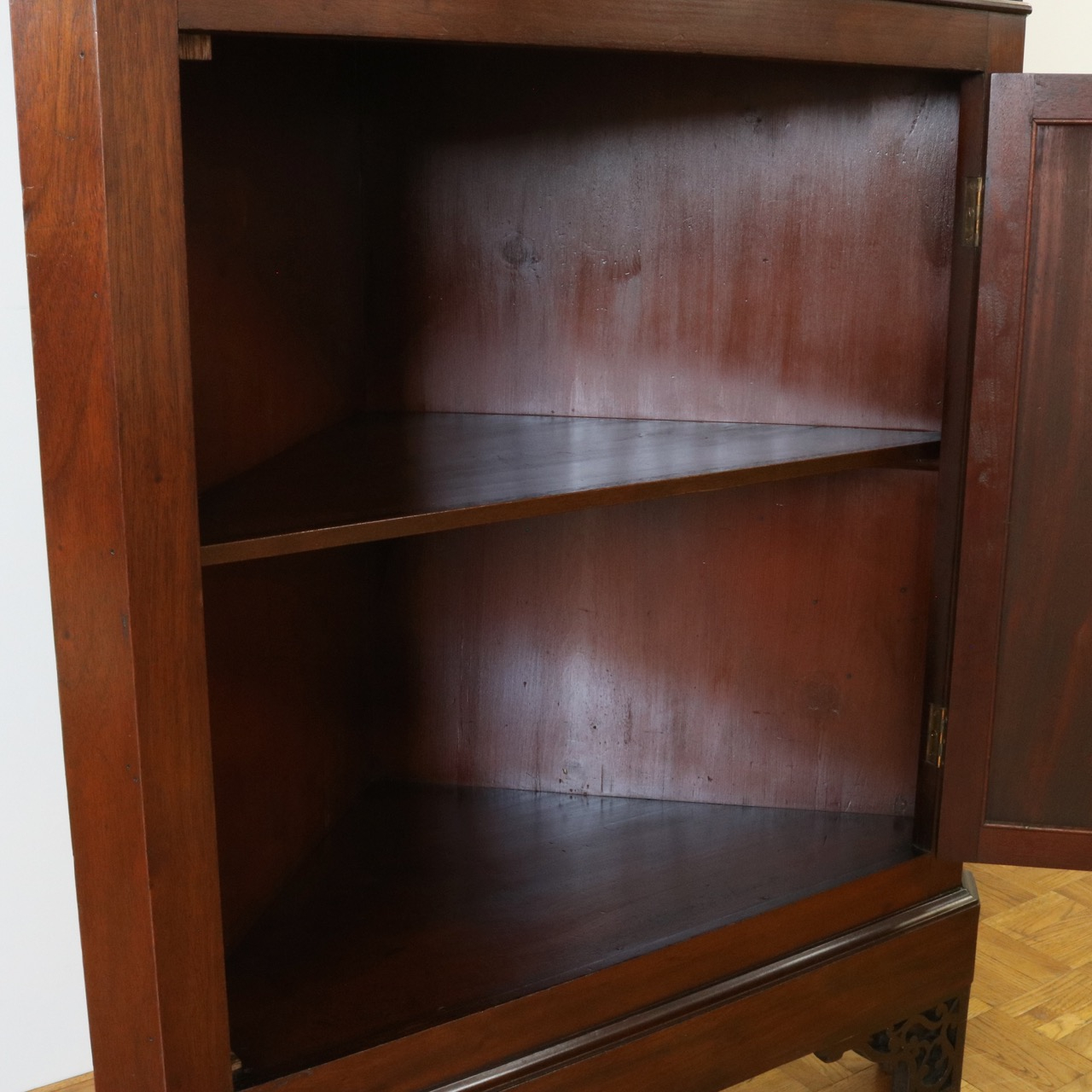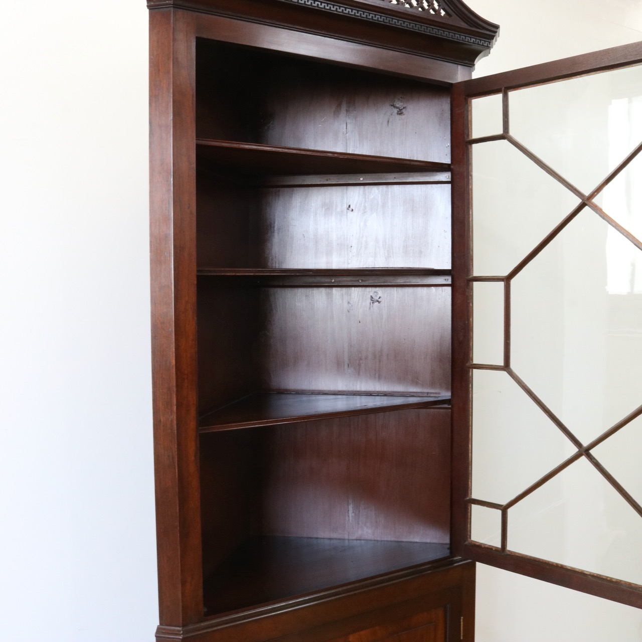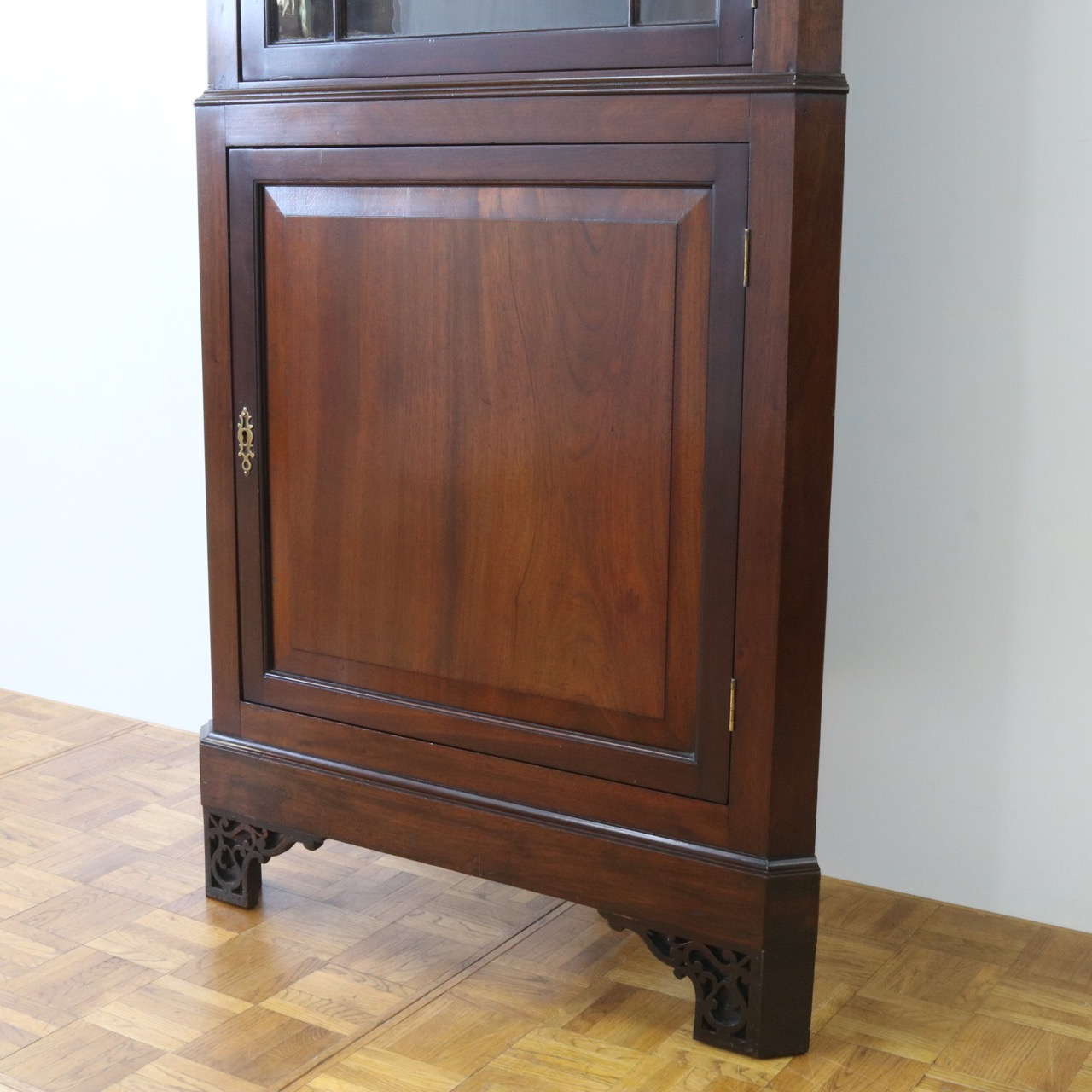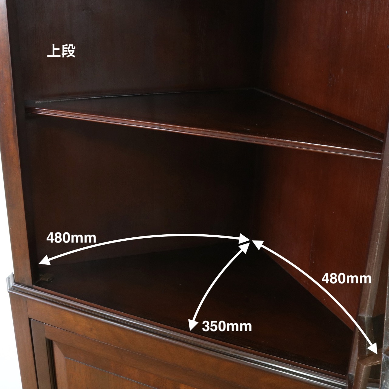 配送料の目安 ▶︎1930年代、マホガニーのコーナーキャビネット。扉の木桟とブロークンペディメントが華やかで洗練されたデザイン。コーナーを美しく彩るアイテムです。