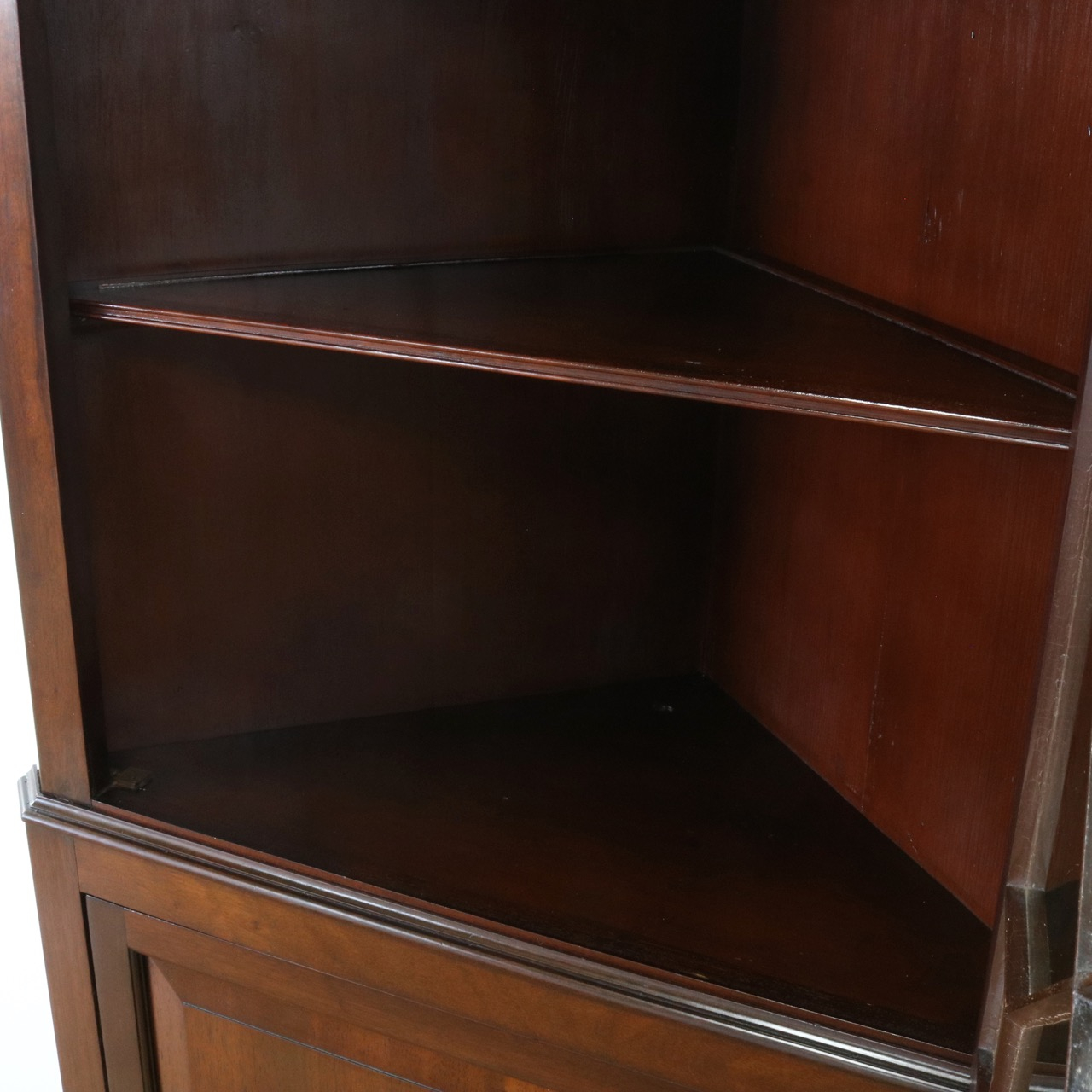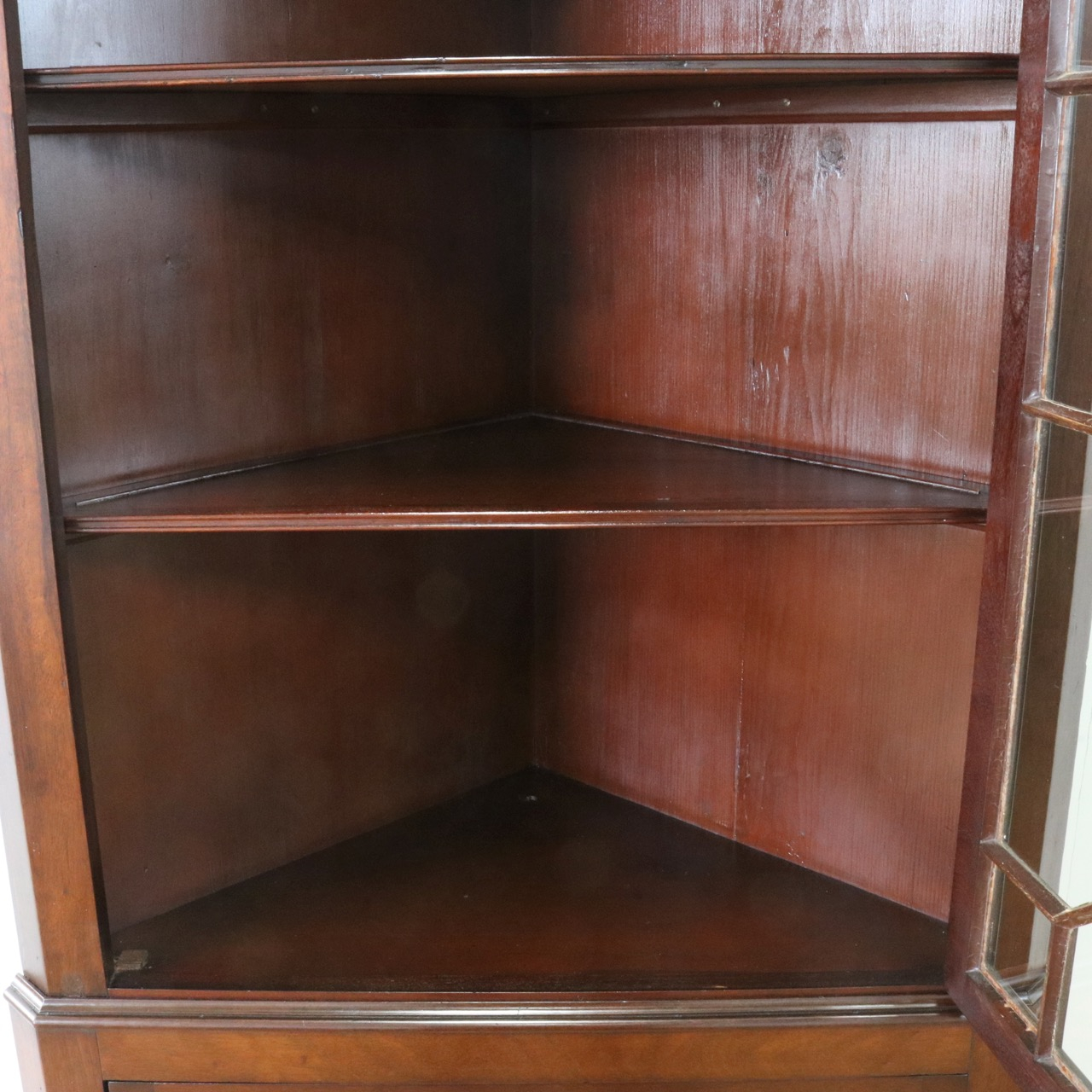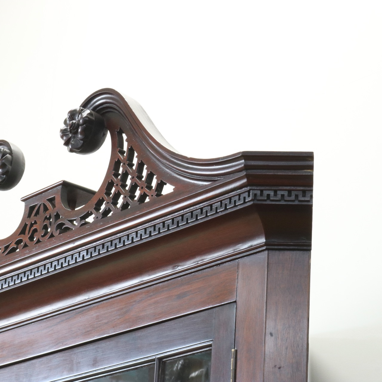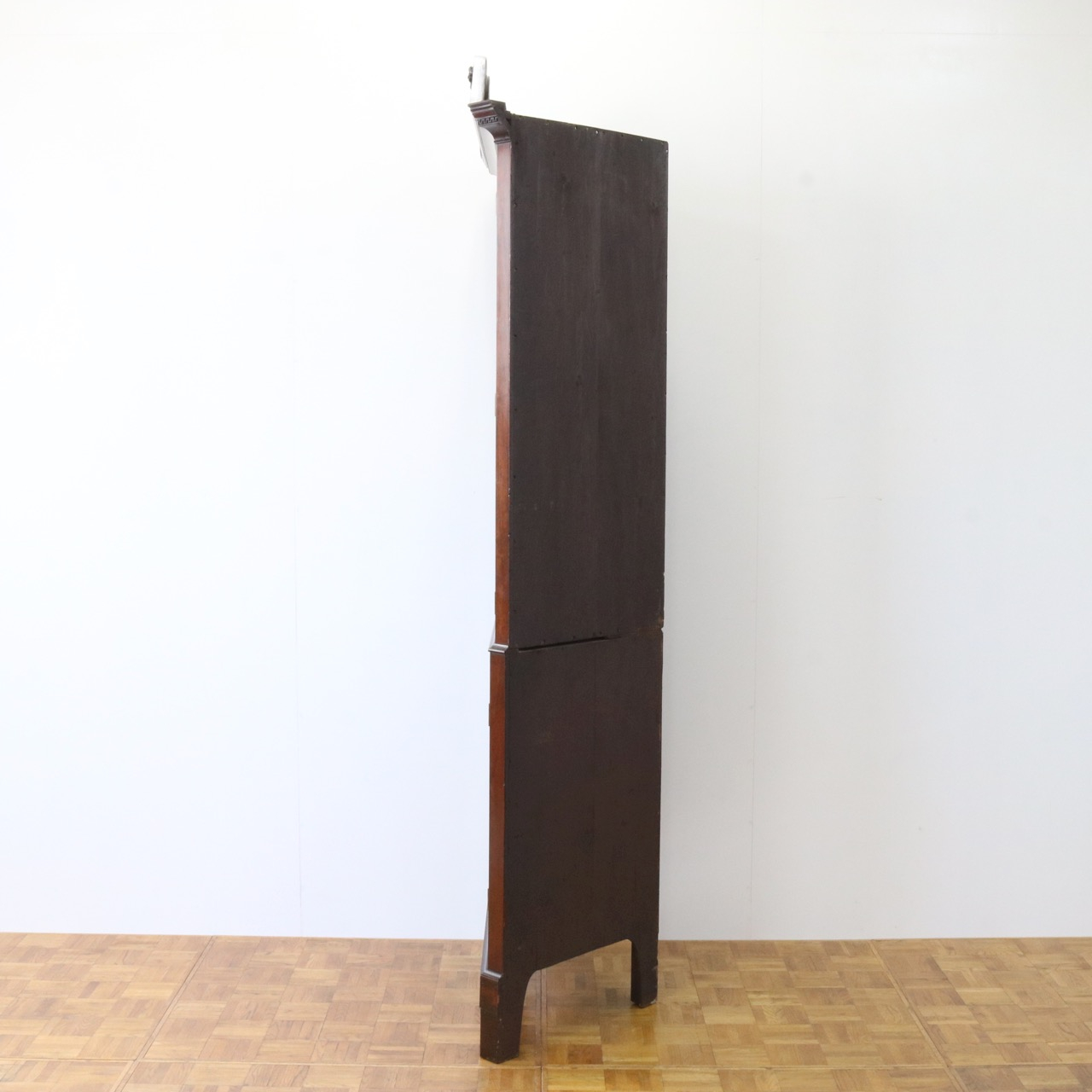 配送料の目安 ▶︎1930年代、マホガニーのコーナーキャビネット。扉の木桟とブロークンペディメントが華やかで洗練されたデザイン。コーナーを美しく彩るアイテムです。