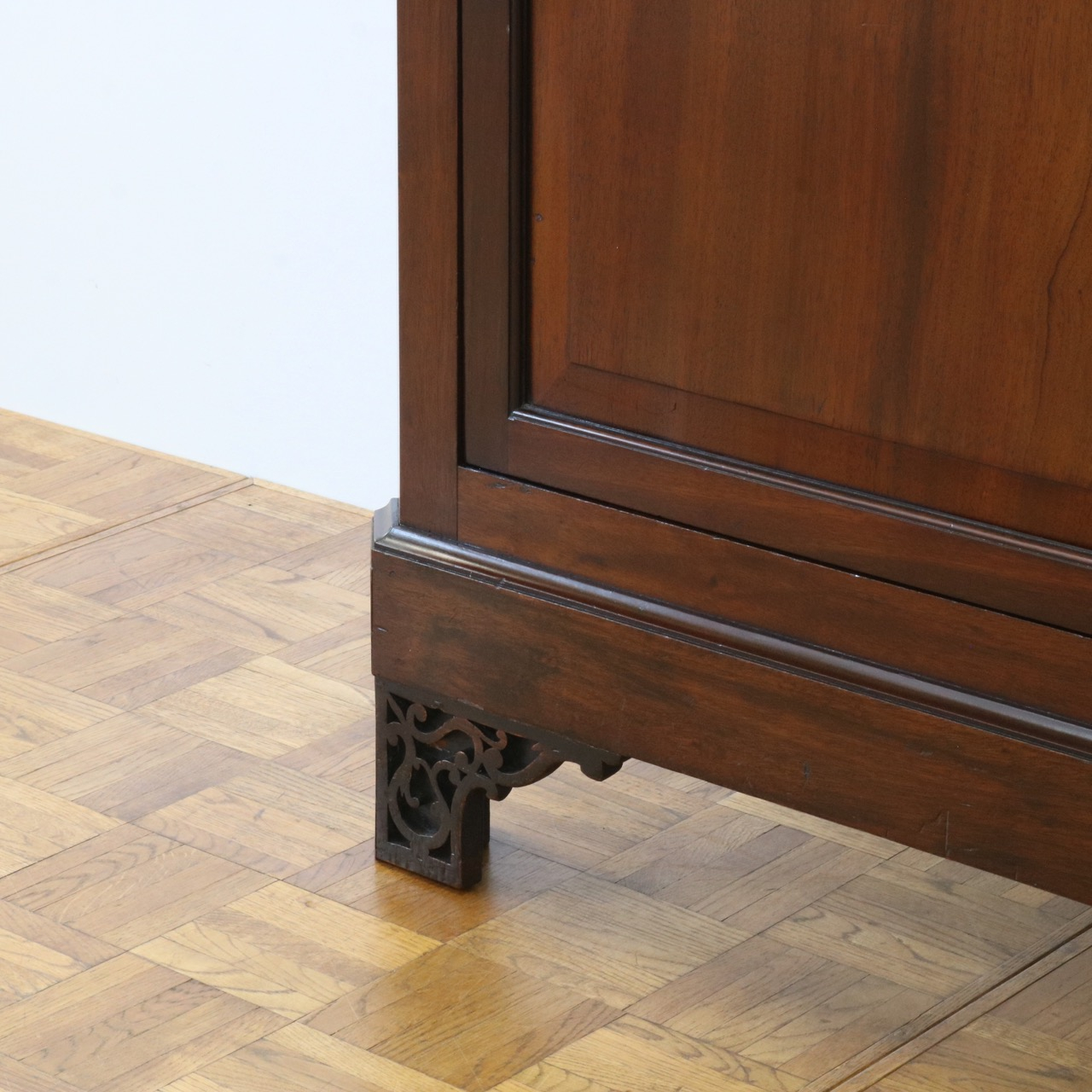 角で支えるブラケットフィートには優雅な文様が深く彫り出されています。繊細な技術です。
