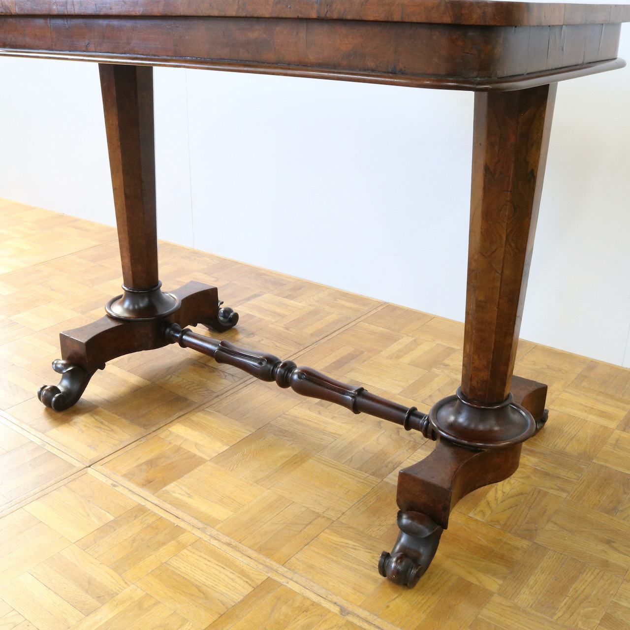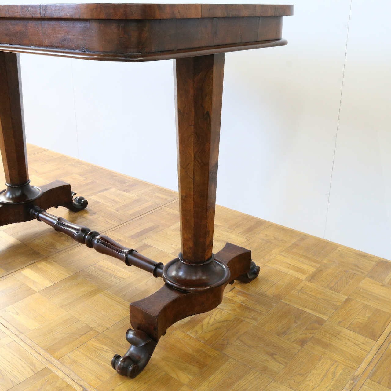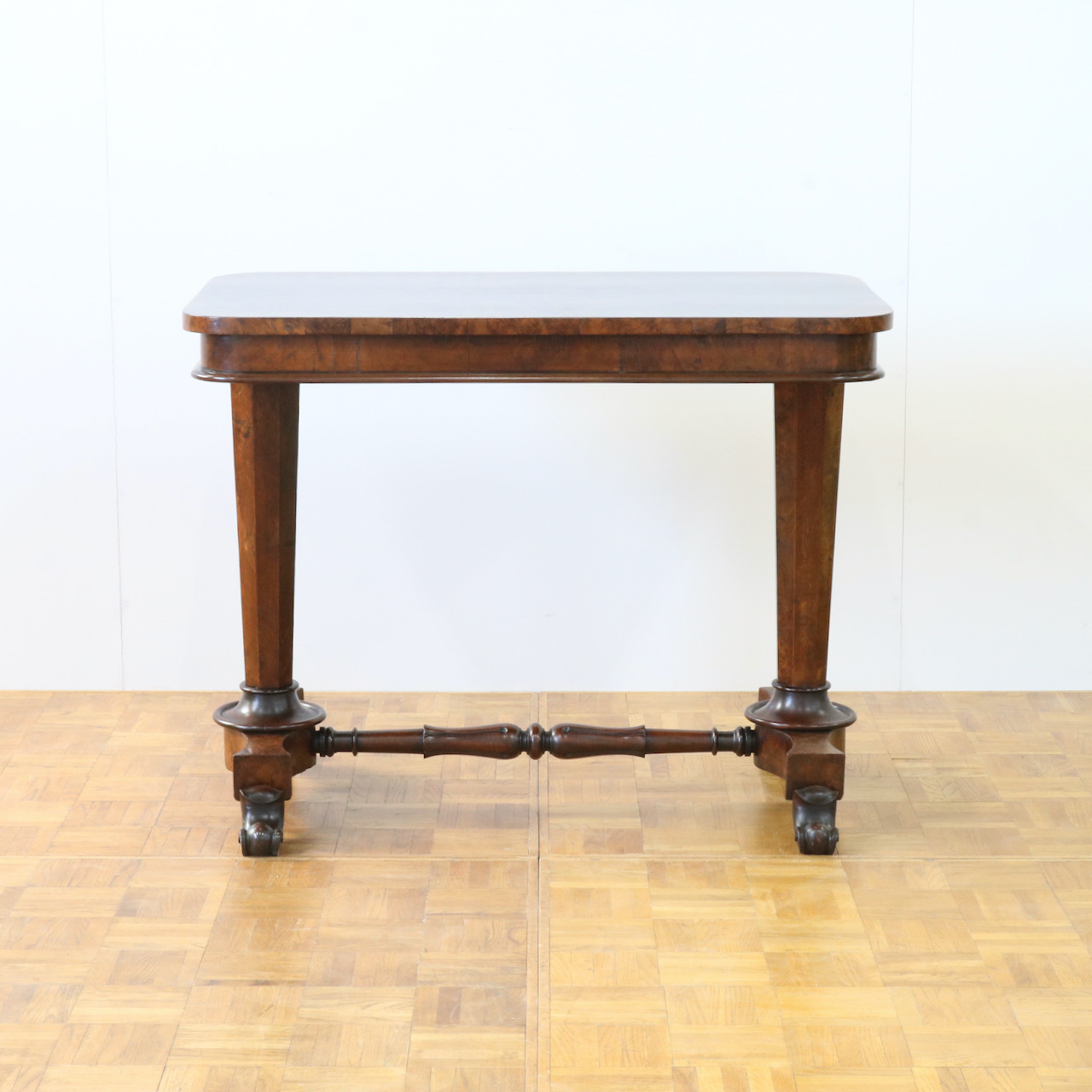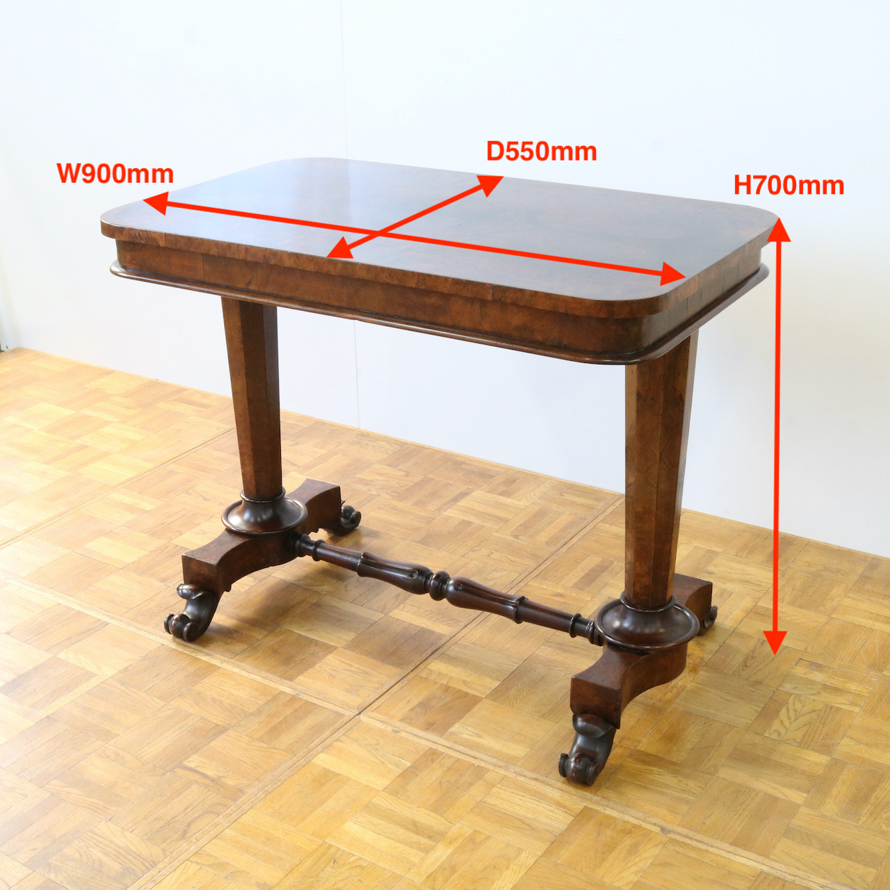 配送料の目安 ▶︎1890年代ヴィクトリアン期のサイドテーブル。木目模様が鮮やかなウォールナット材の化粧板が美しいお品です。幾何学的な脚の形と優美なスクロールデザインの脚先とのコントラストや、挽物装飾の施されたストレッチャーなど、見どころに溢れたテーブルです。