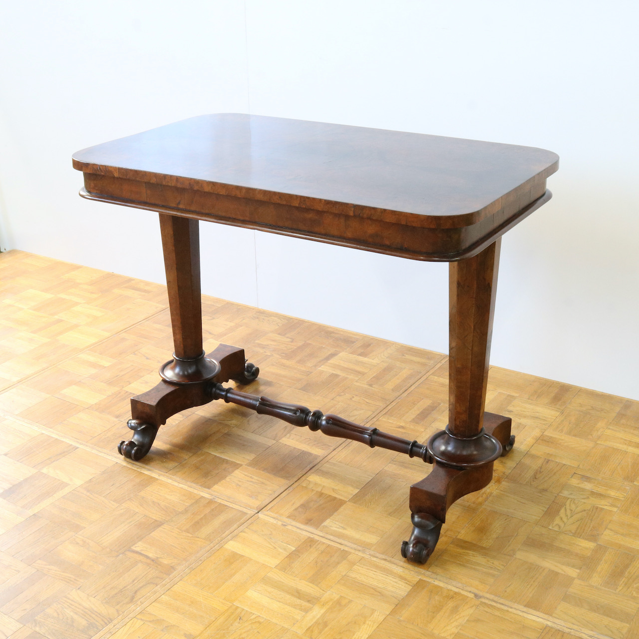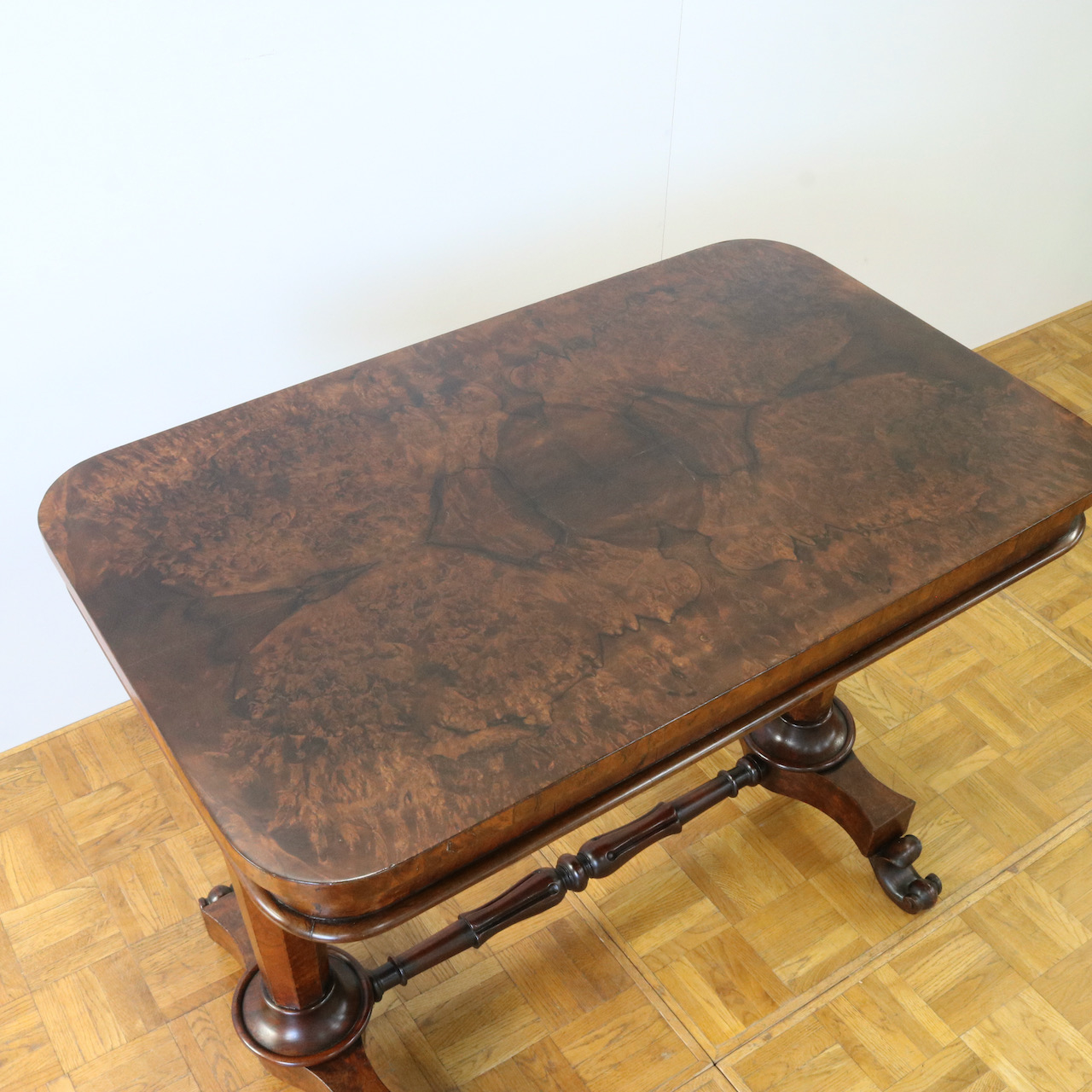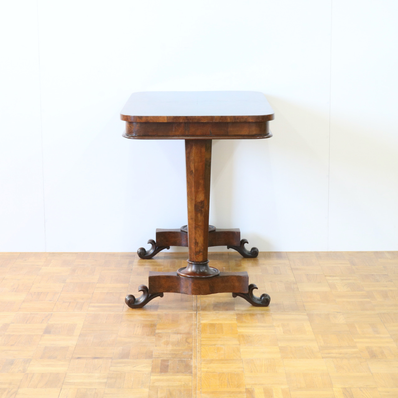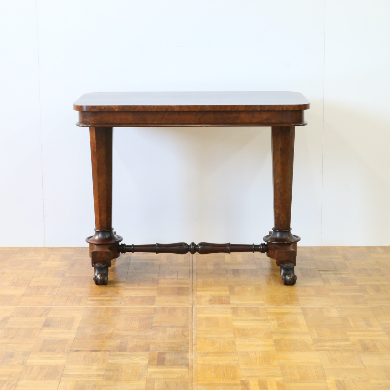 配送料の目安 ▶︎1890年代ヴィクトリアン期のサイドテーブル。木目模様が鮮やかなウォールナット材の化粧板が美しいお品です。幾何学的な脚の形と優美なスクロールデザインの脚先とのコントラストや、挽物装飾の施されたストレッチャーなど、見どころに溢れたテーブルです。