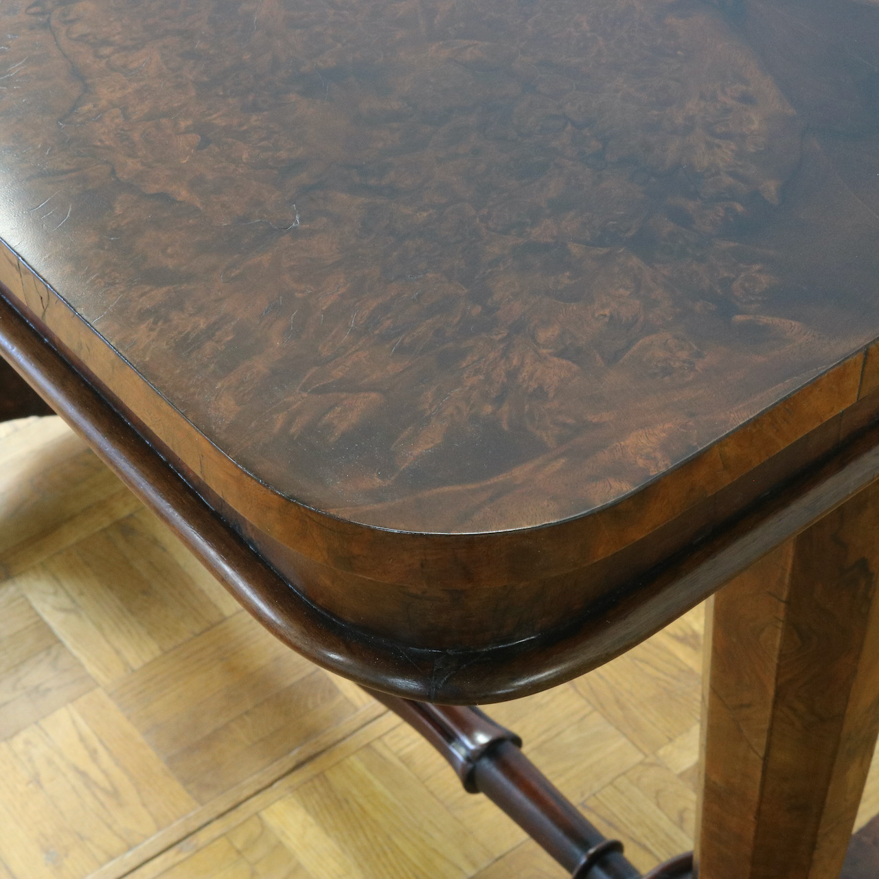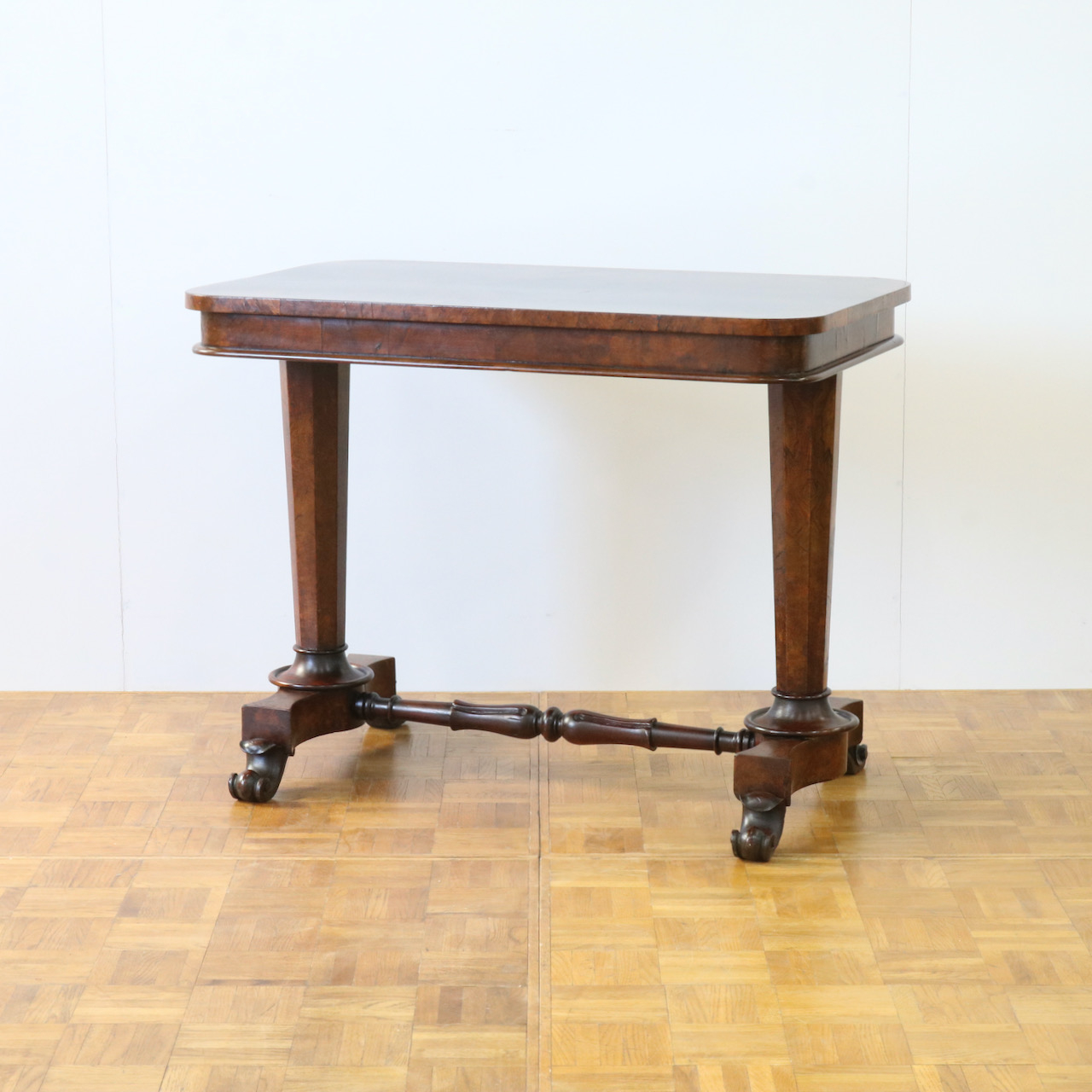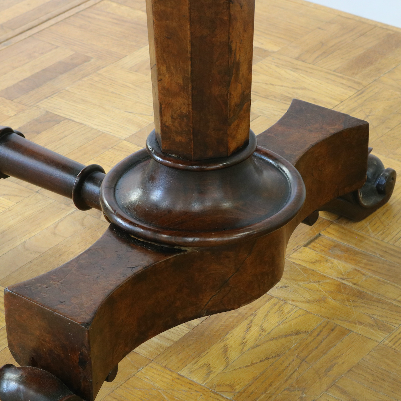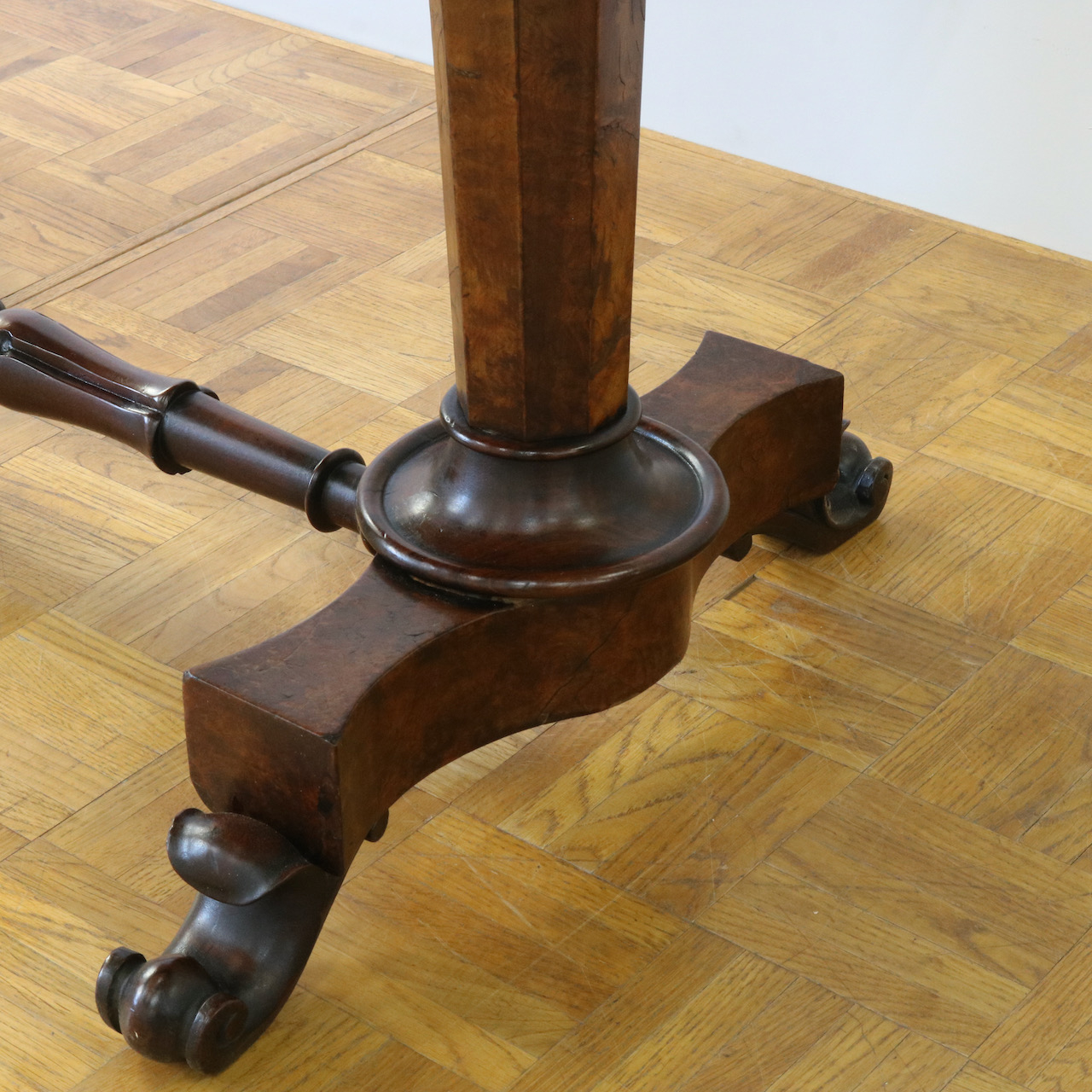 配送料の目安 ▶︎1890年代ヴィクトリアン期のサイドテーブル。木目模様が鮮やかなウォールナット材の化粧板が美しいお品です。幾何学的な脚の形と優美なスクロールデザインの脚先とのコントラストや、挽物装飾の施されたストレッチャーなど、見どころに溢れたテーブルです。