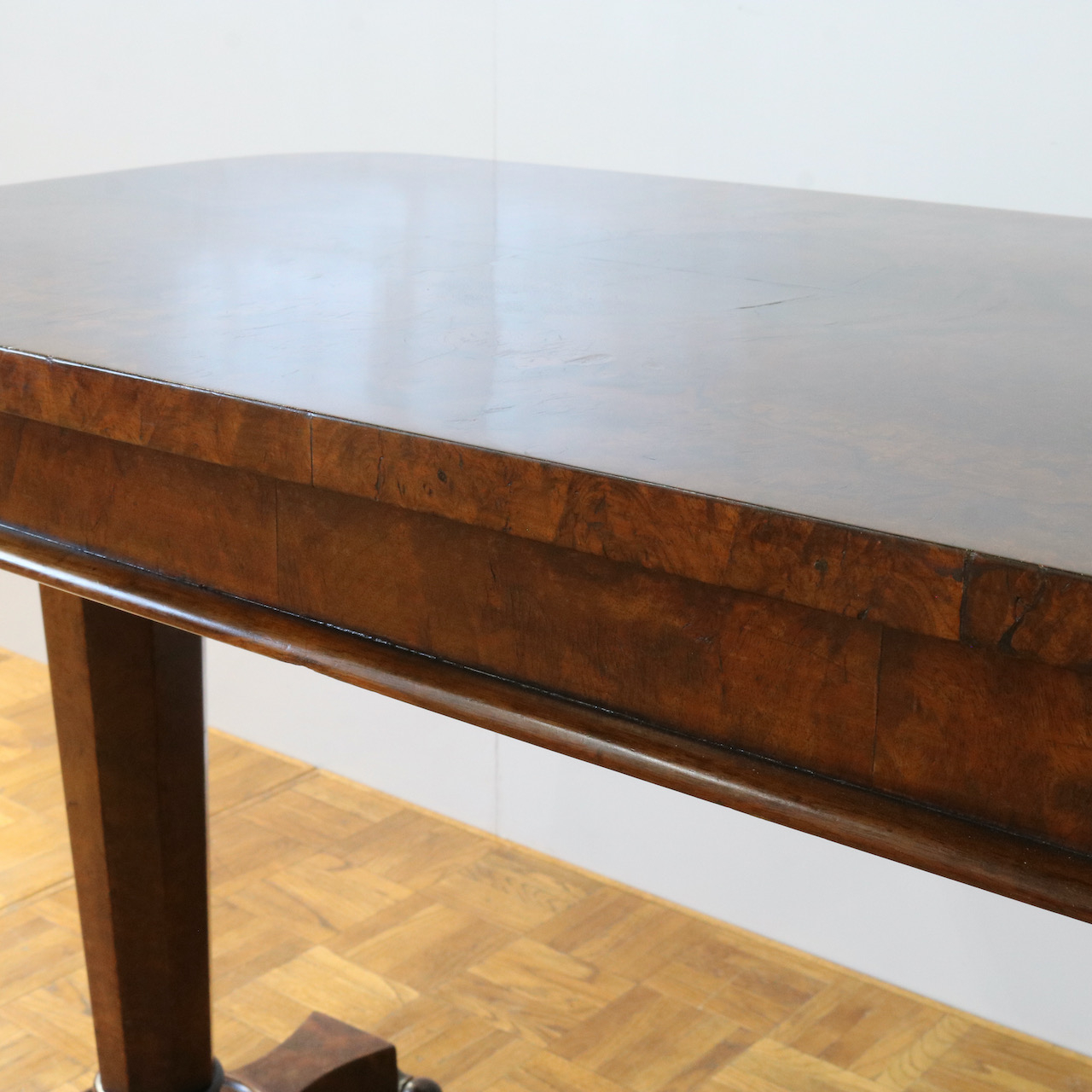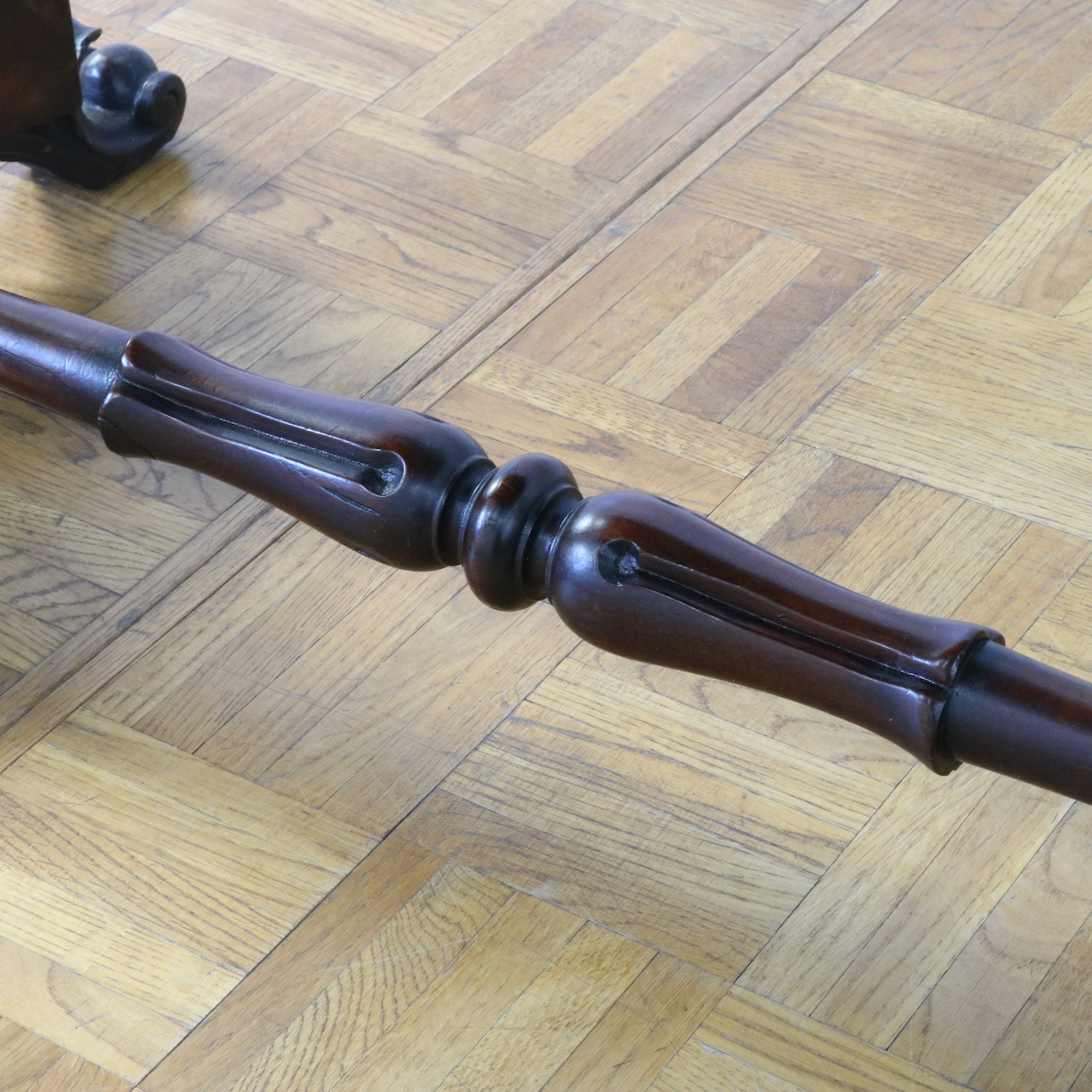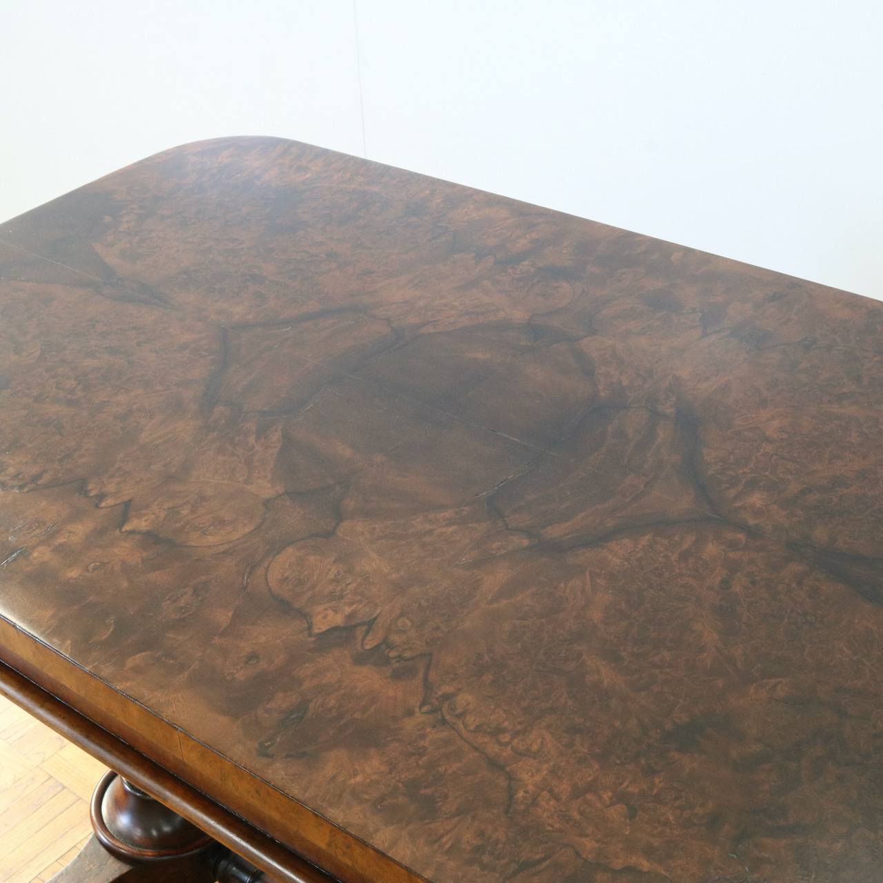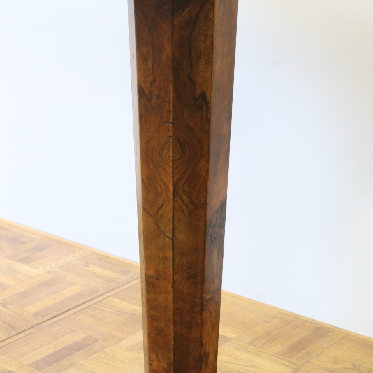 配送料の目安 ▶︎1890年代ヴィクトリアン期のサイドテーブル。木目模様が鮮やかなウォールナット材の化粧板が美しいお品です。幾何学的な脚の形と優美なスクロールデザインの脚先とのコントラストや、挽物装飾の施されたストレッチャーなど、見どころに溢れたテーブルです。