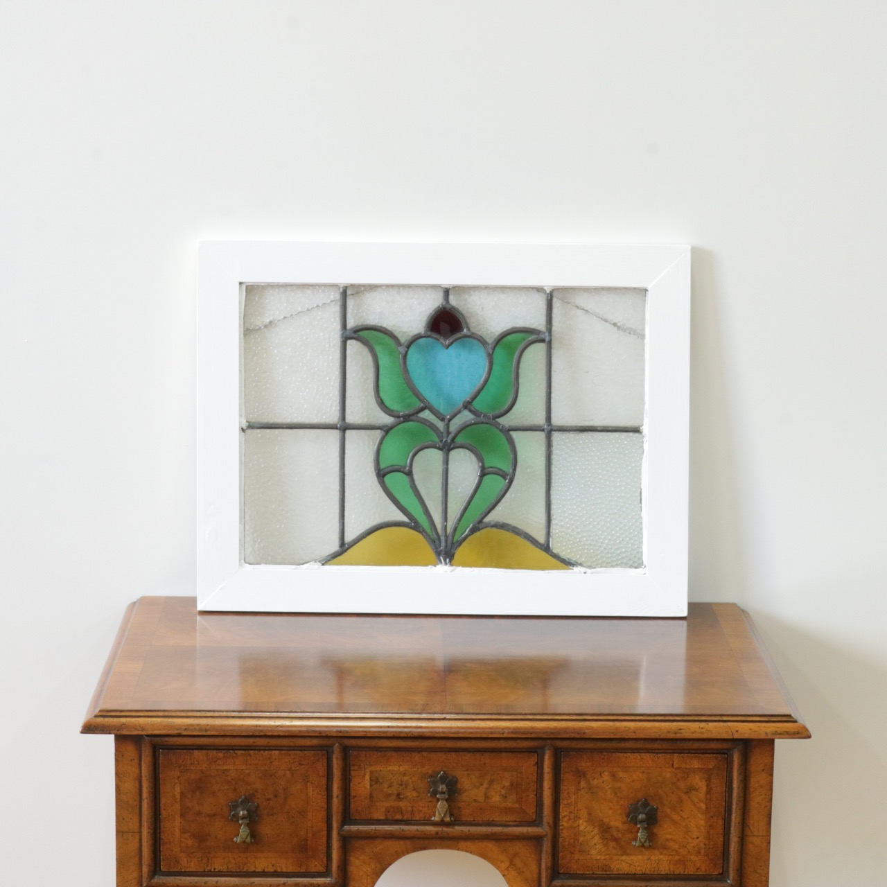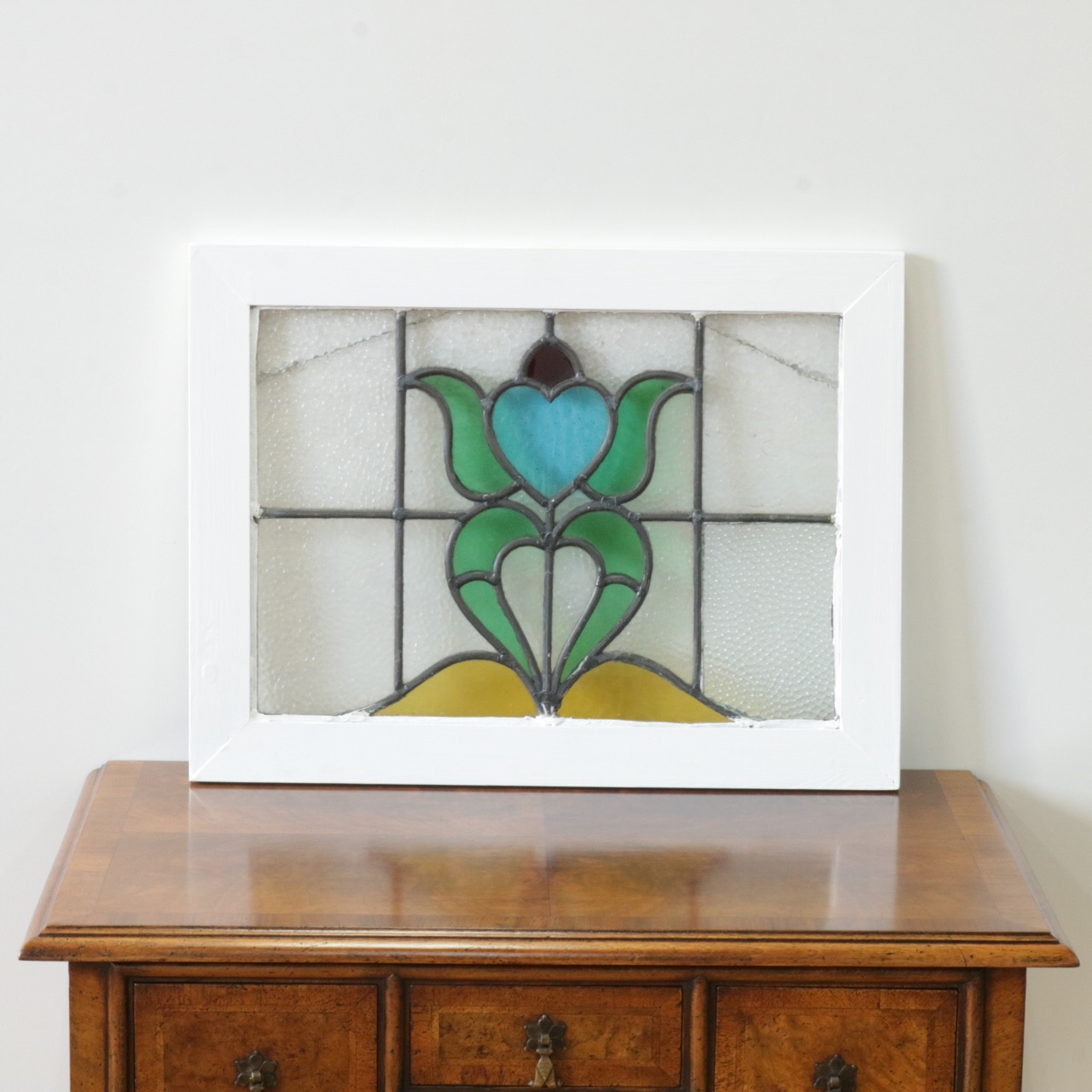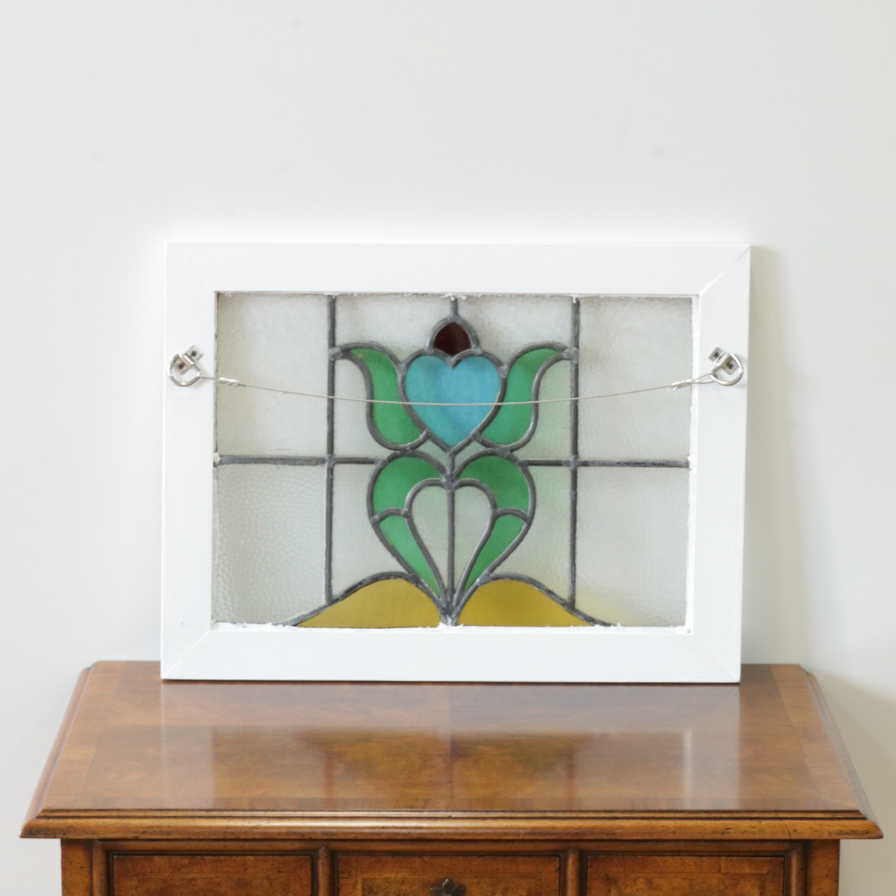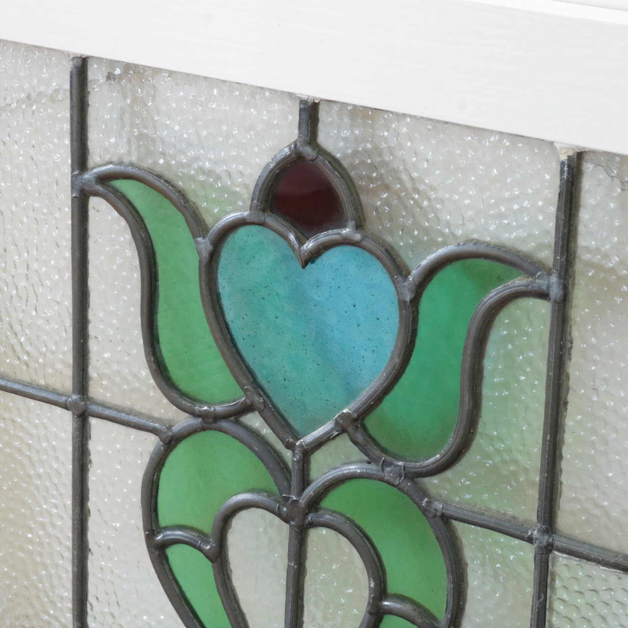 ブルーのハートが目を引くステンドグラス。爽やかな色合いが涼し気です。