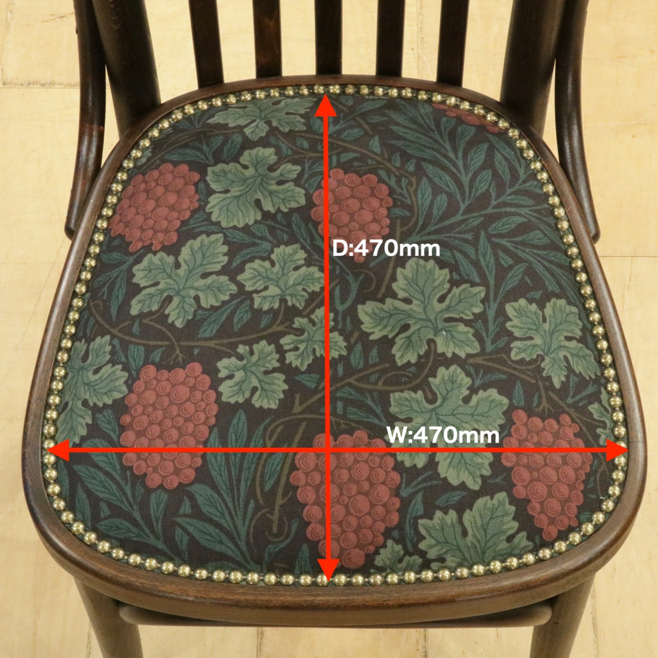 座面生地はウィリアム・モリスのヴァインで張りました。1873年にモリスにより壁紙としてデザインされ、葡萄の房がゆらゆら揺れて繊細な蔓が伸びていくパターン。柳の葉模様の背景と絶妙に組み合わせられ引き立てられています。