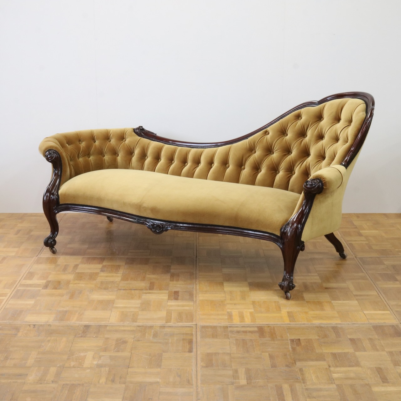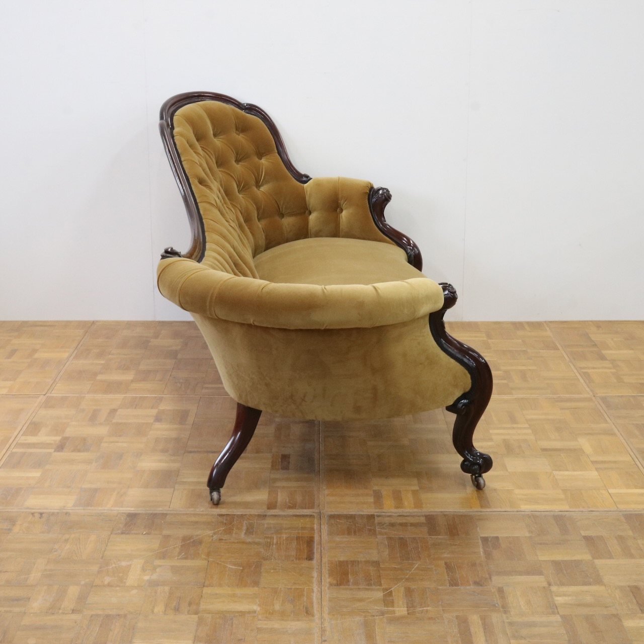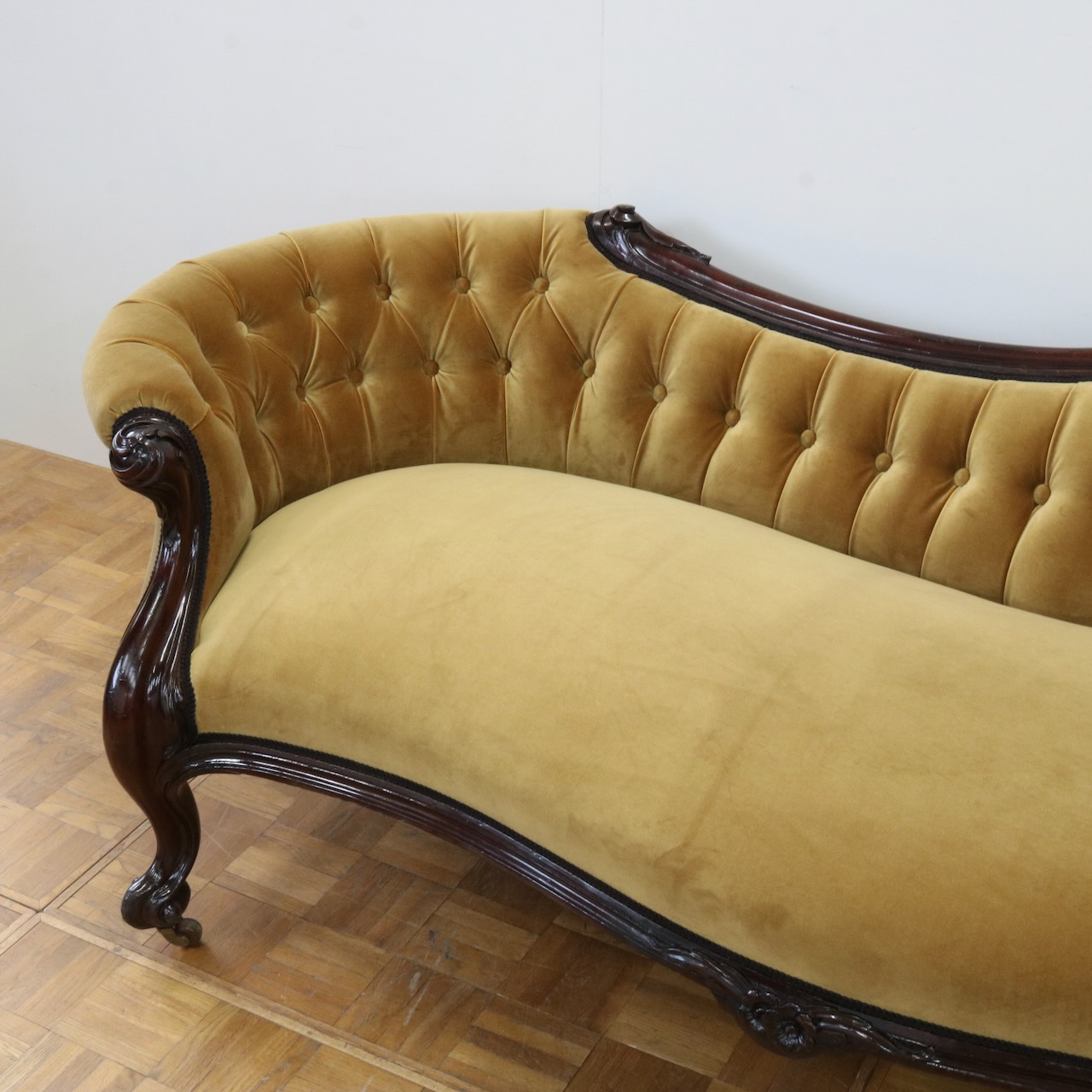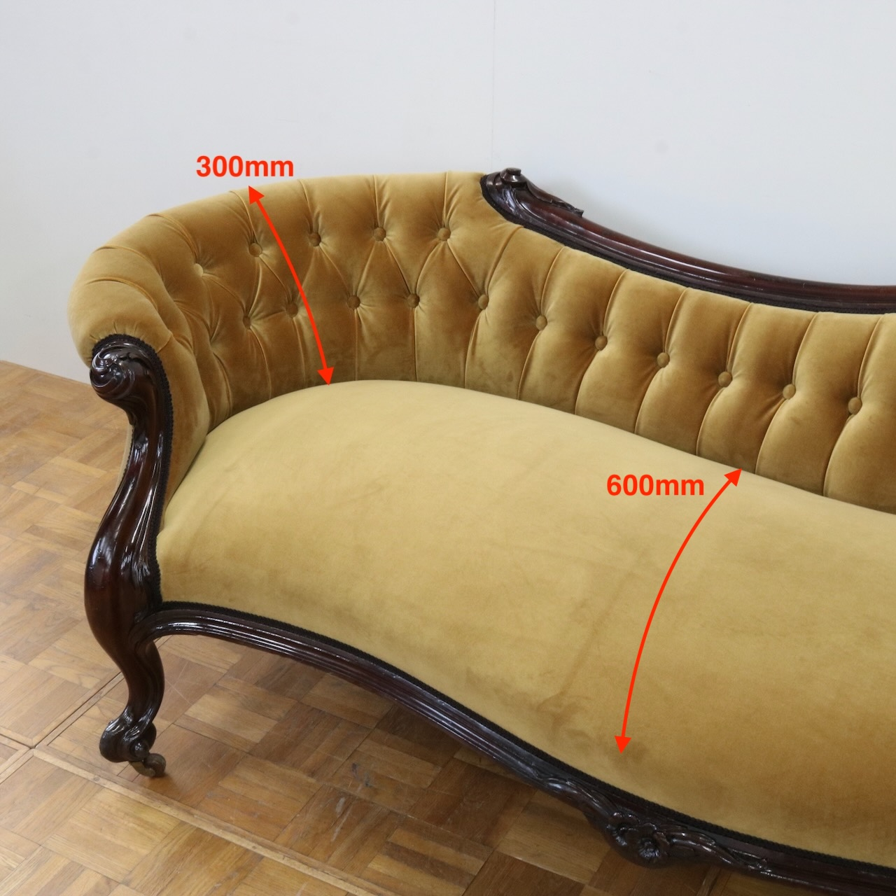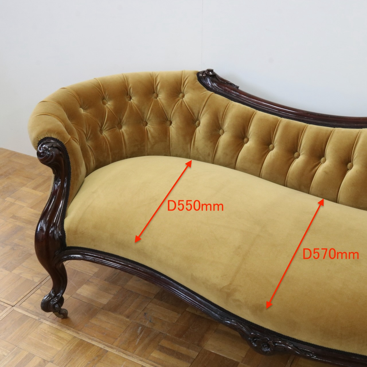 1890年代ヴィクトリアン期、ウォールナット材のカウチ。ゆったりと身を預けられる背もたれのカーブが優美で、エレガントな空間の主役になれる家具です。