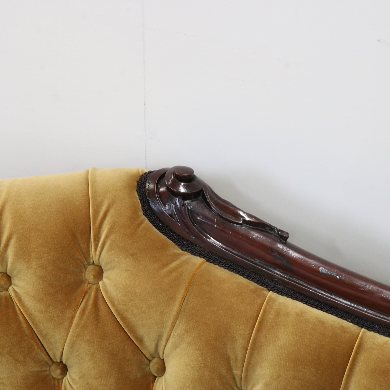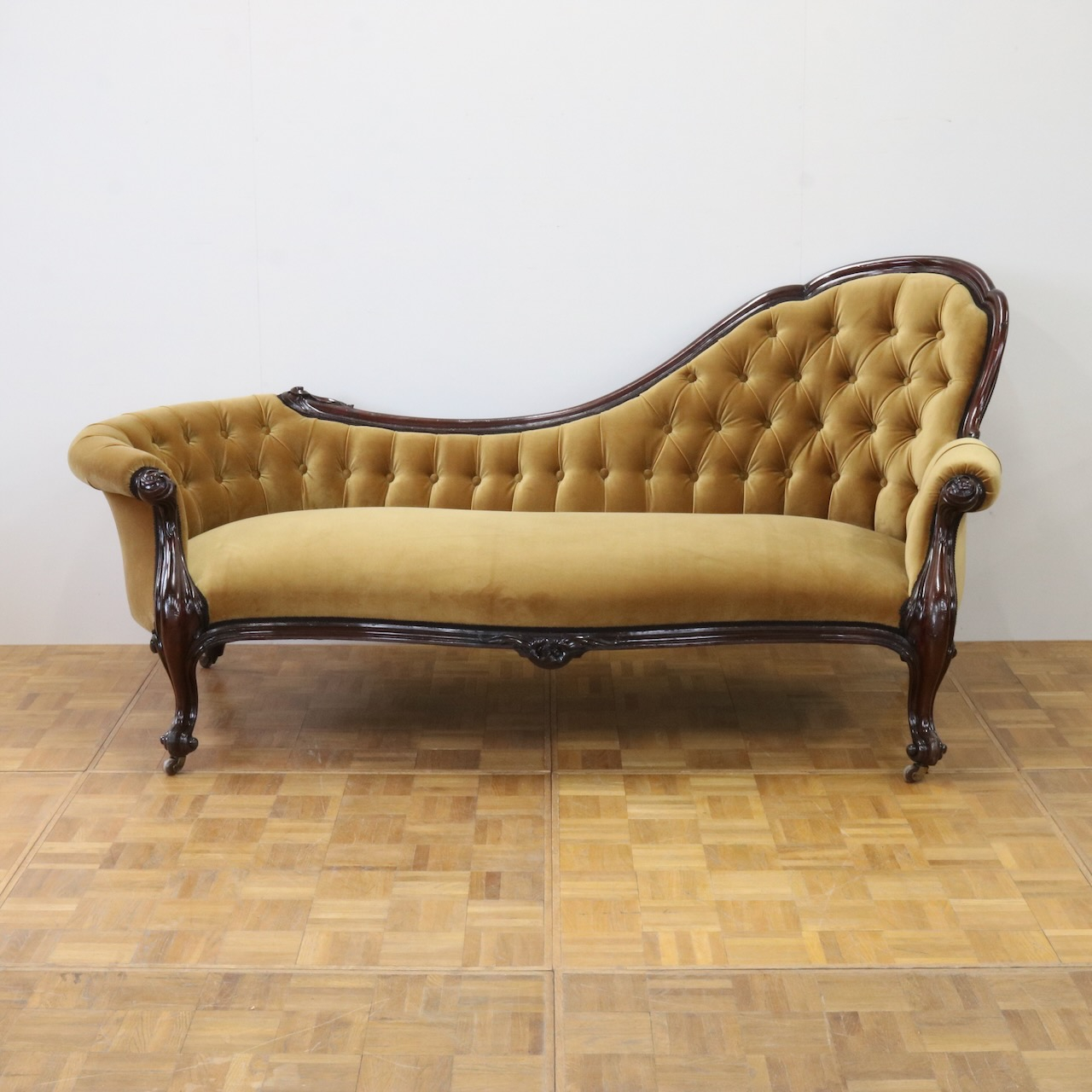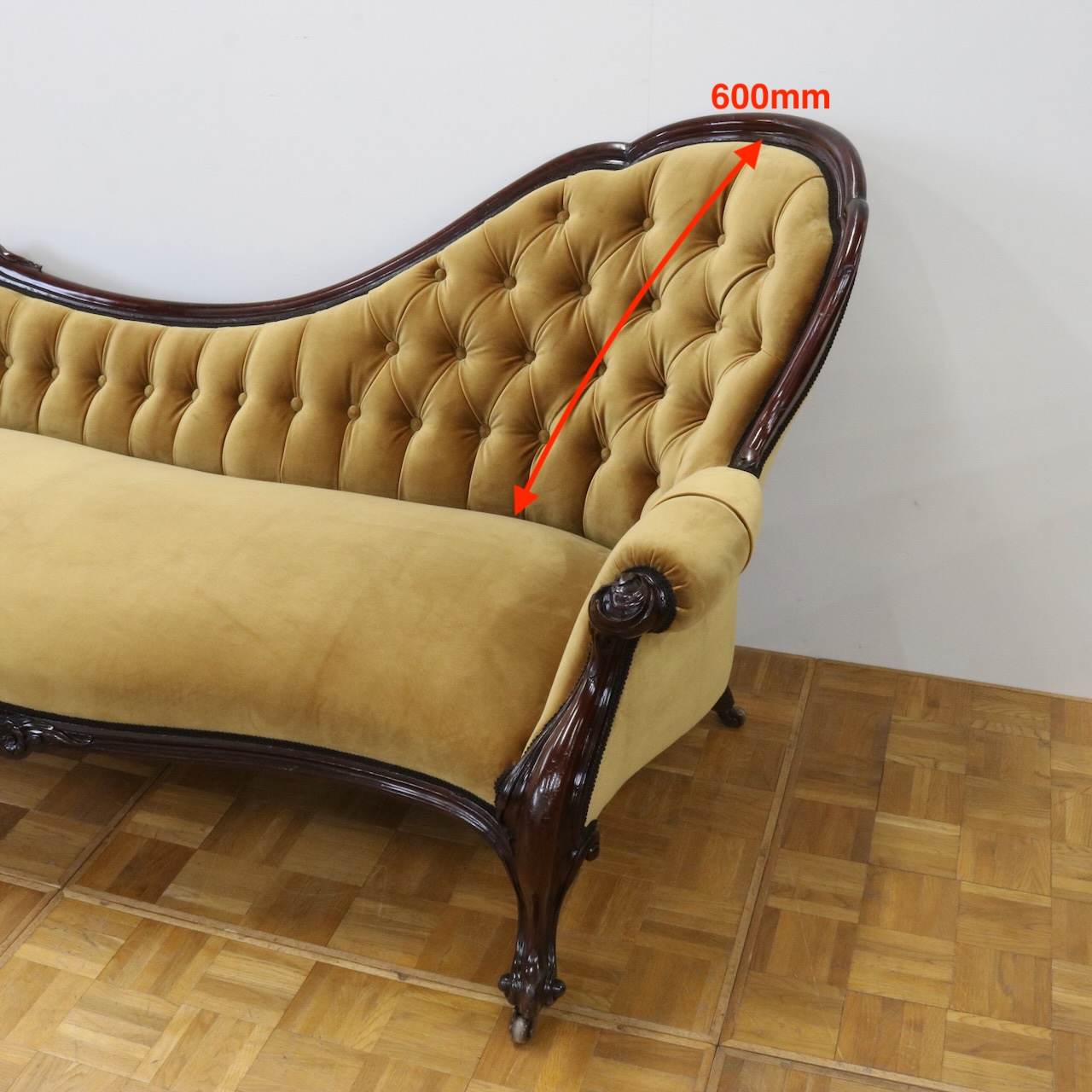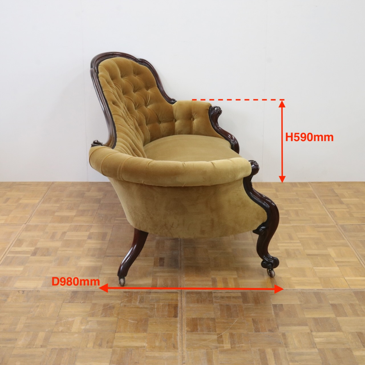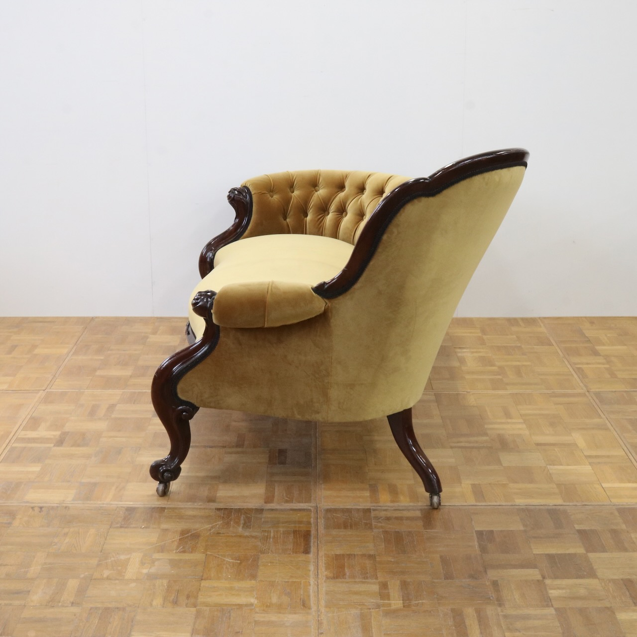 1890年代ヴィクトリアン期、ウォールナット材のカウチ。ゆったりと身を預けられる背もたれのカーブが優美で、エレガントな空間の主役になれる家具です。