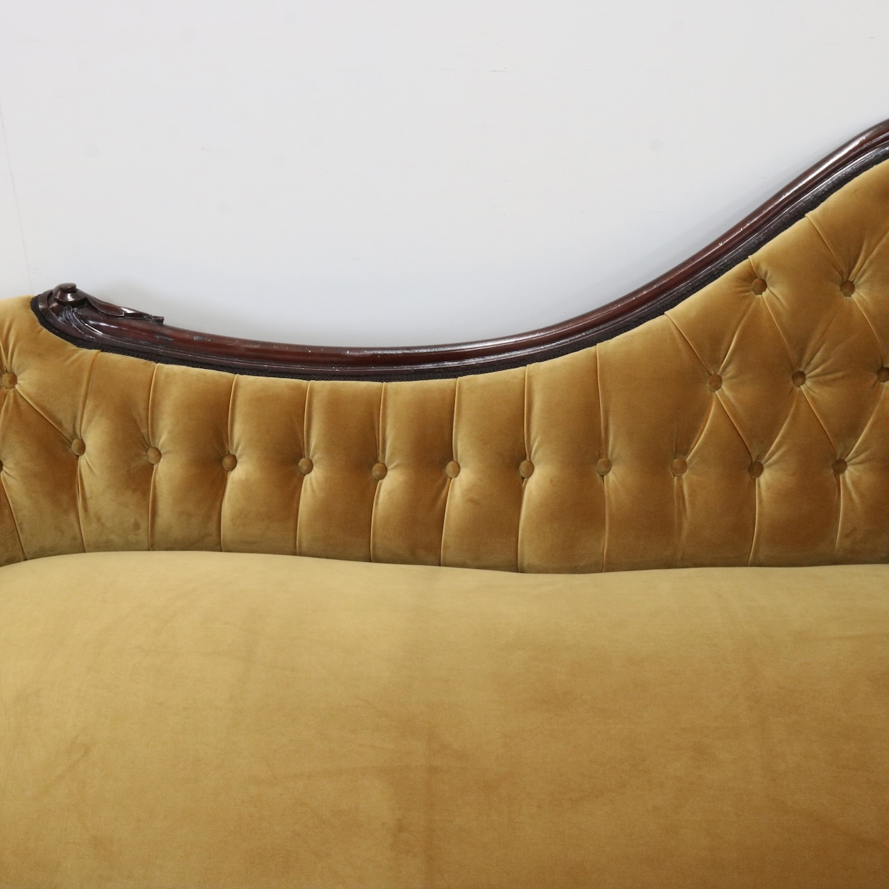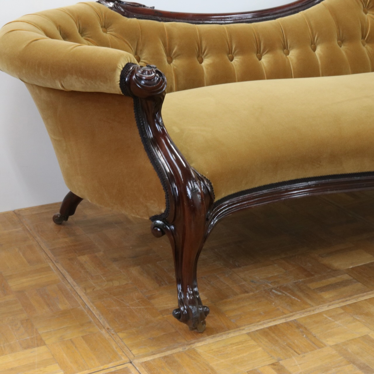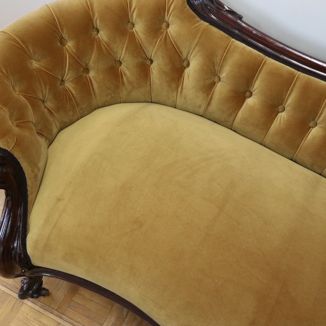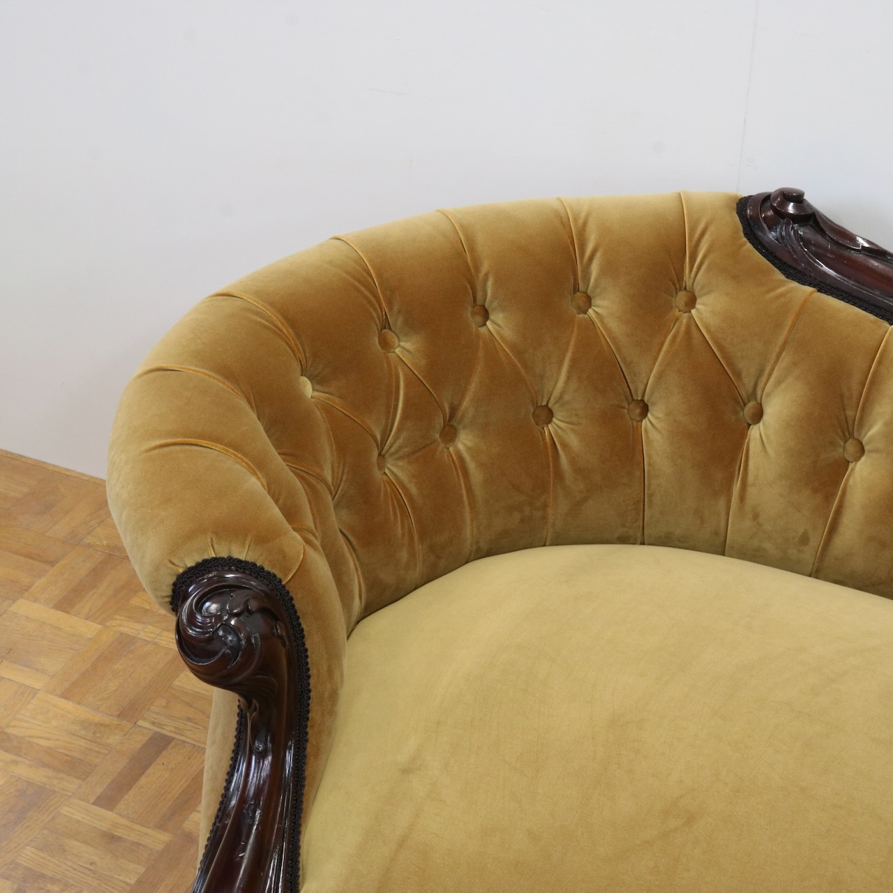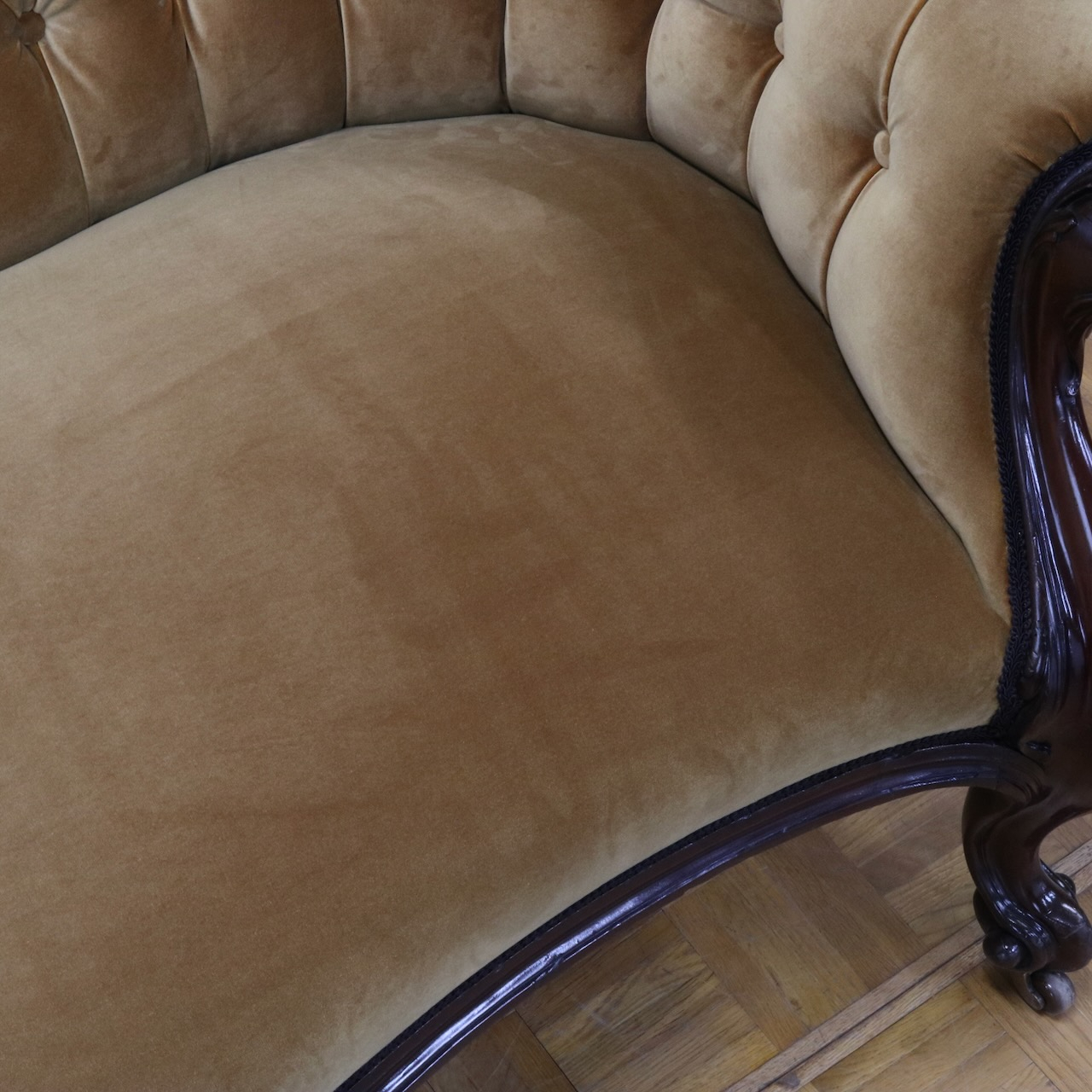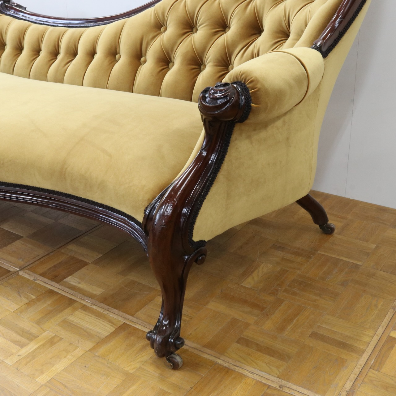 1890年代ヴィクトリアン期、ウォールナット材のカウチ。ゆったりと身を預けられる背もたれのカーブが優美で、エレガントな空間の主役になれる家具です。