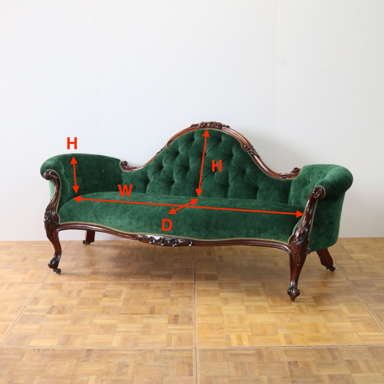 1890年代ヴィクトリアン、ローズウッドのカウチ。フラワーモチーフがアクセントに施されたエレガントな佇まいで、ゆったりとお座りいただけます。リビングの中心を華やかに、団欒の時を豊かにしてくれるカウチです。