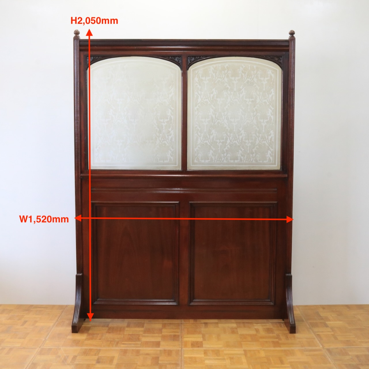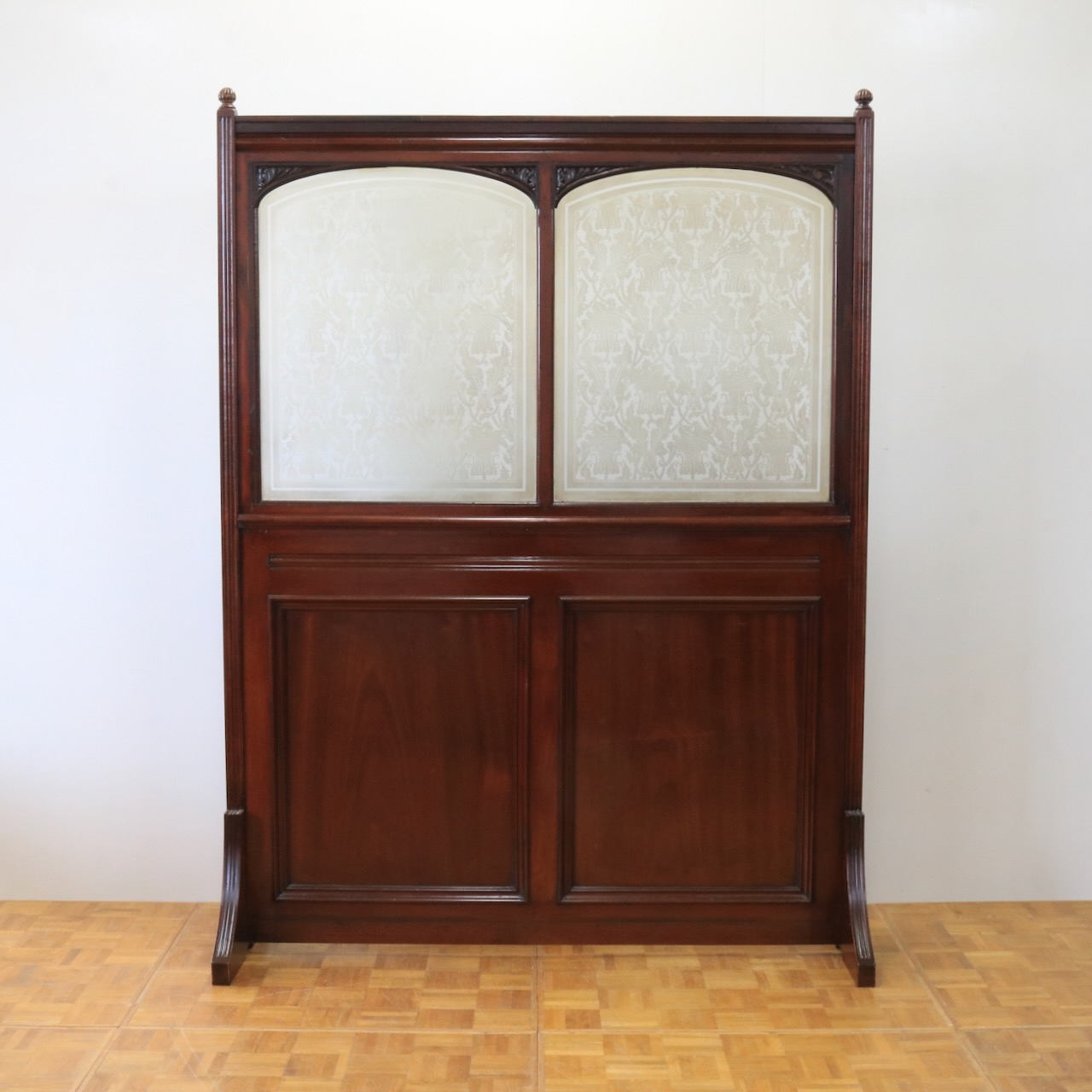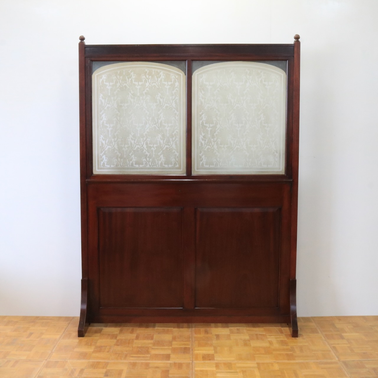 1880年代のマホガニーのパーツとステンドグラスに脚部を取り付けて製作したパーティション。