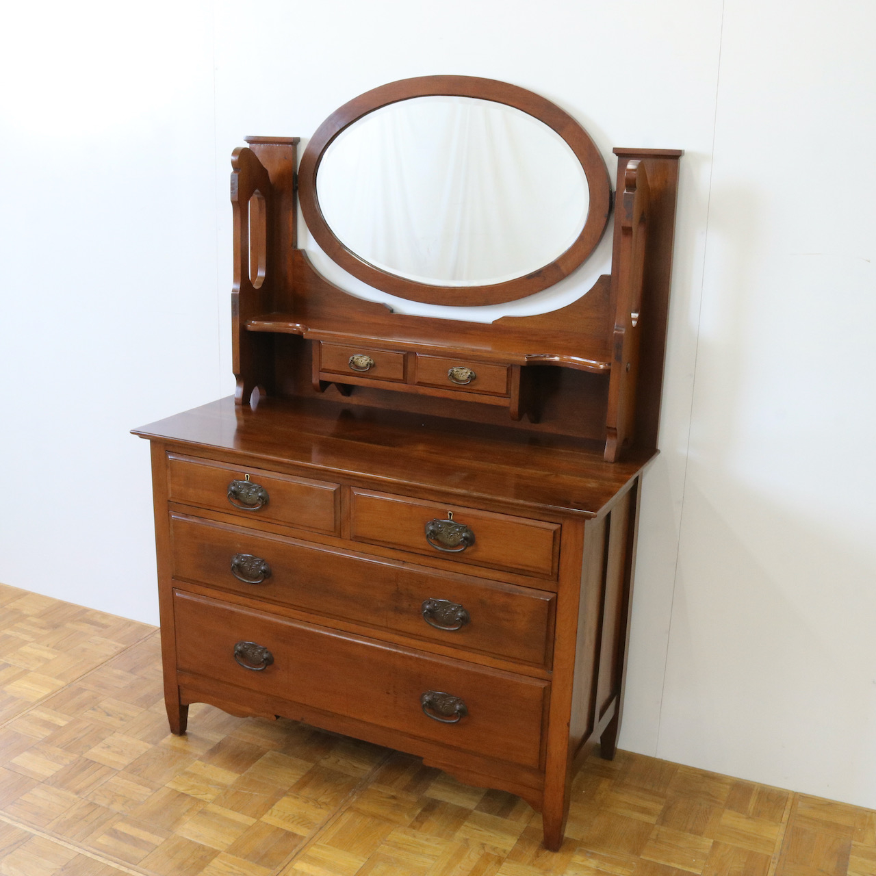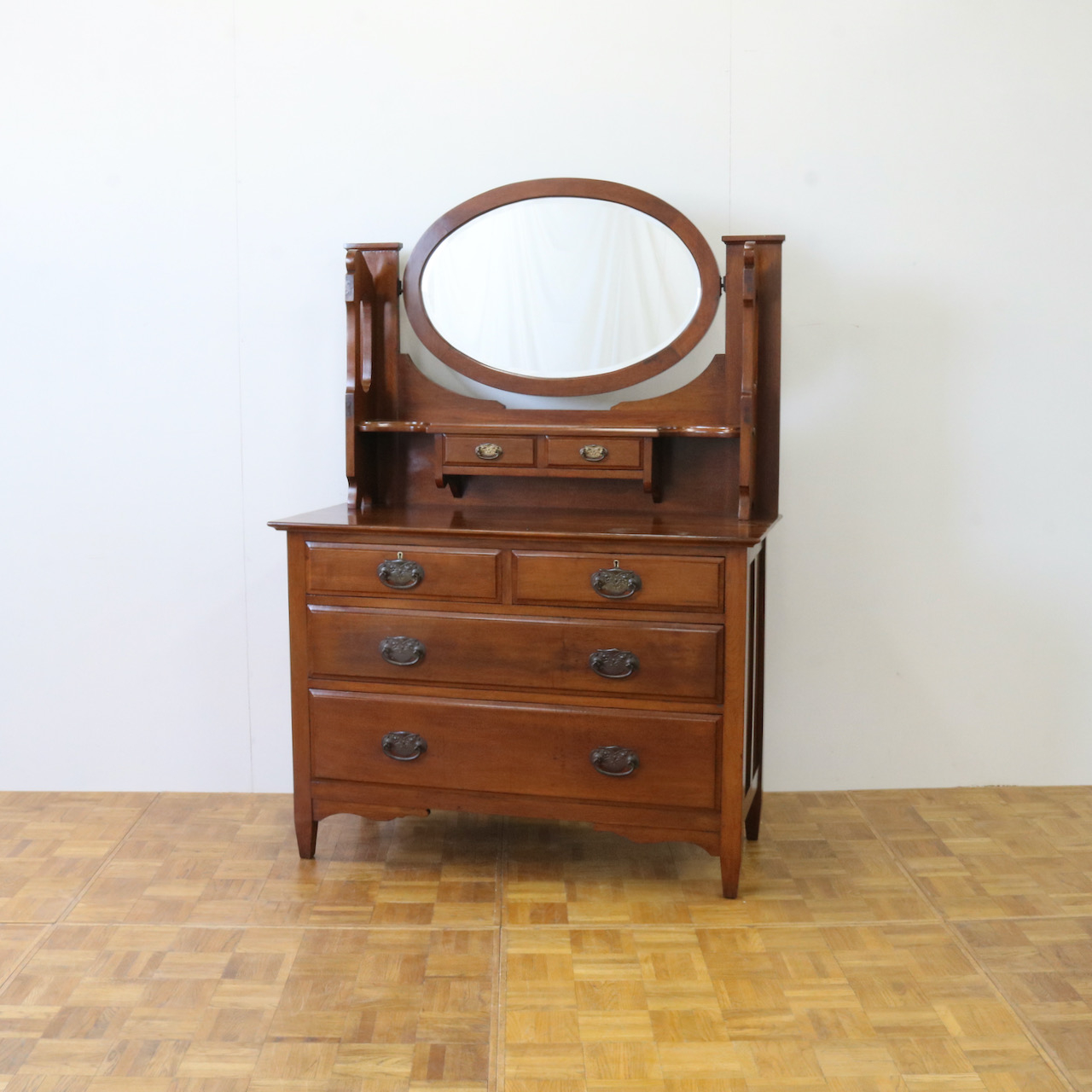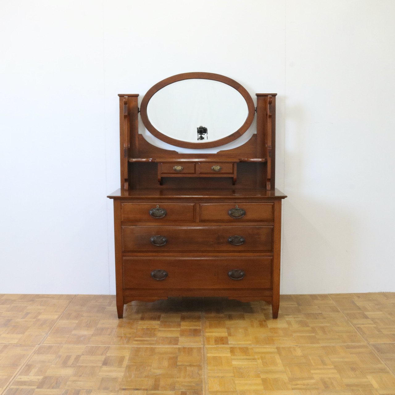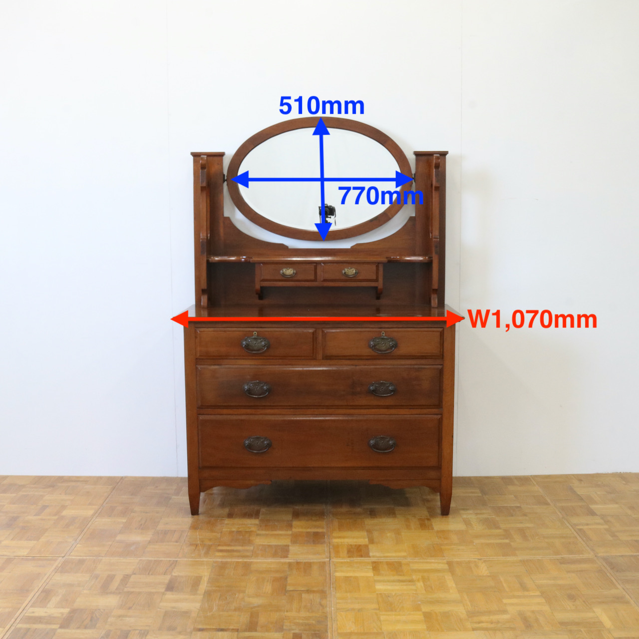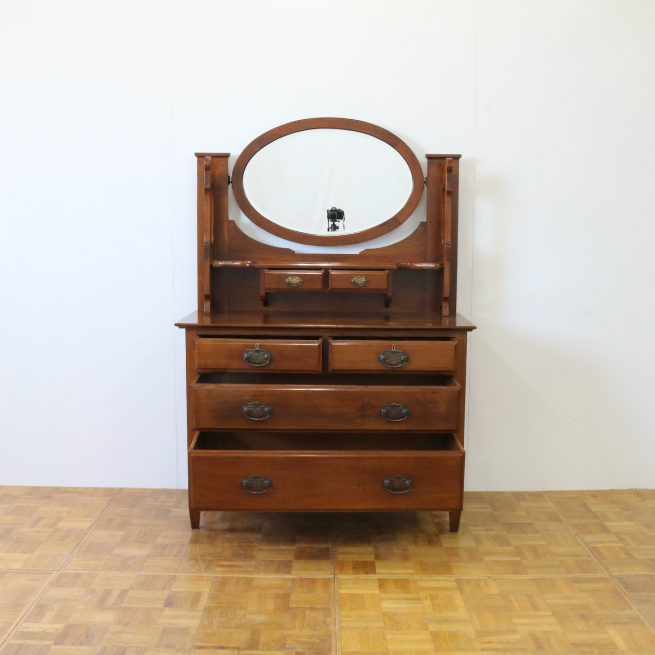 配送料の目安 ▶︎1930年代、ウォールナット材のドレッシングチェスト。楕円形の大きなミラーに、お化粧品やアクセサリー小物などを置いておきやすい棚や小さな引き出しなど機能性に優れた家具です。収納力抜群のチェスト部分も嬉しいですね。