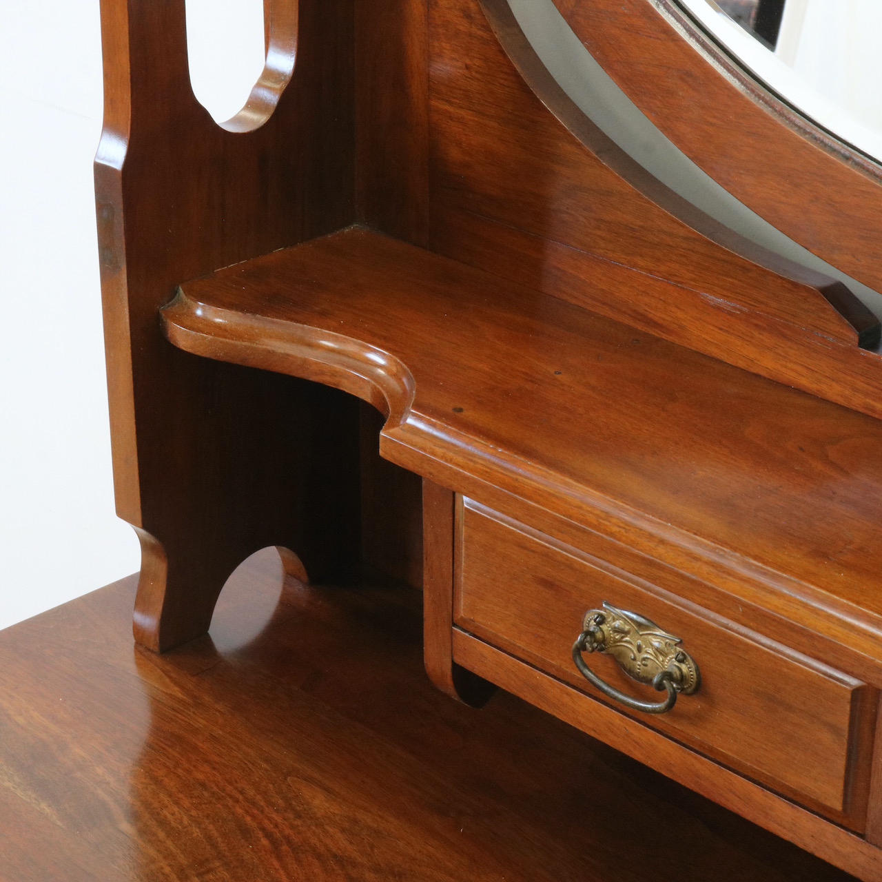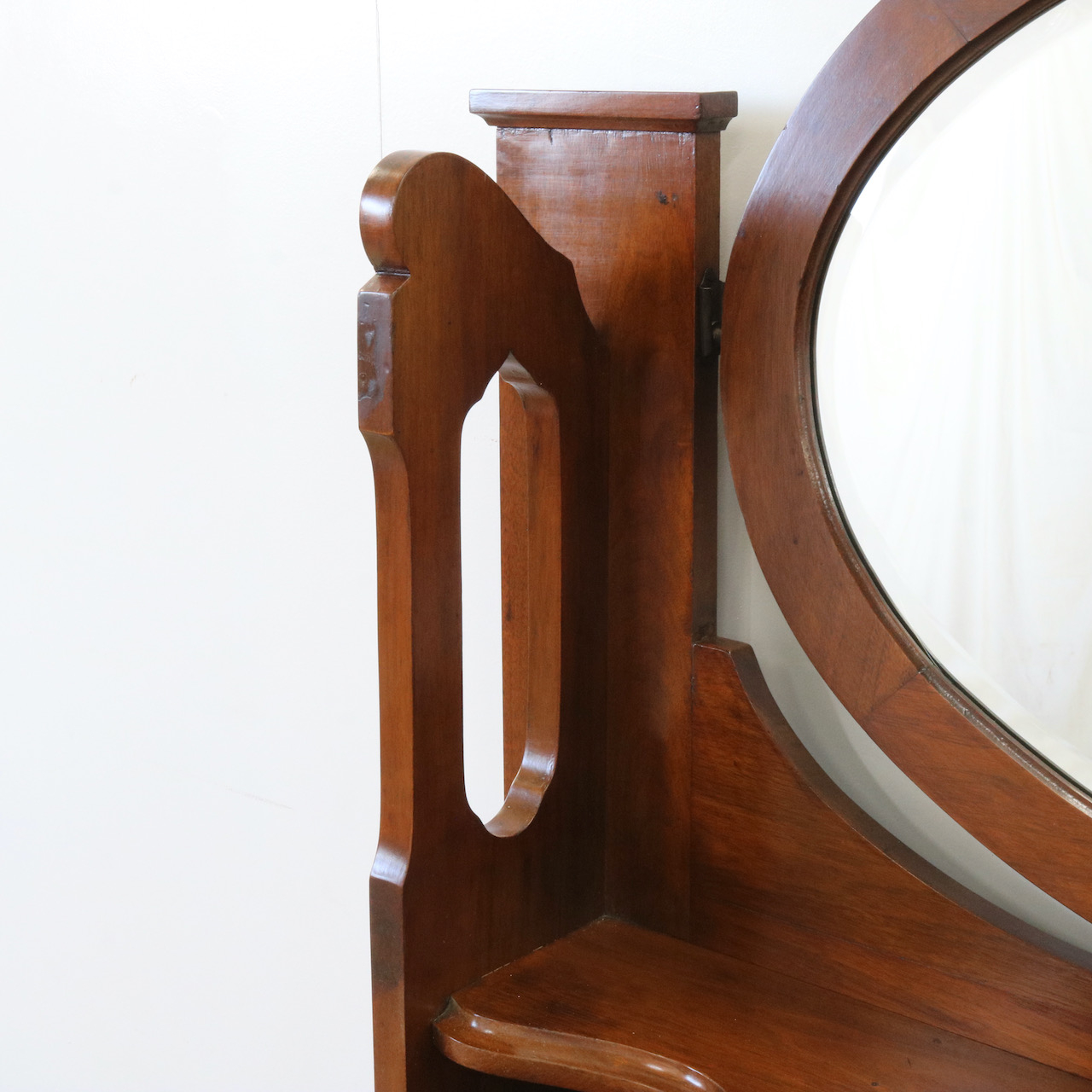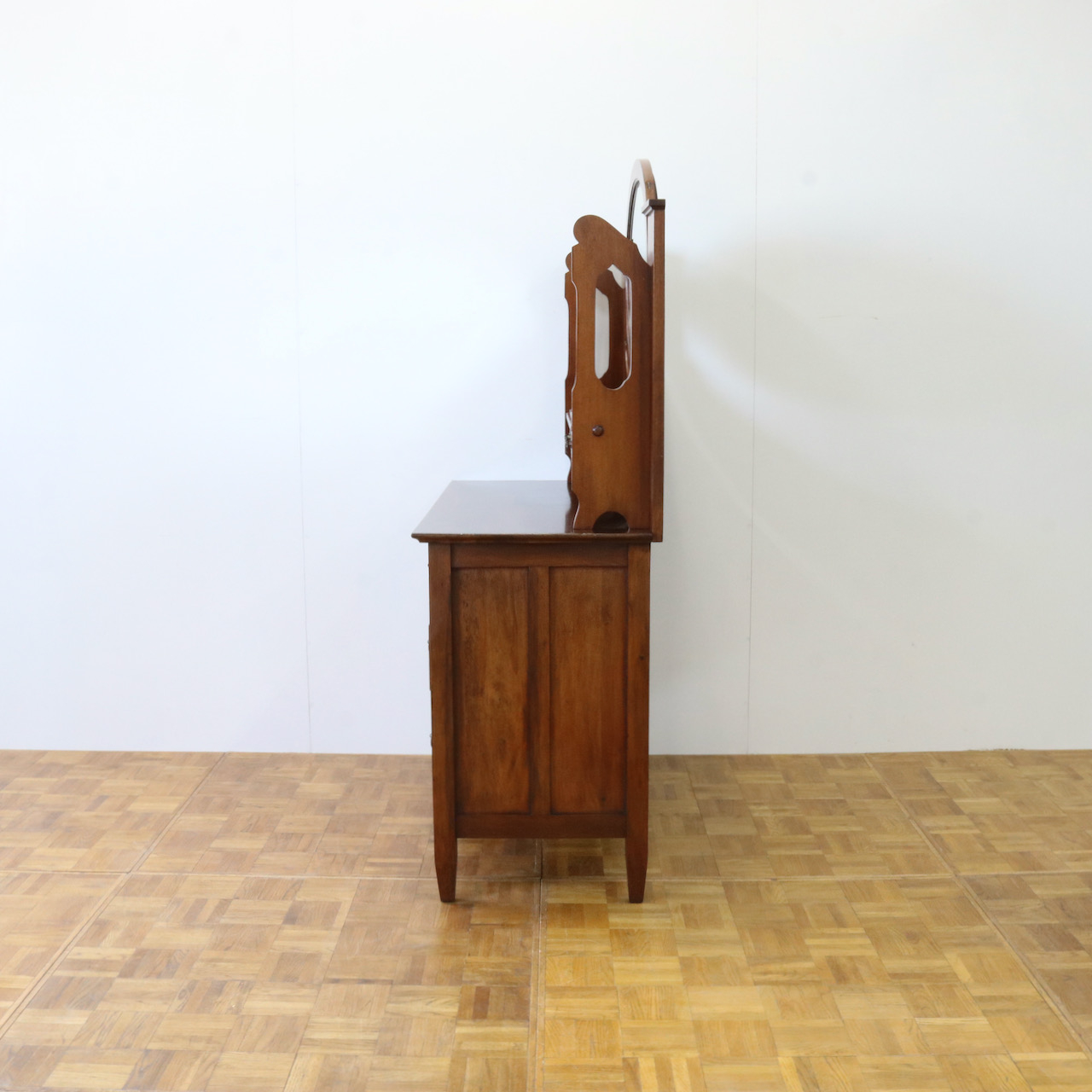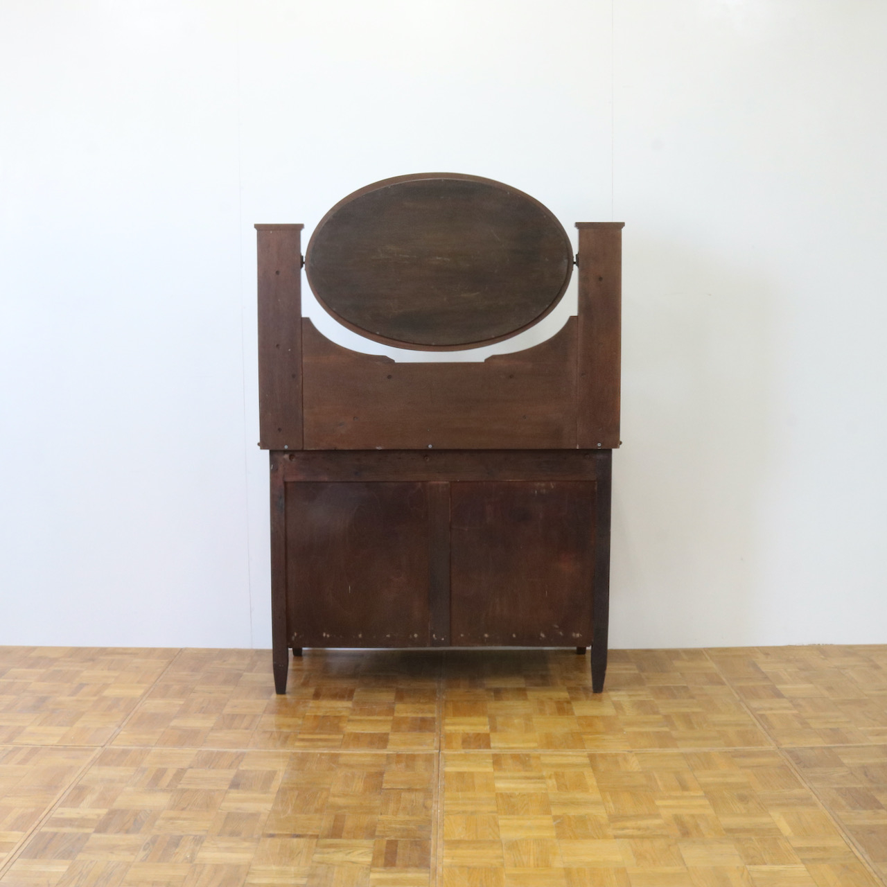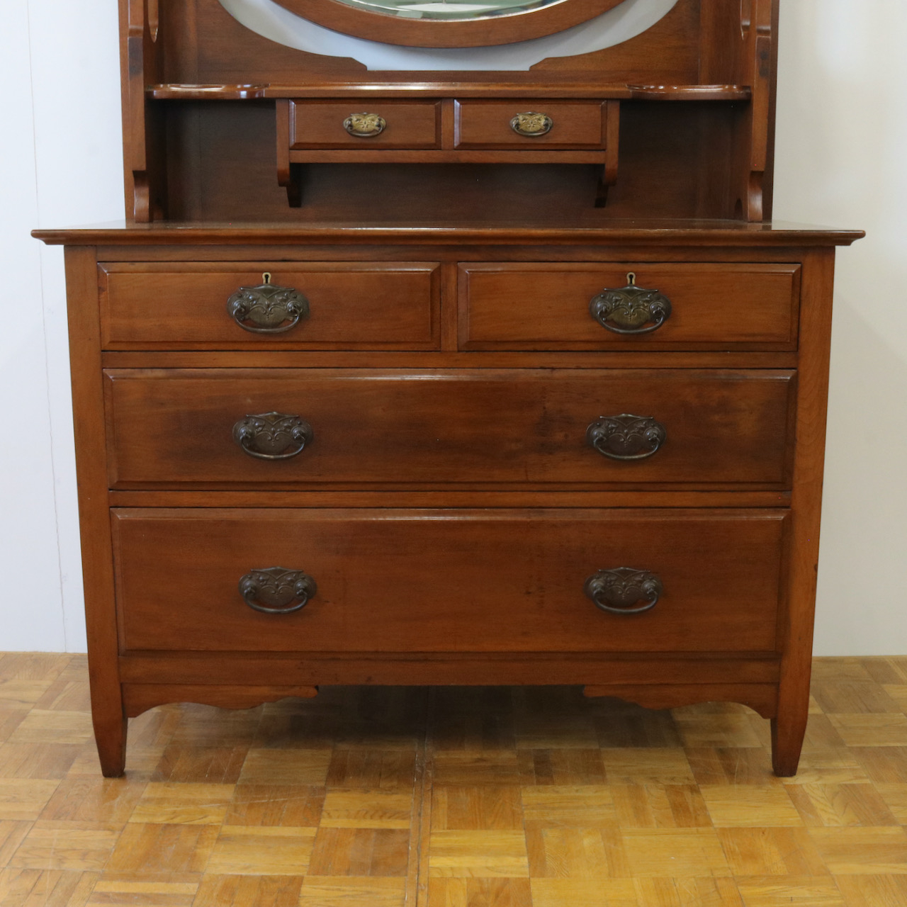 配送料の目安 ▶︎1930年代、ウォールナット材のドレッシングチェスト。楕円形の大きなミラーに、お化粧品やアクセサリー小物などを置いておきやすい棚や小さな引き出しなど機能性に優れた家具です。収納力抜群のチェスト部分も嬉しいですね。