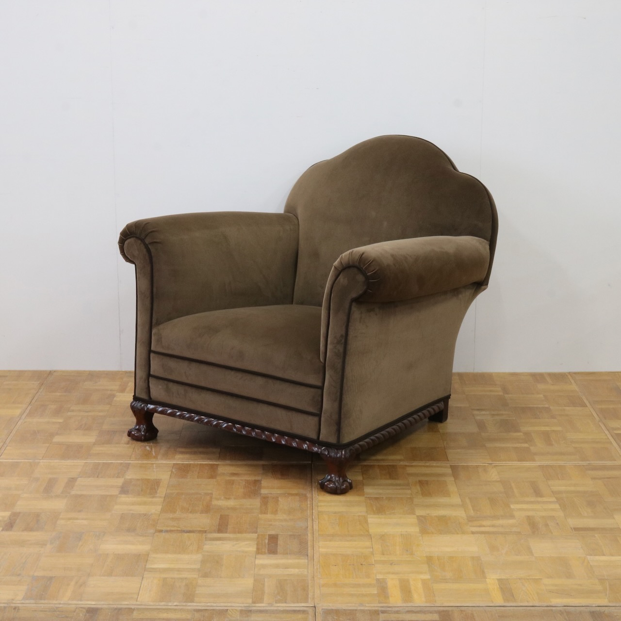 配送料の目安 ▶︎1930年代、マホガニーの1Pソファー。くつろぎの時間をゆったりとした座り心地でお楽しみいただけるフォルムとサイズ感。脚周りはガドルーニングとボール&クロウの彫刻が施され、クラシックなデザインにも惹かれます。