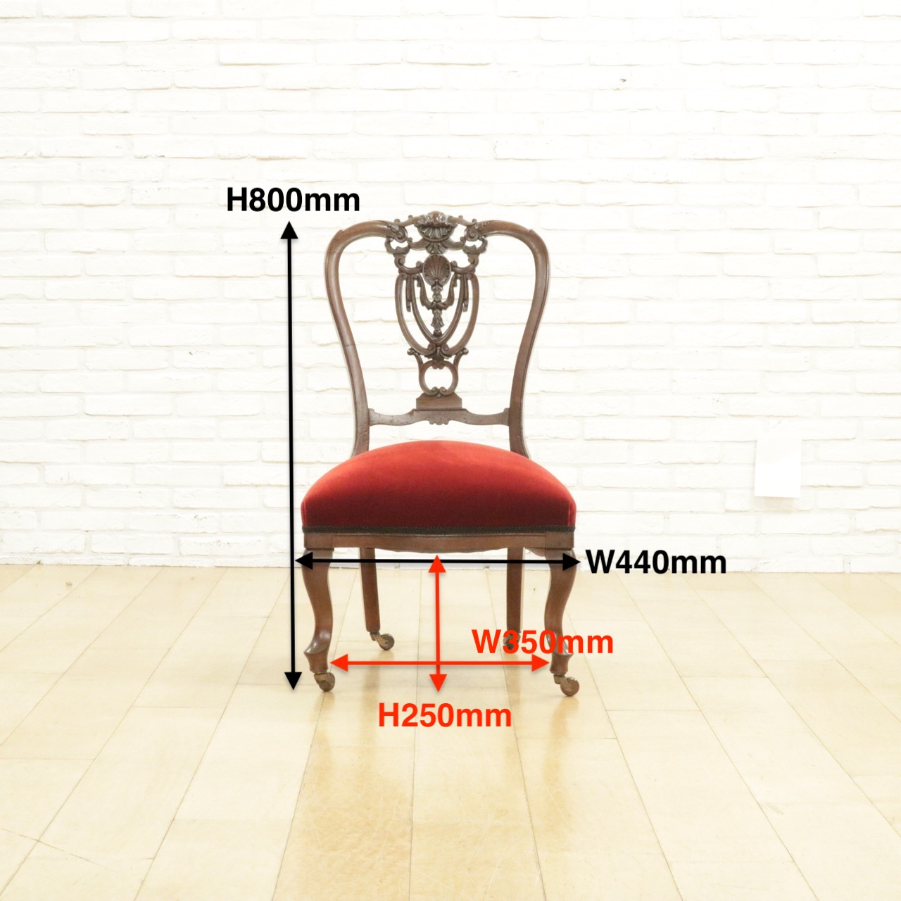 アカンサスやスワッグなど、アンティークらしい意匠が施された透かし彫りの背もたれが上品で目を引きます。