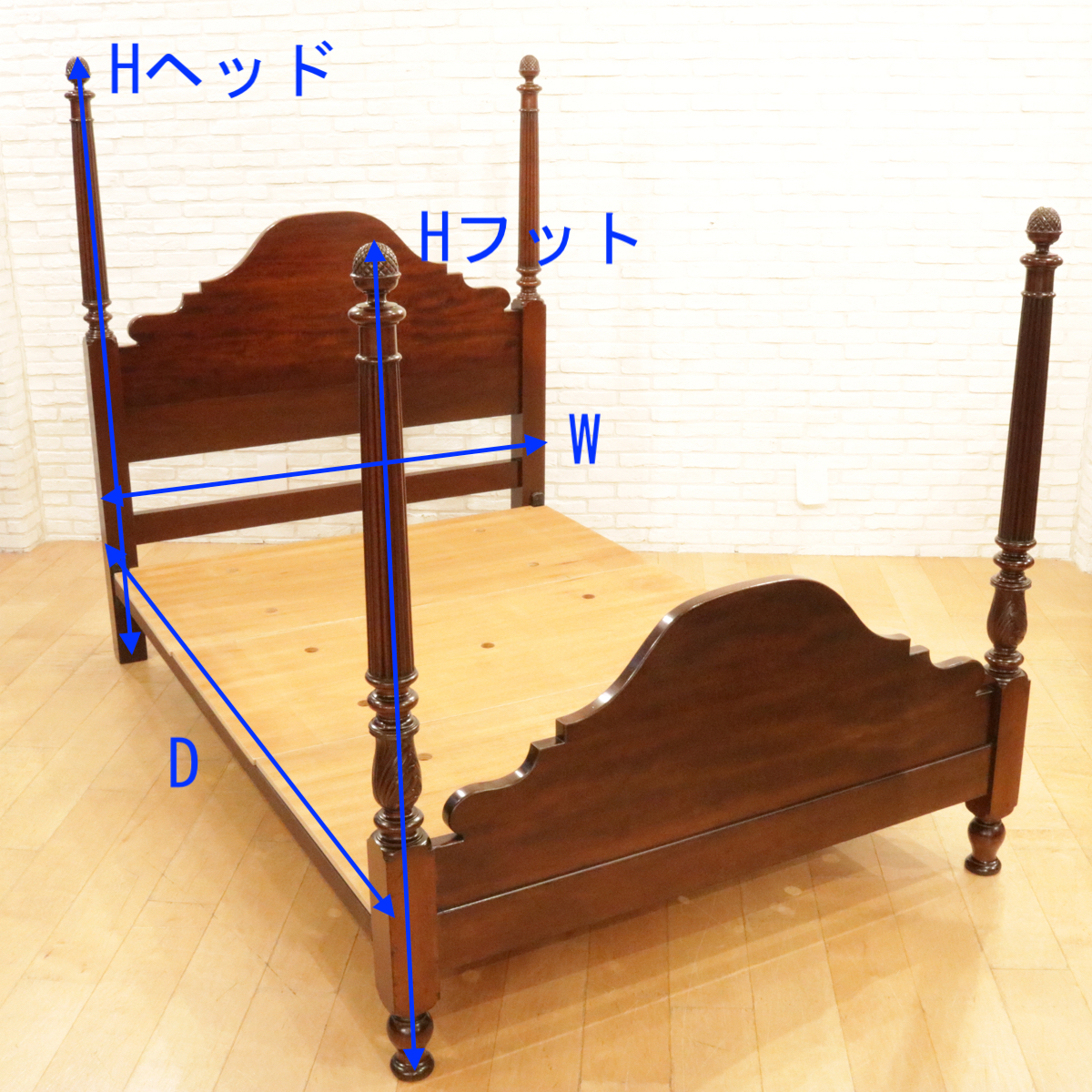 マホガニーのベッド。4つのポストがクラシックな雰囲気を高め、上品なマホガニーの風合いにも惹かれます。ダブルサイズでゆったりとした寝心地です。
