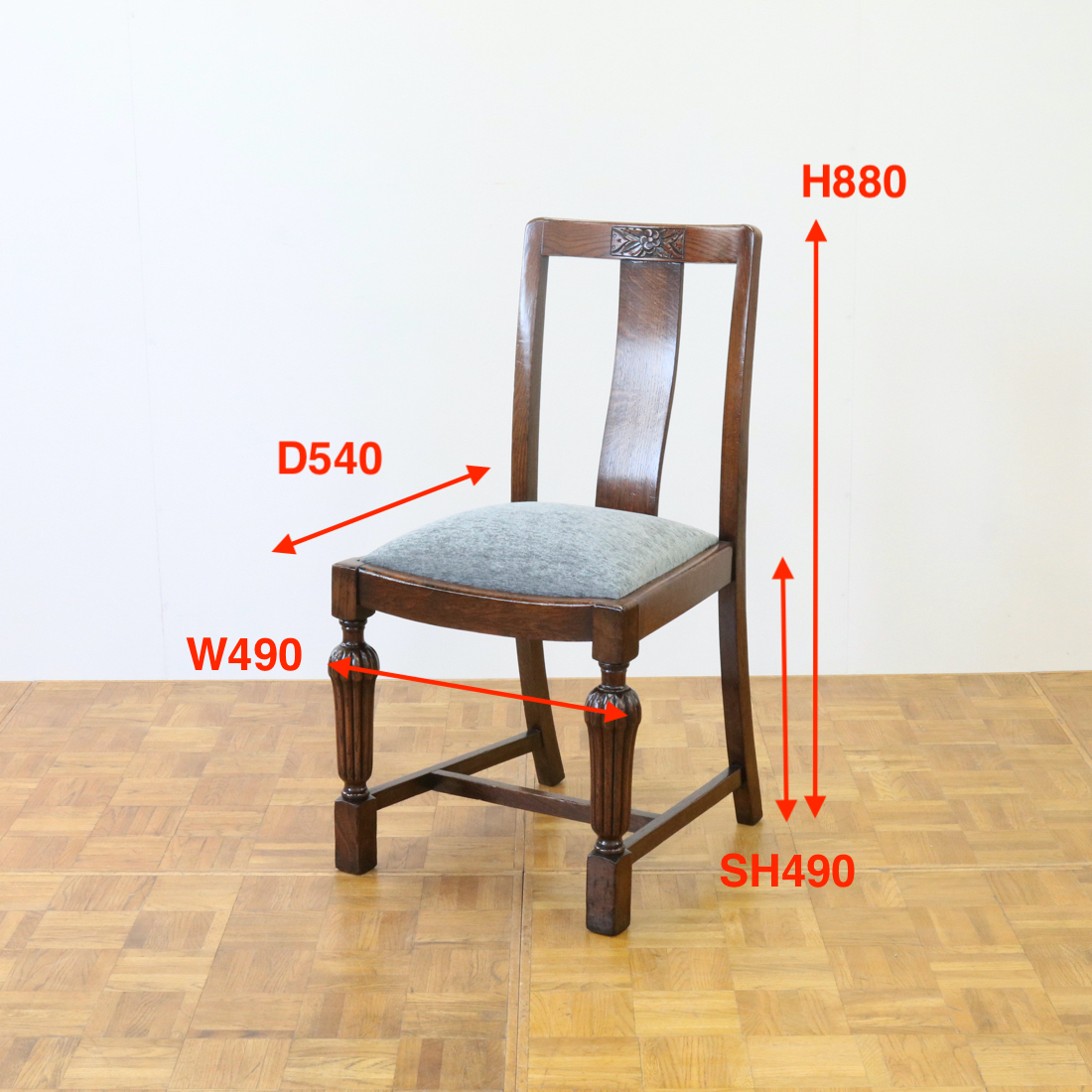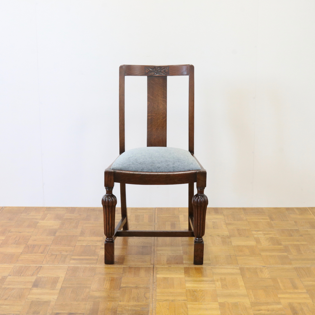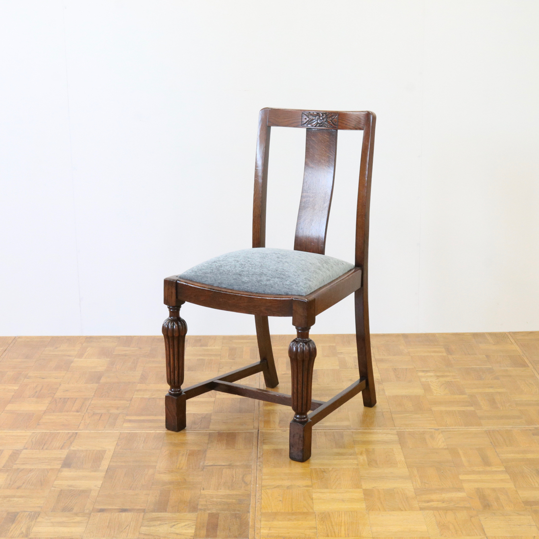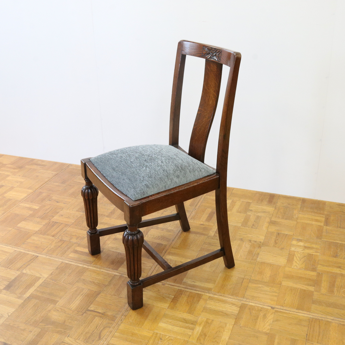 配送料の目安 ▶︎1930年代のオークチェアー。背もたれのお花の彫刻装飾や、縦溝が特徴的な前脚などデザインされた意匠が魅力的なチェアーです。ダイニング用にいかがでしょうか。