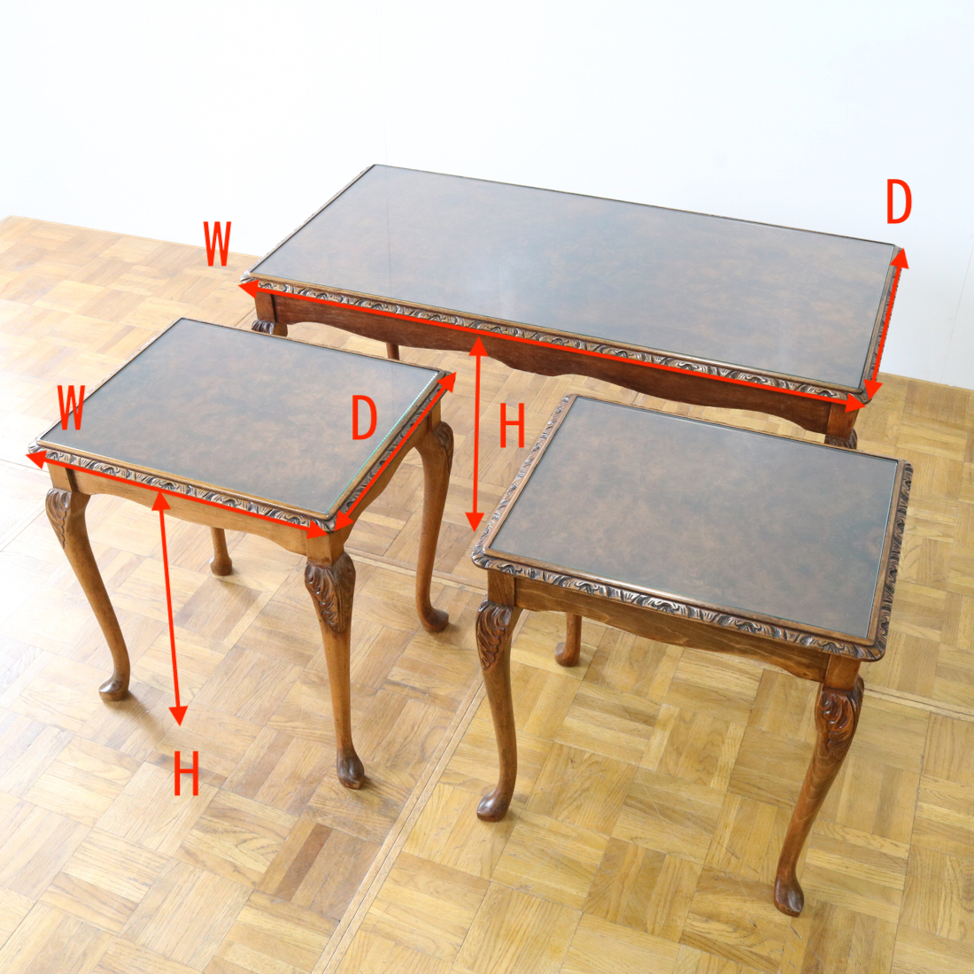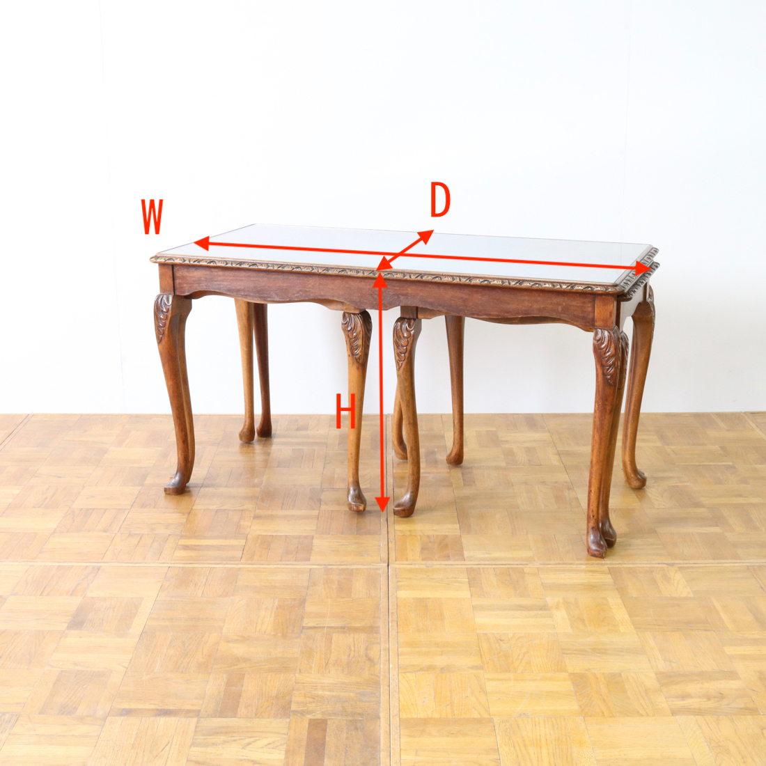 配送料の目安 ▶︎ウォールナット材のネストテーブル。細長いテーブルの中に、小さなテーブルが2つ入れ子になっています。ガラス天板なので飲み物を置いたりお花を飾ったりする際にも使いやすいのが嬉しいポイントです。